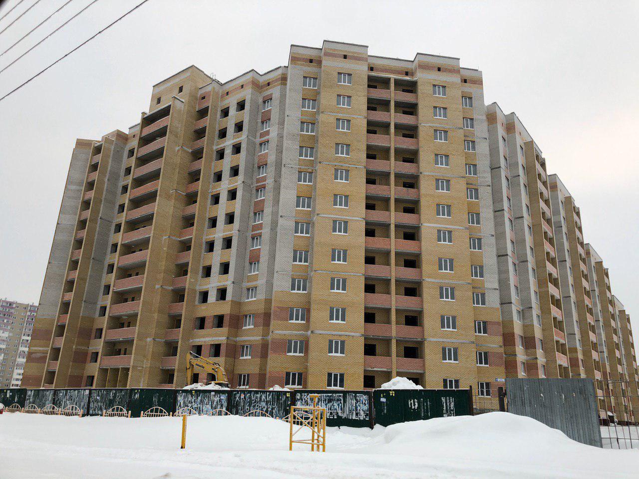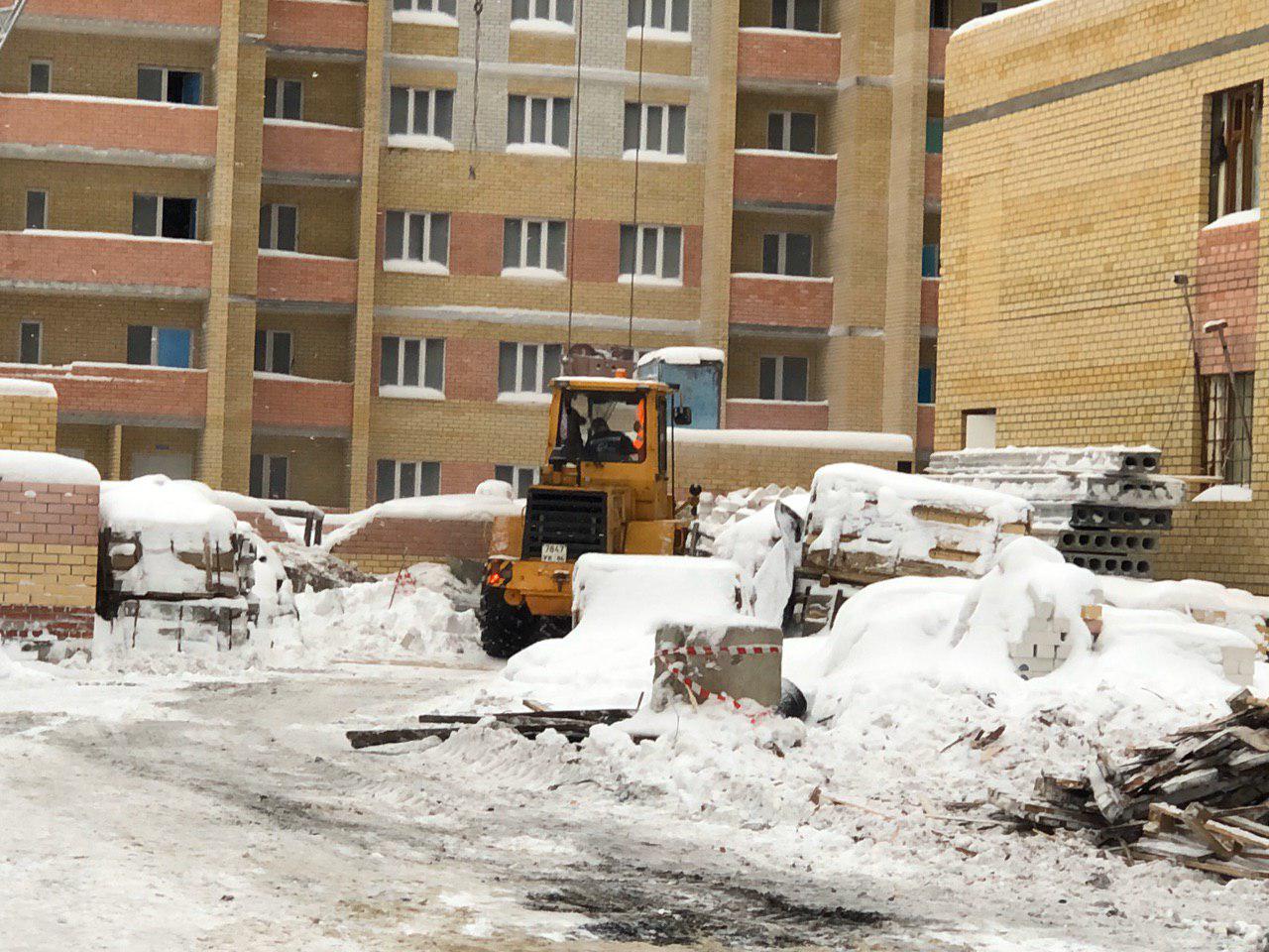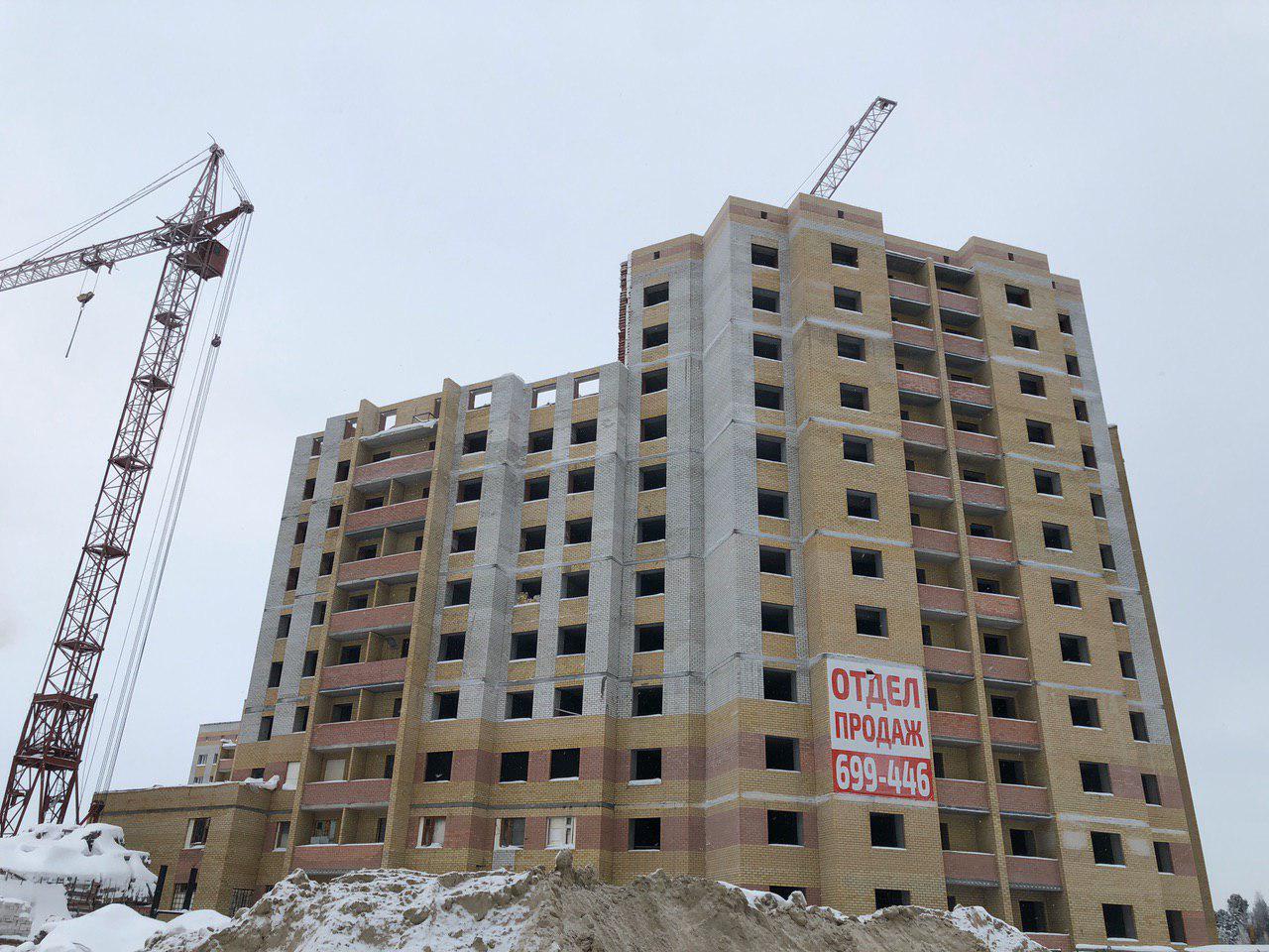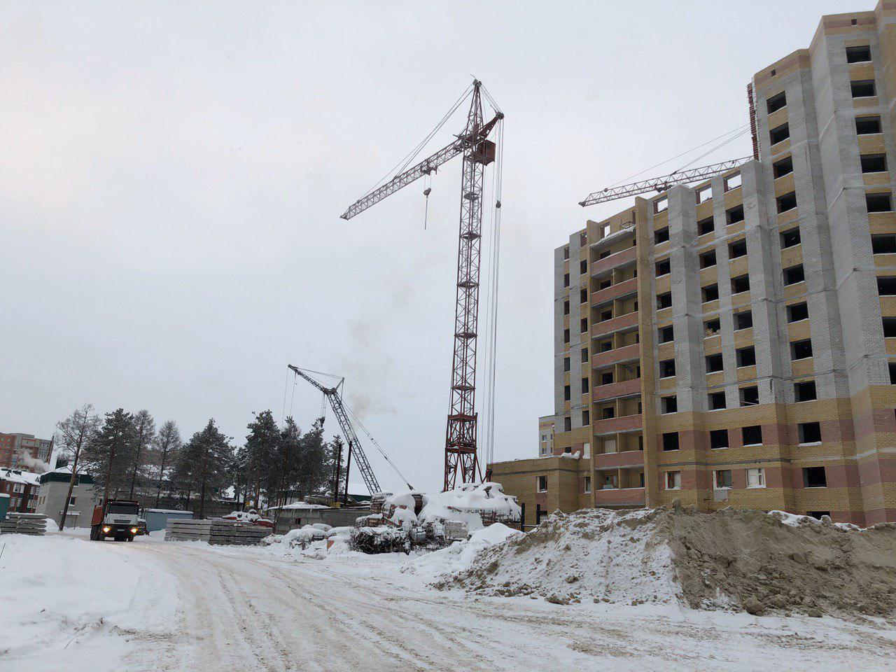 Ведется кладка ограждающих конструкций 10-го этажа 8 секции, а также 12 этажа 7 секции многоквартирного жилого дома. Работают краны, автотехника.