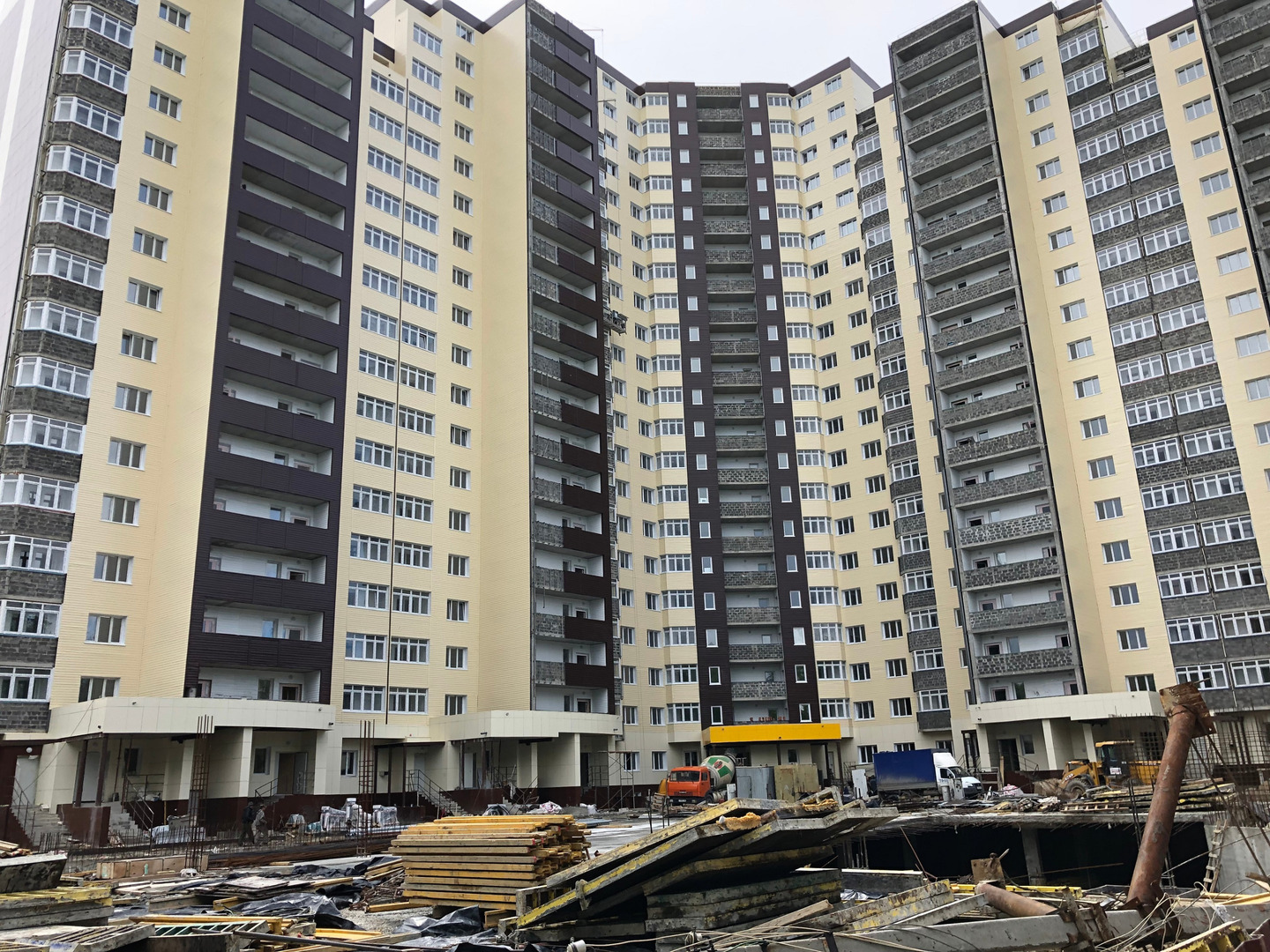 Рабочие в количестве 6 человек ведут отделку фасада, облицовку балконов общего пользования (на люльке). Производятся строительные работы по заливке опалубки паркинга бетоном.