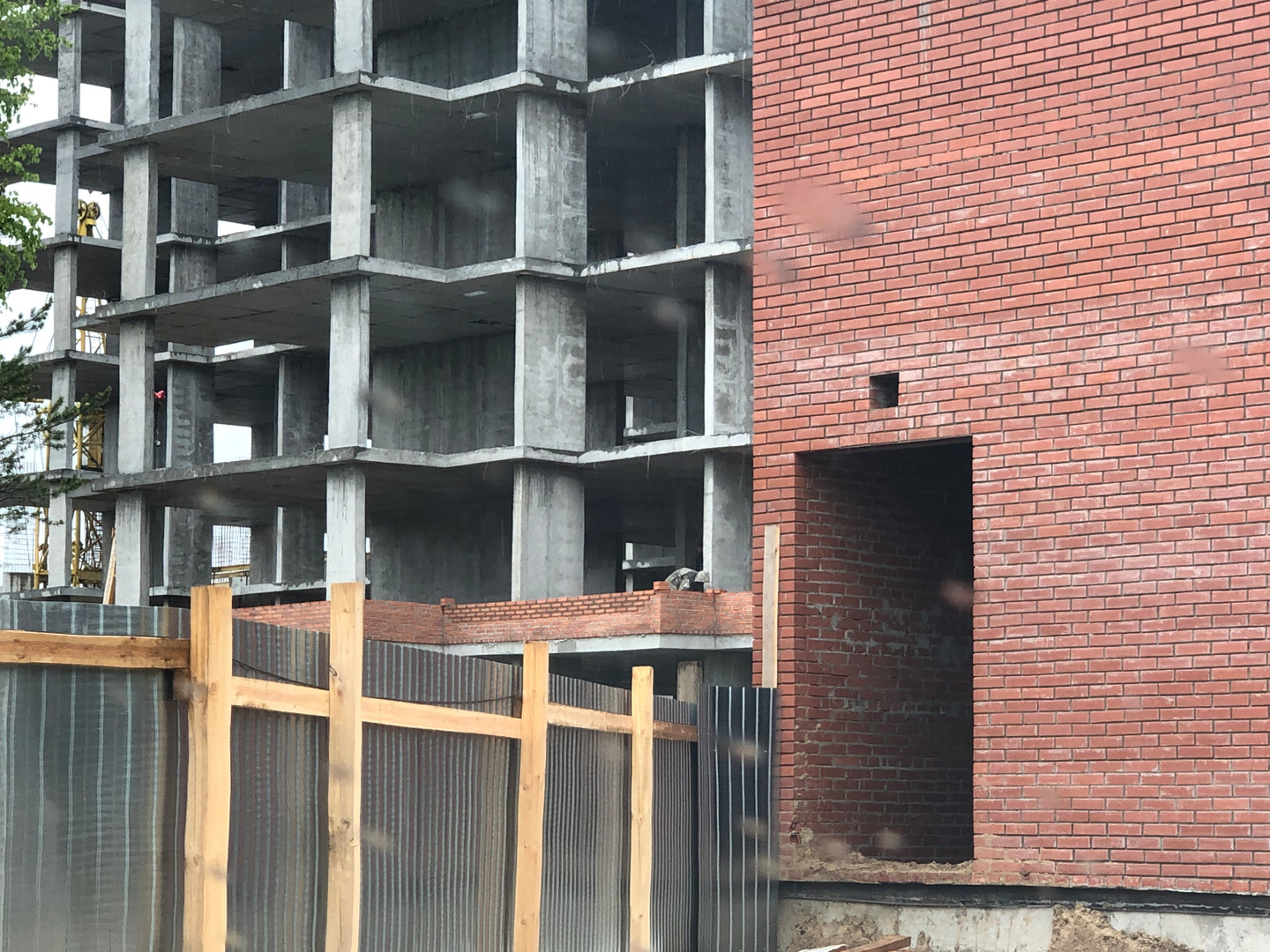 Рабочие в количестве 4 -6 человек ведут кладку ограждающей конструкции 2 этажа из кирпича. Работает кран.