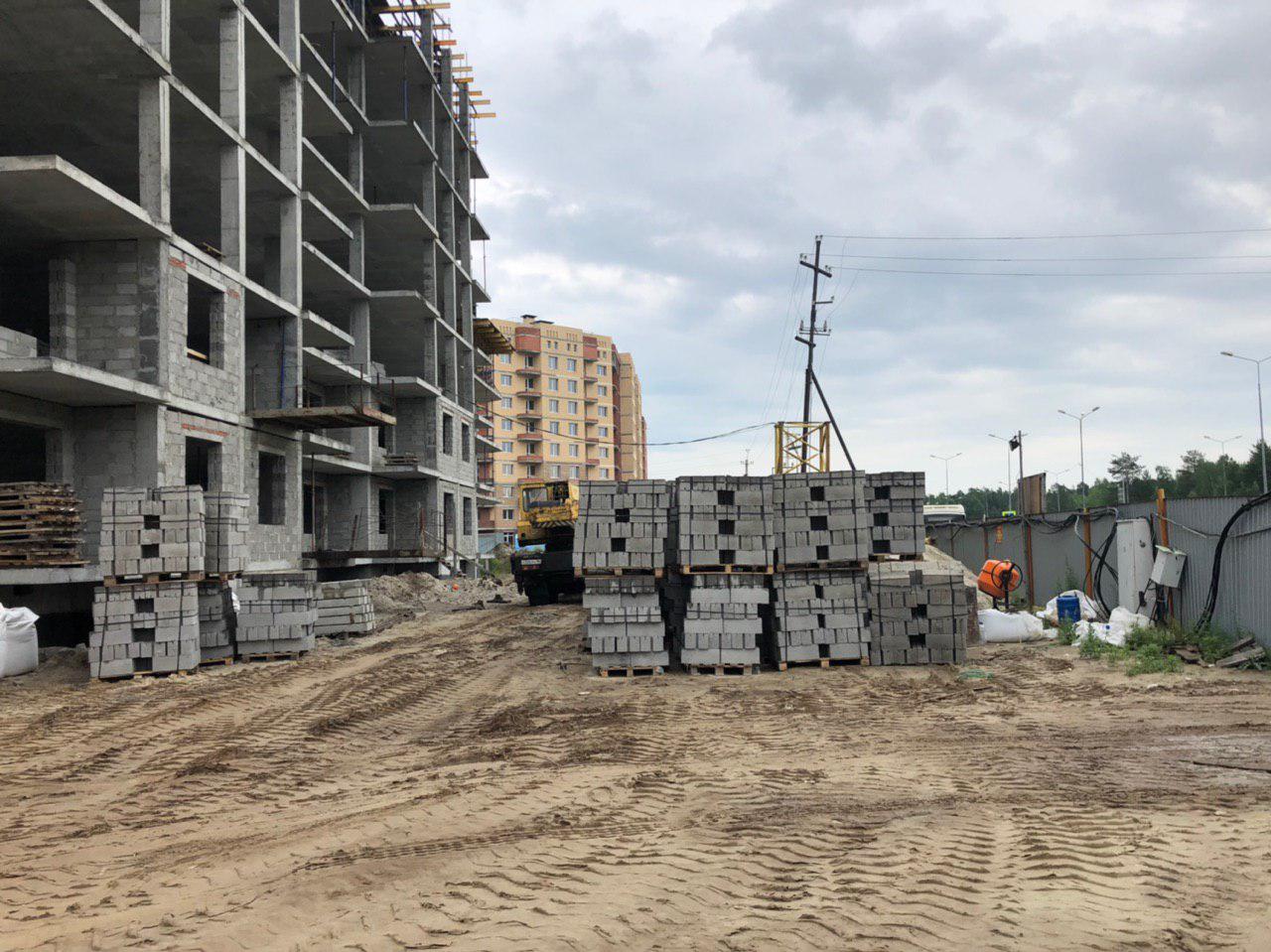 Проводится укладка ограждающих конструкций первого и второго этажа силами 2-4 человек, работает автокран.