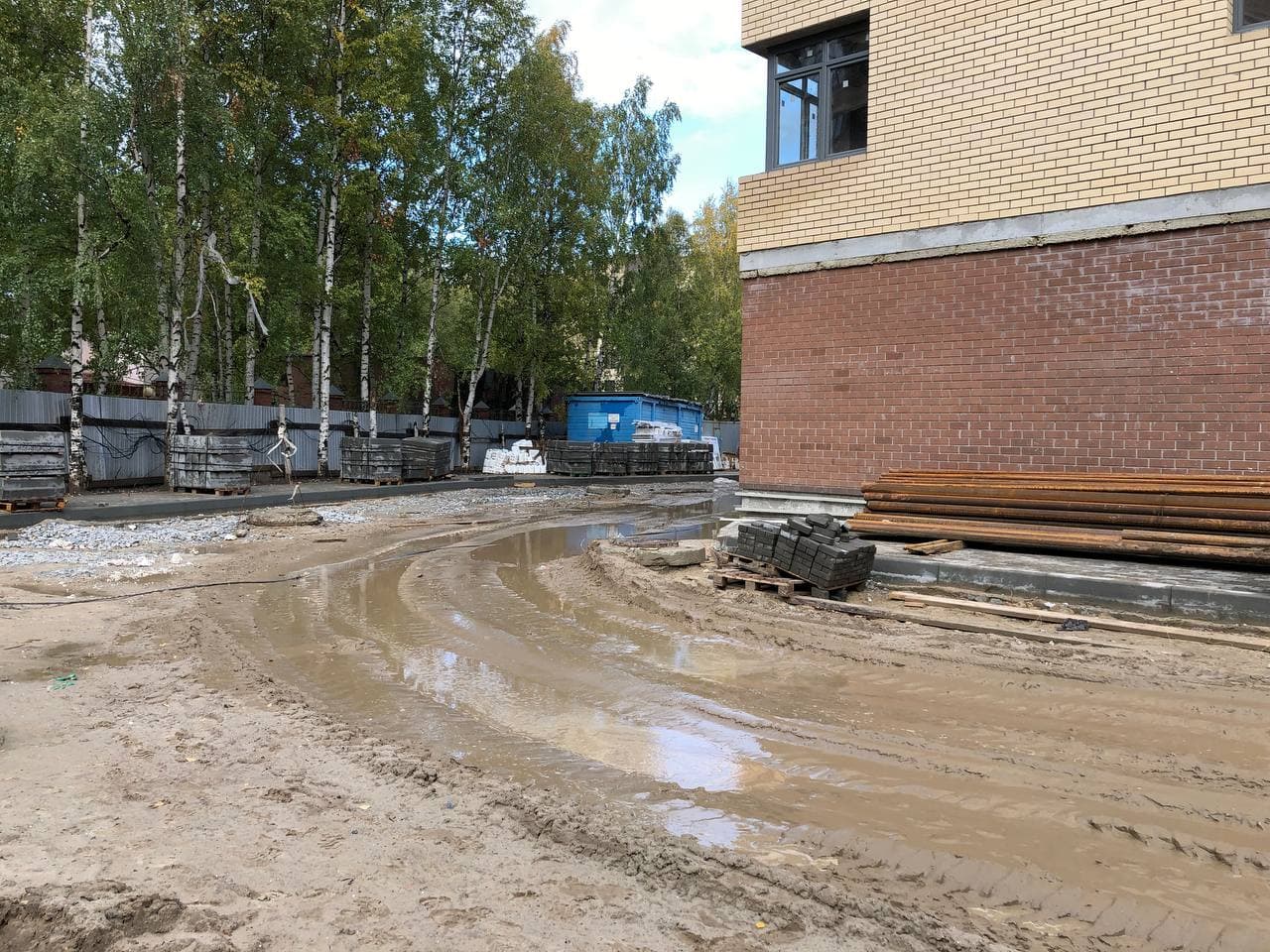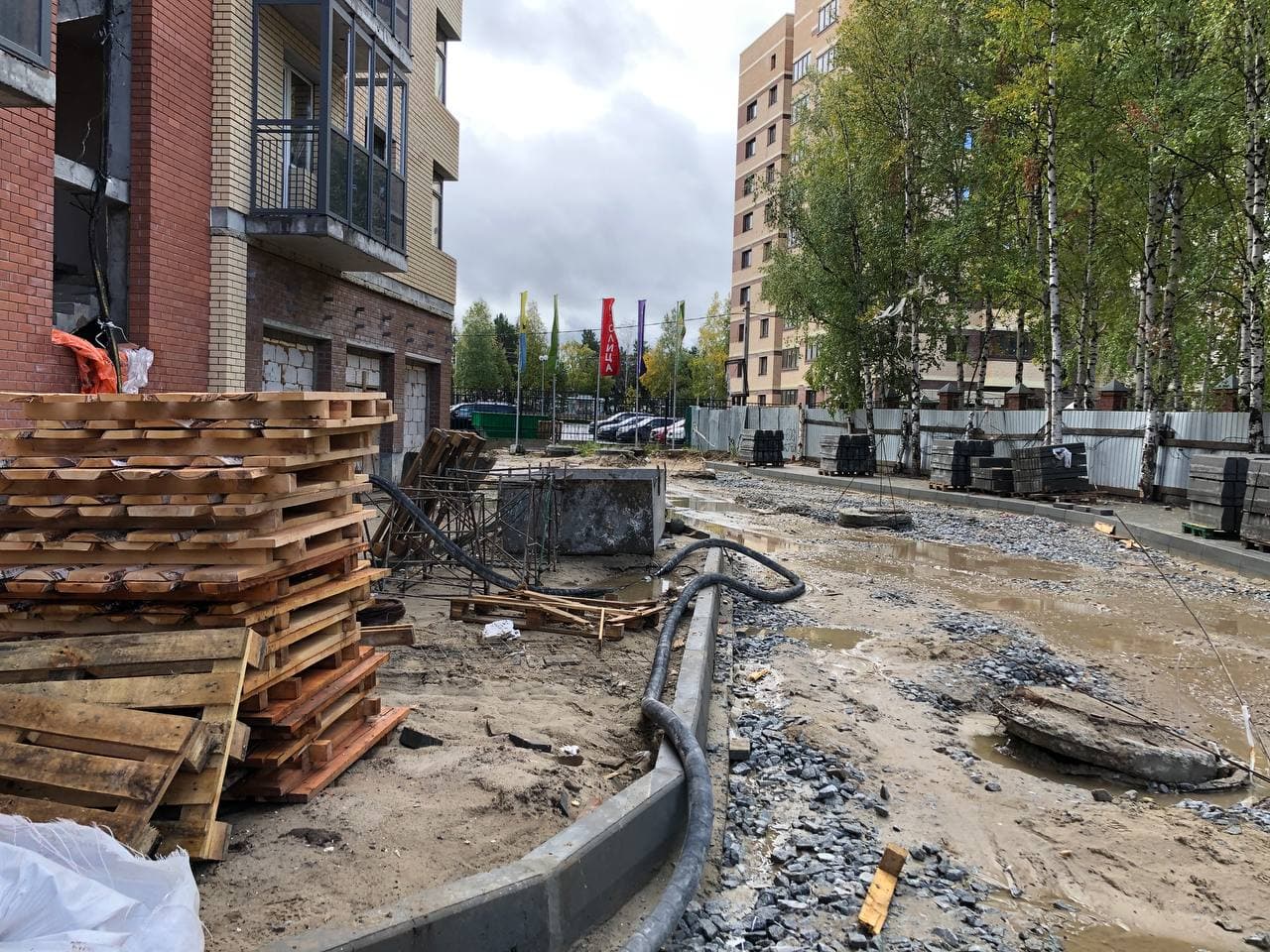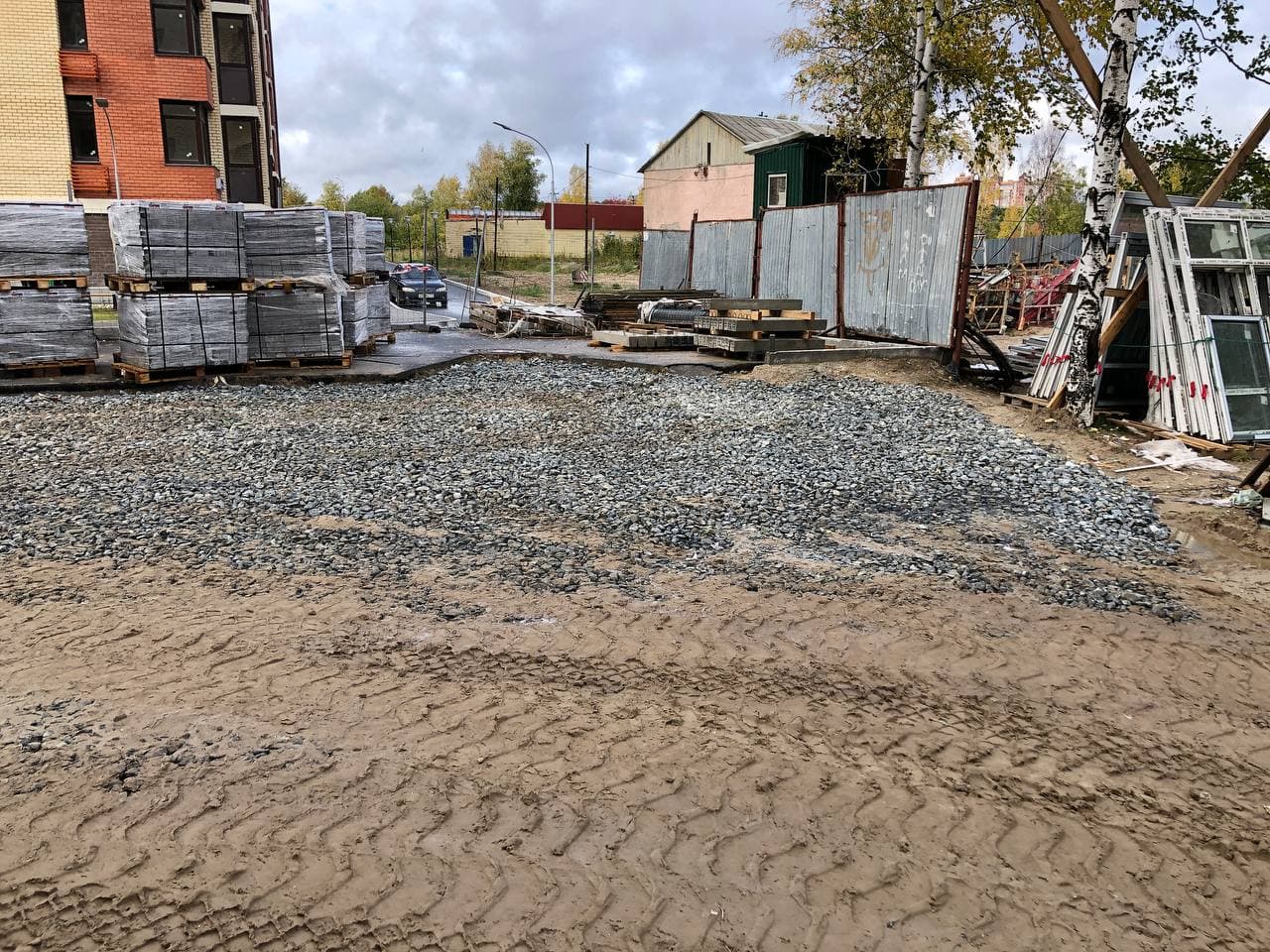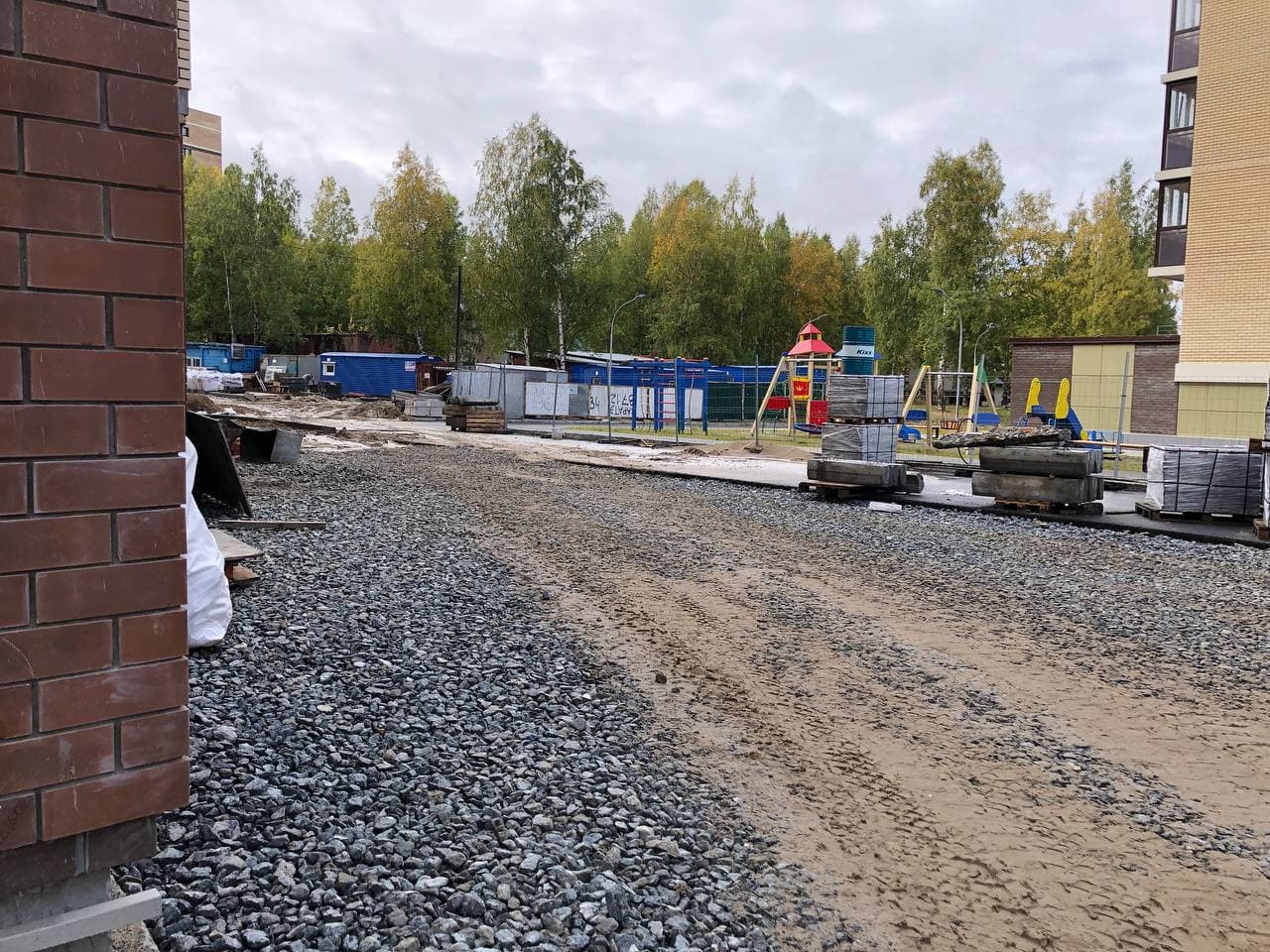 Выполняются работы по благоустройству территории, кладка тротуарной плитки, подготовка под асфальтирование проездов.