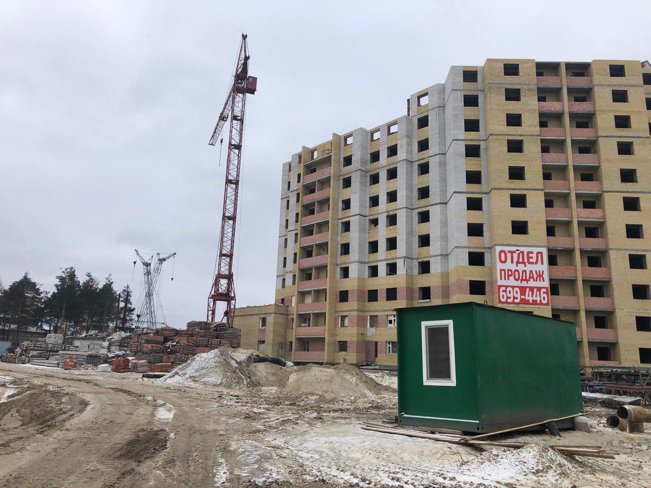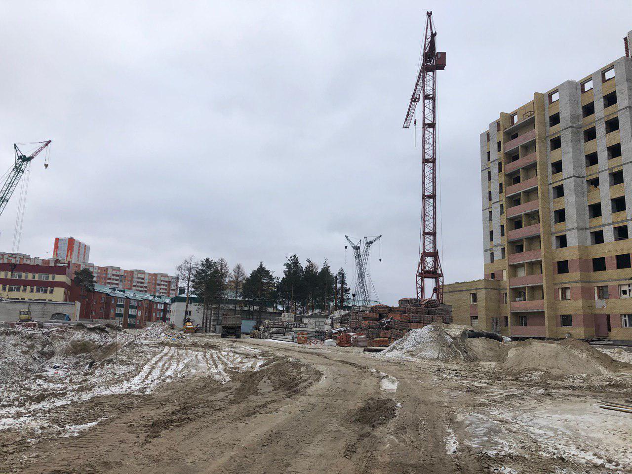Ведется кладка ограждающих конструкций 9-го этажа секции 8 многоквартирного жилого дома и перегородок. Ведутся работы на кровле. Работают 2 кран, бульдозер, самосвал.