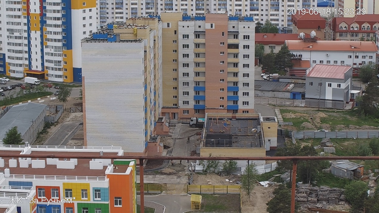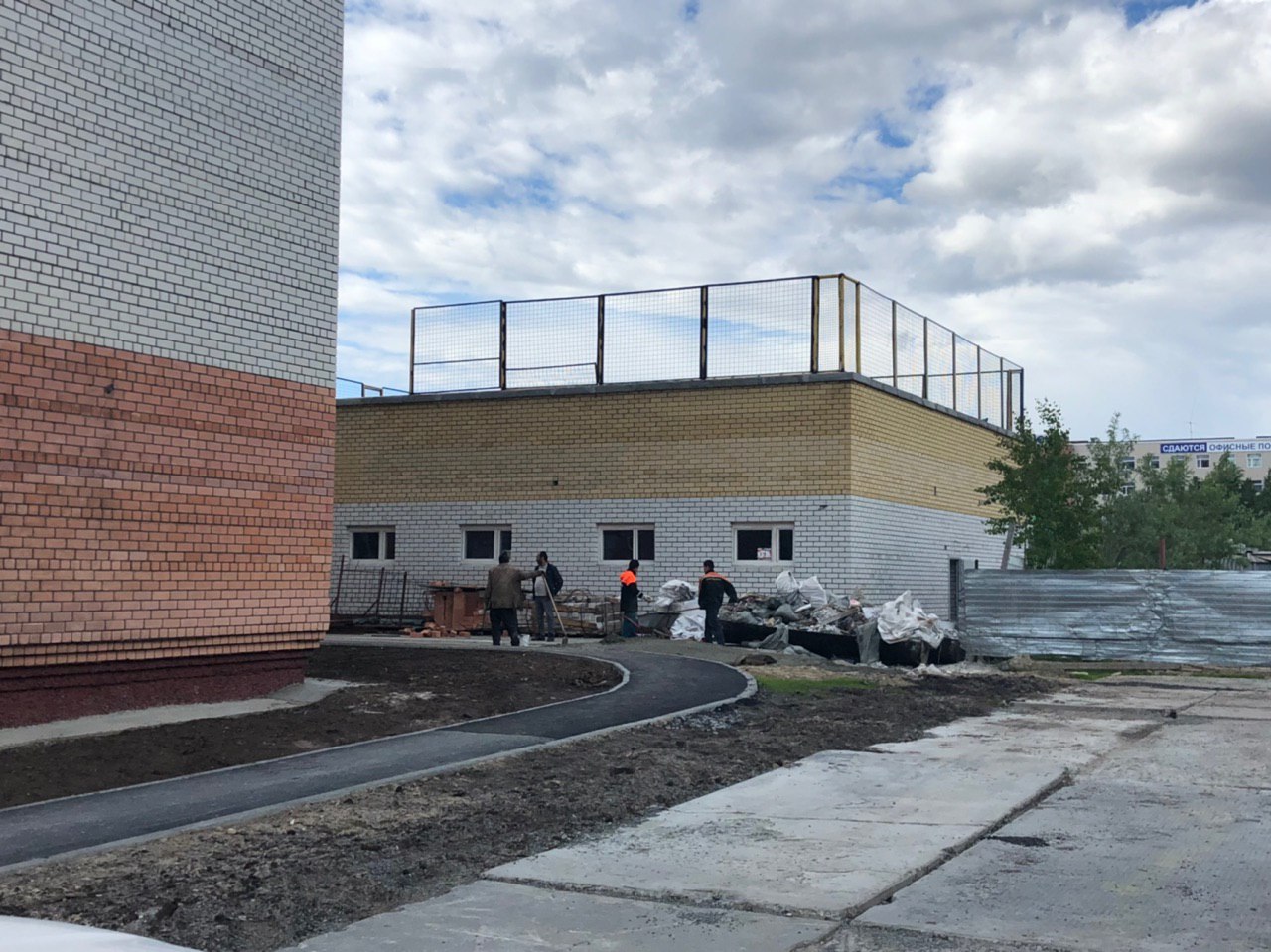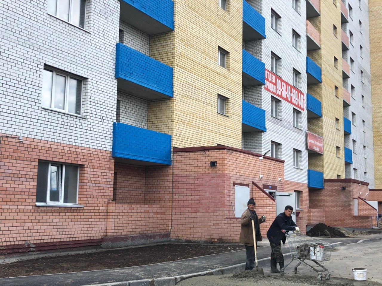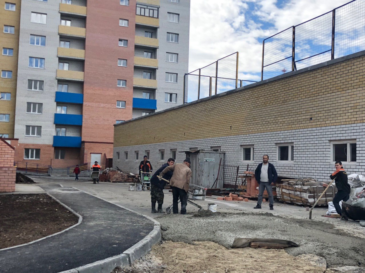 Рабочие в количестве 7 человек ведут благоустройство территории, вывоз строительного мусора. Внутри подъездов производятся отделочные работы (побелка, штукатурка) силами двух рабочих.