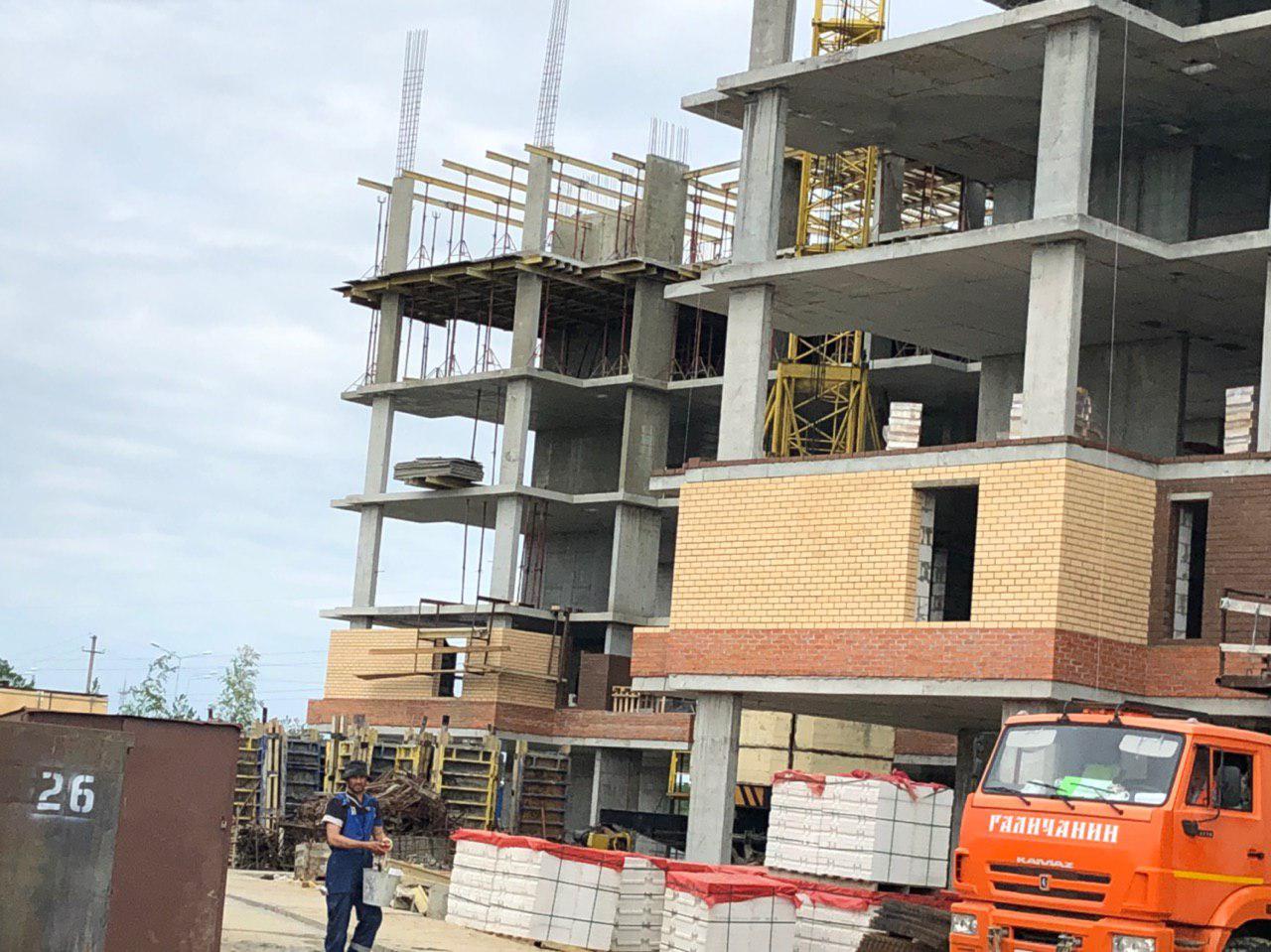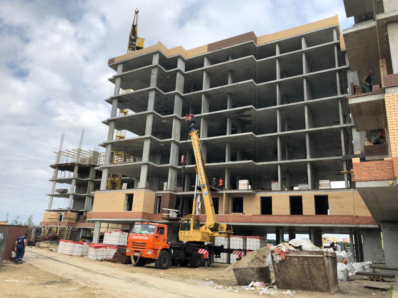 Каменщики в количестве 5-7 человек ведут кладку ограждающей конструкции 2 этажа из кирпича. Работает кран и автокран. Завозятся строительные материалы. Ведется подъем строительного материала.