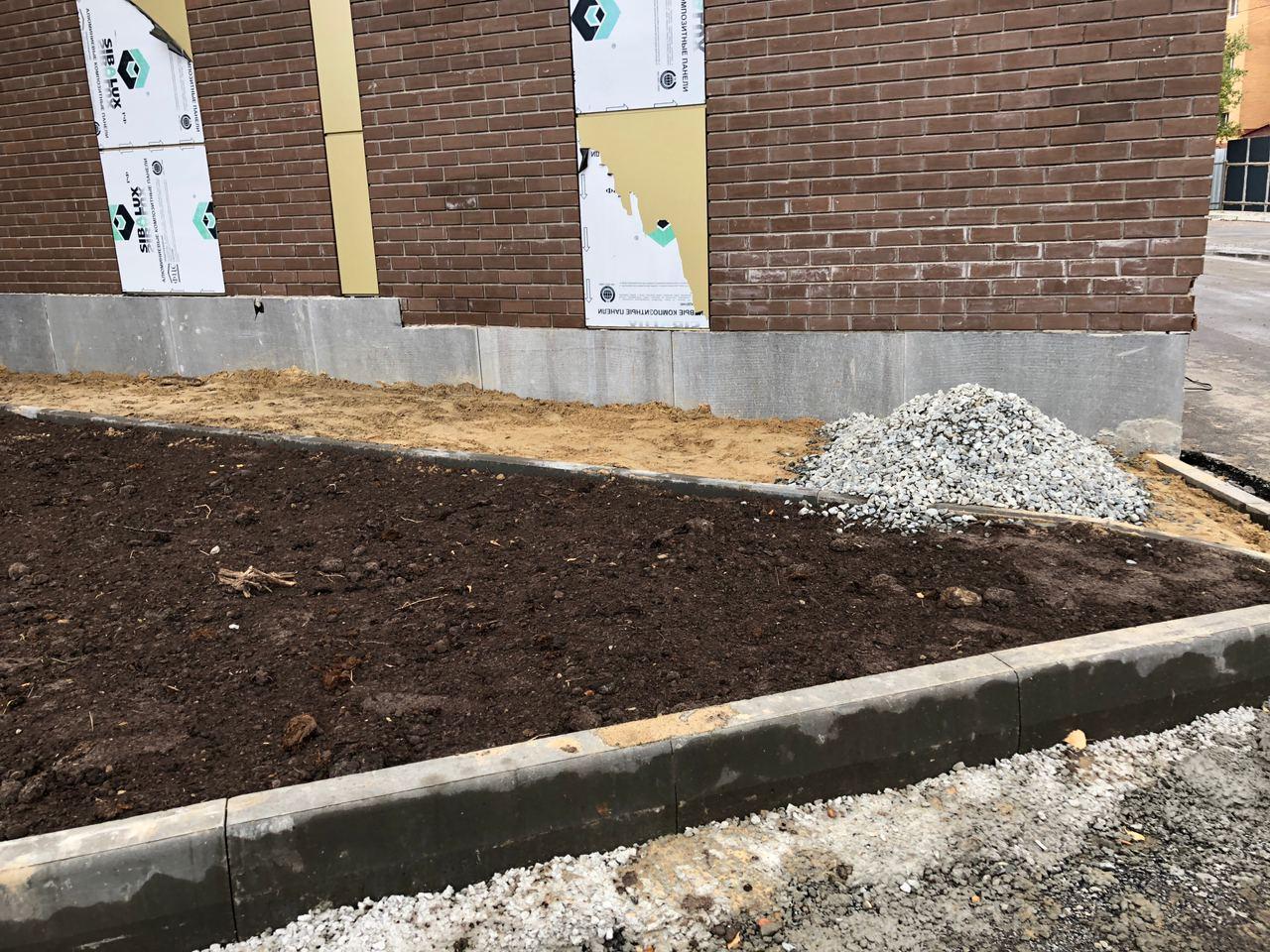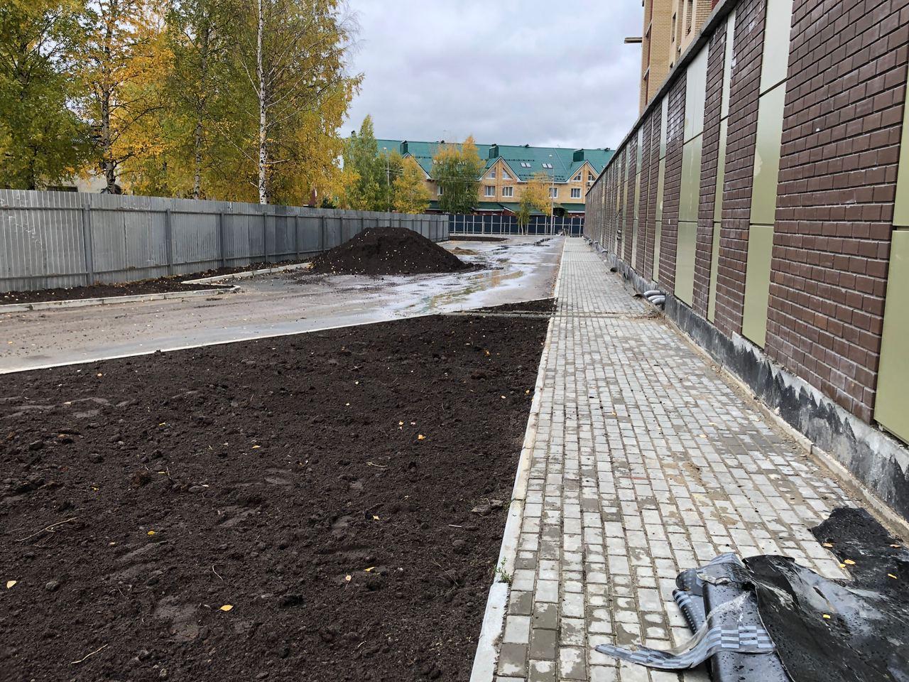 -для устройства газонов со стороны двора, установлен и забетонирован бордюр