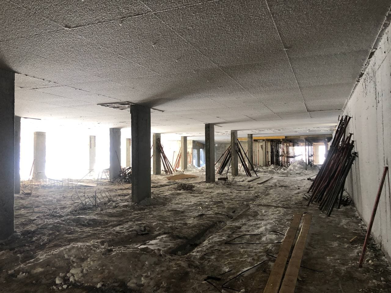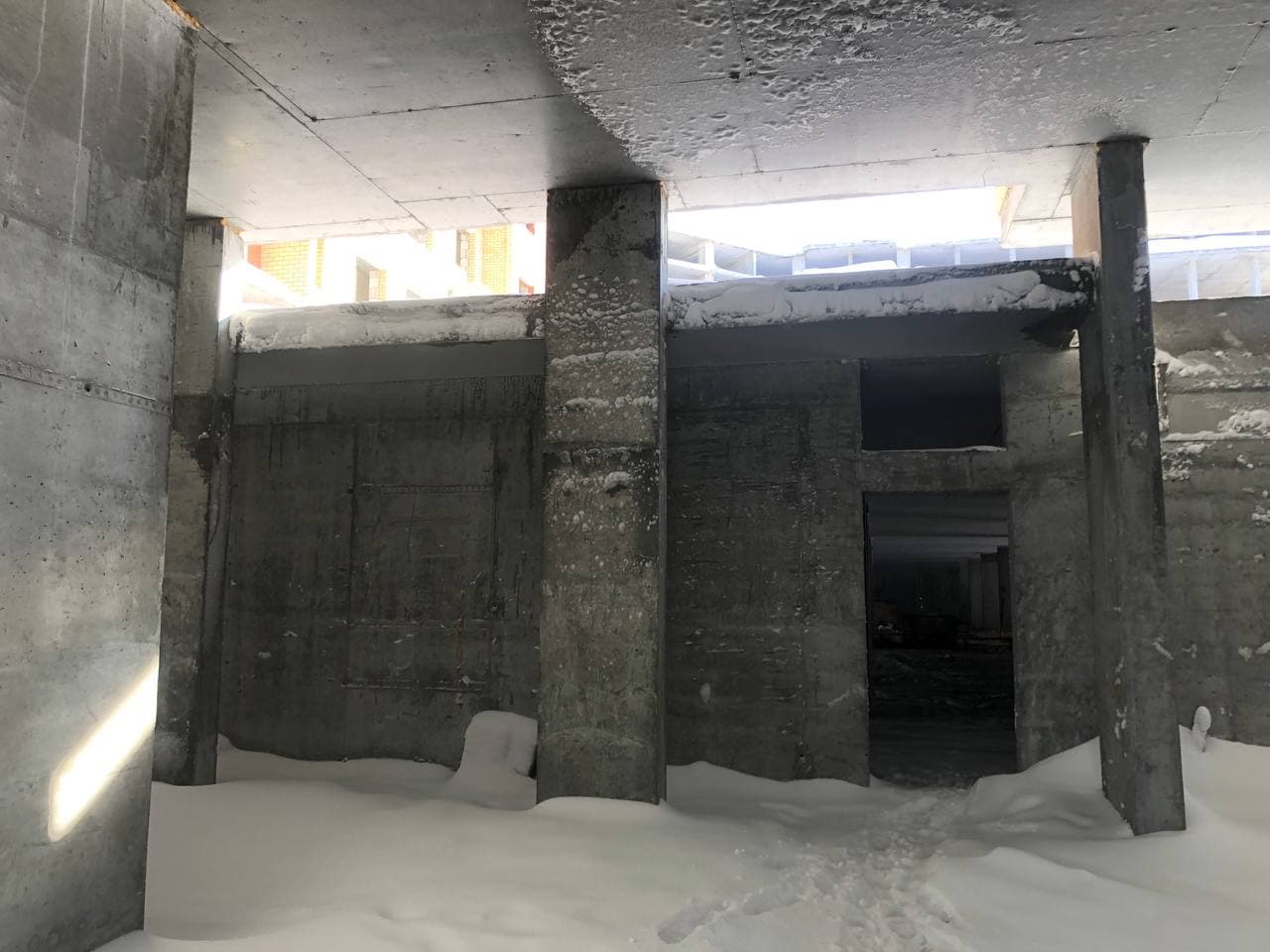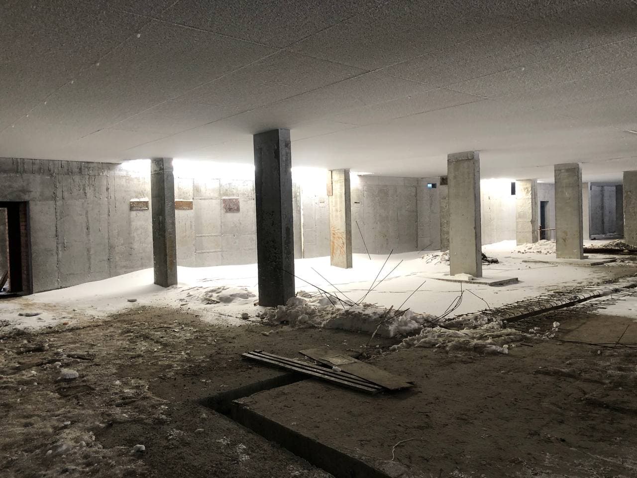 Ведутся работы по устройству монолитной плиты перекрытия паркинга. Подготовка и монтаж арматурных каркасов и опалубки стен помещений паркинга.