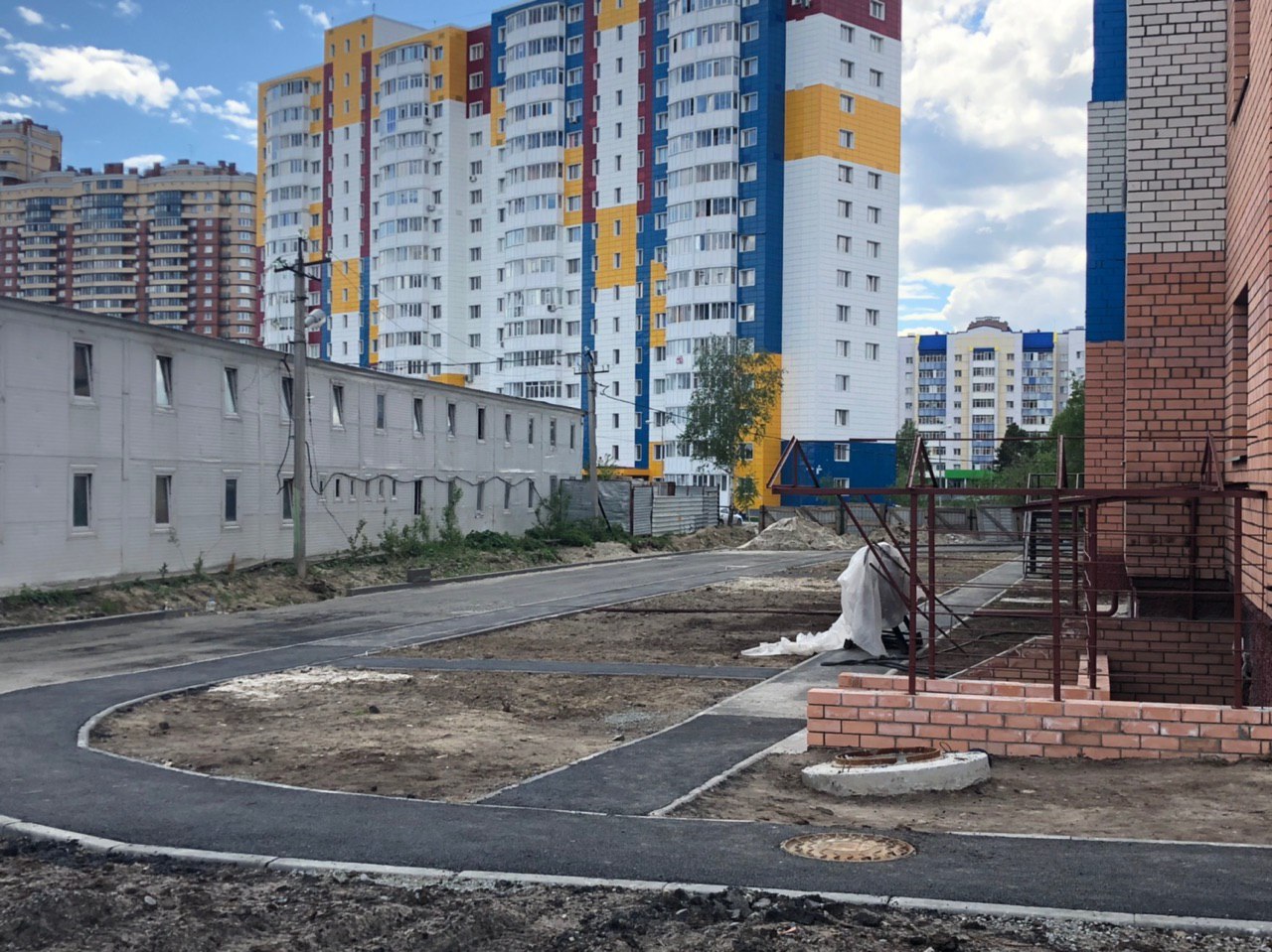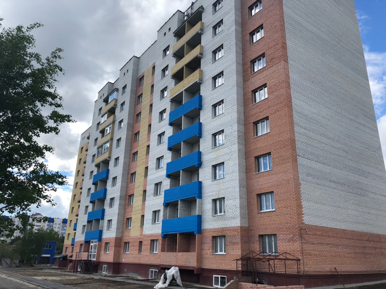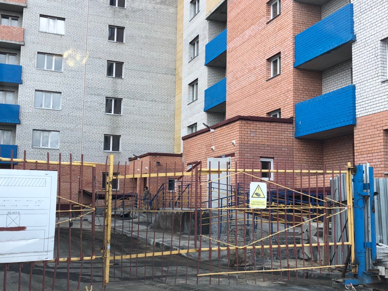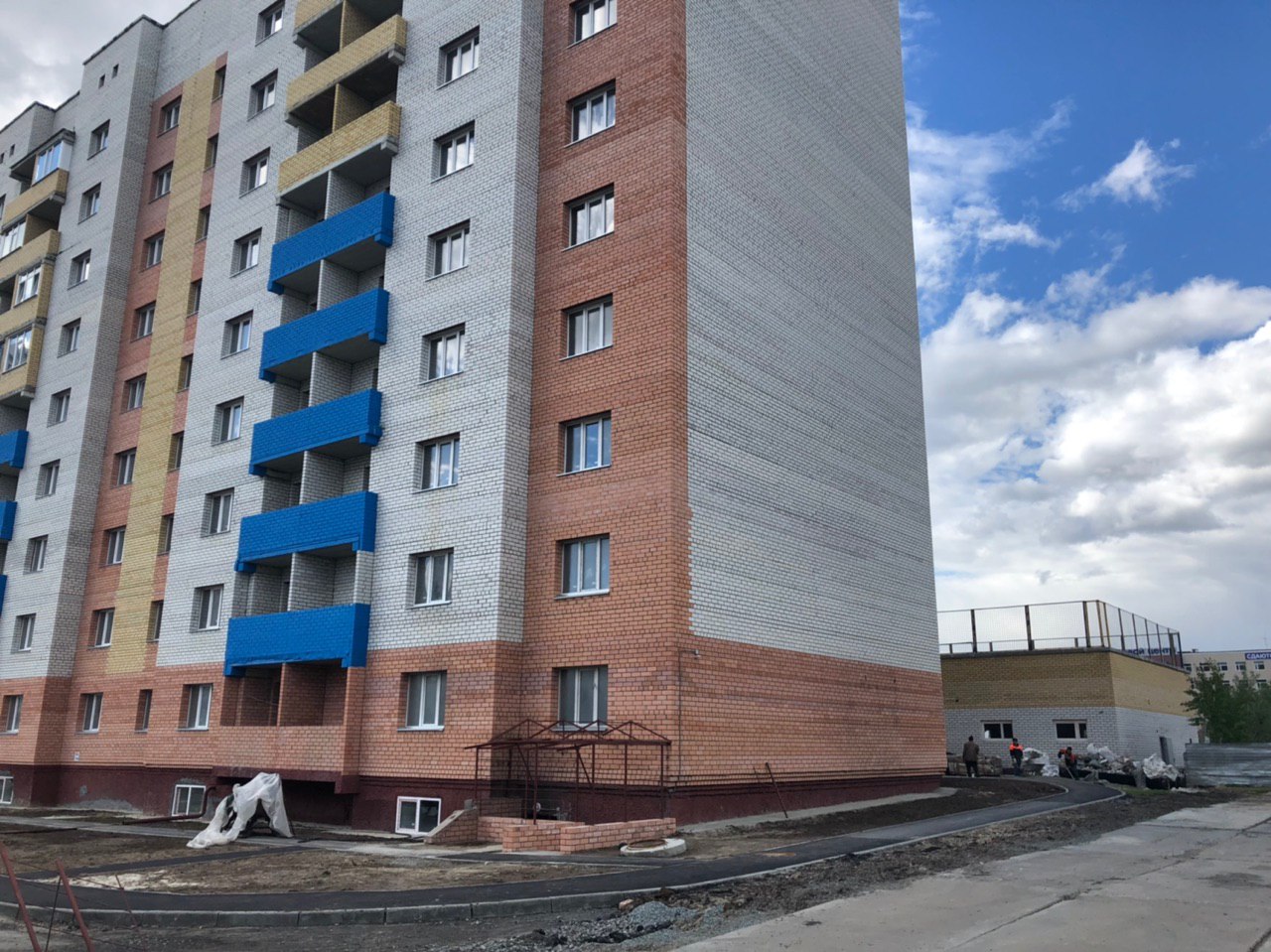 Рабочие в количестве 4-6 человек ведут благоустройство территориию. Внутри подъездов производятся отделочные работы (побелка, штукатурка) силами двух рабочих. Ведутся работы в подвале.