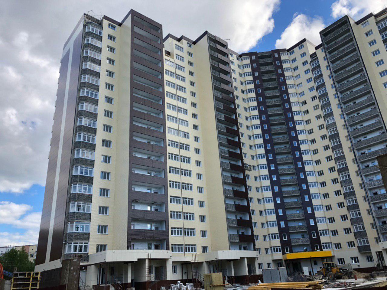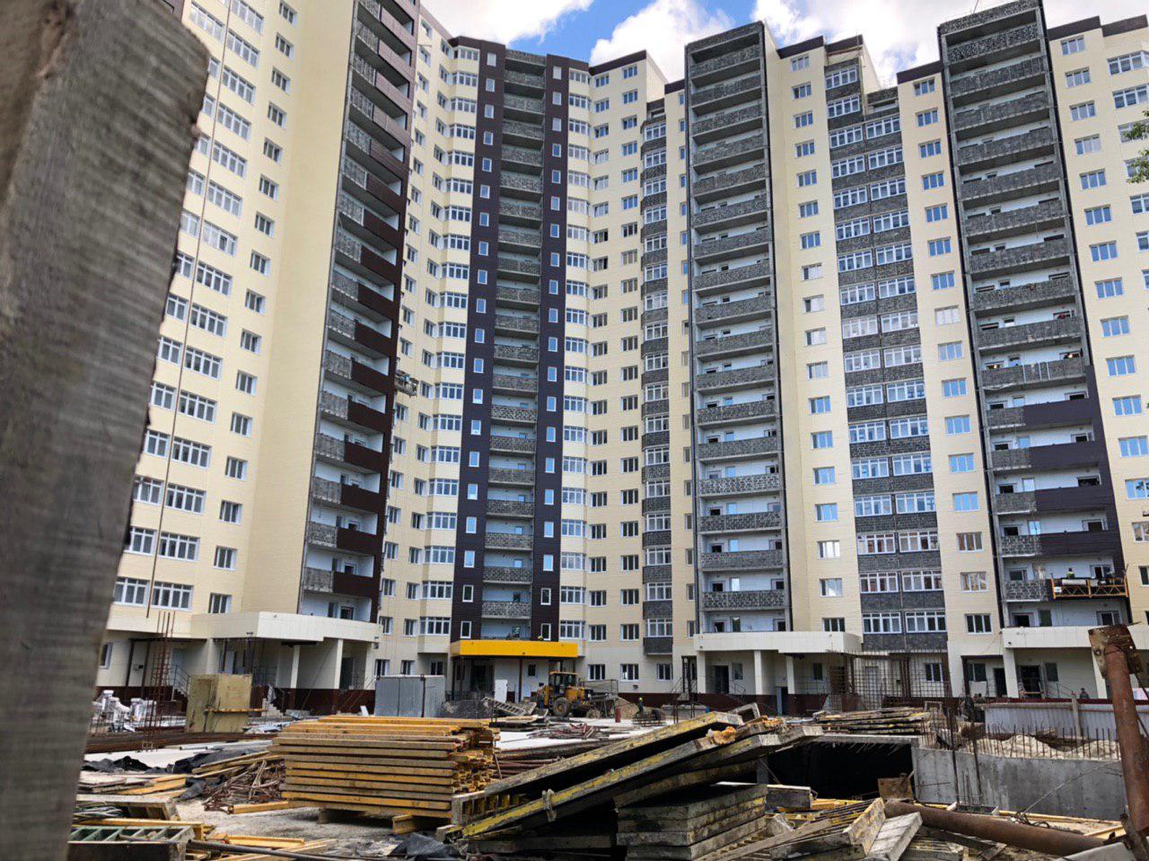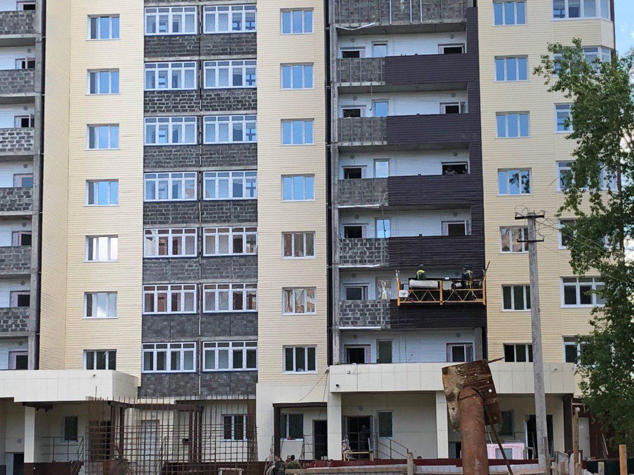 Рабочие в количестве 4 человек ведут отделку фасада, облицовку балконов общего пользования (на люльках). У подъездов ведутся работы силами порядка 4-6 человек, производится отделка помещений общего пользования. Работает погрузчик со стороны дороги.