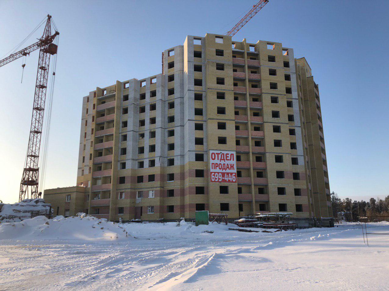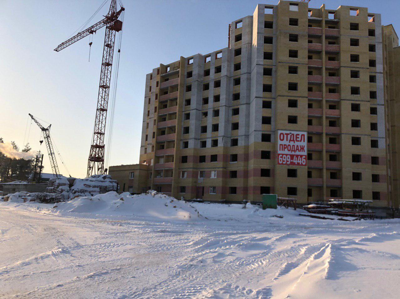Ведется кладка ограждающих конструкций 10-го этажа 8 секции, а также 12 этажа 7 секции многоквартирного жилого дома. Работают краны, автотехника.