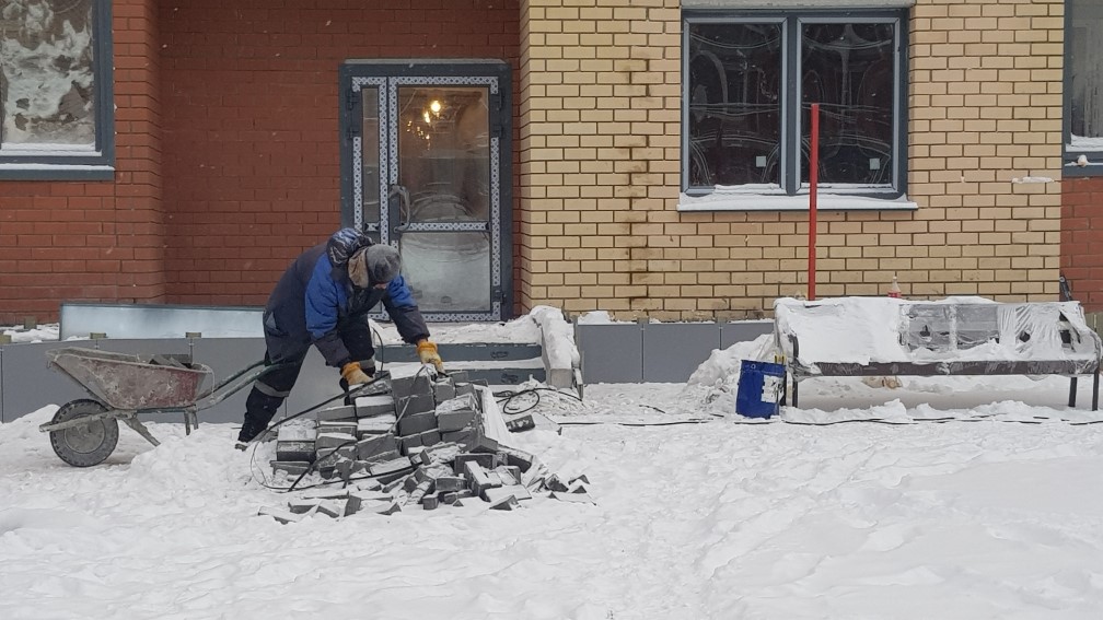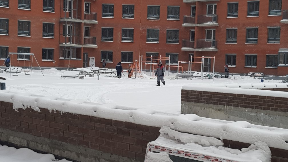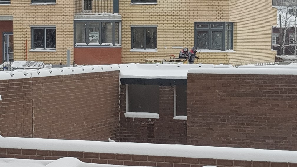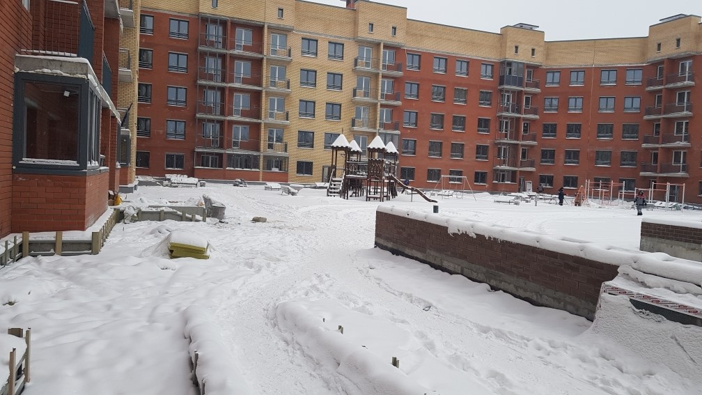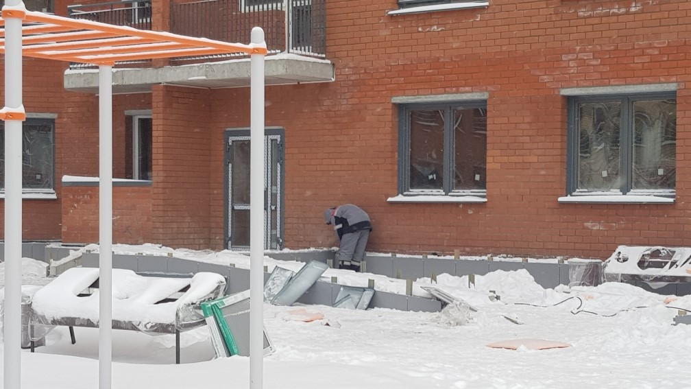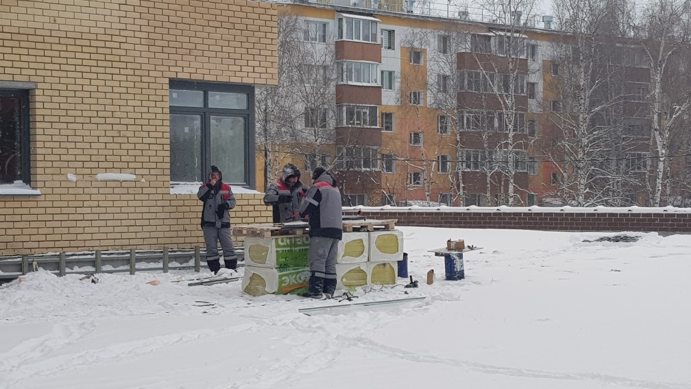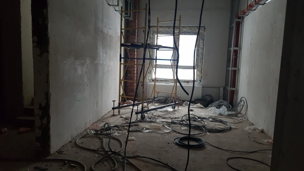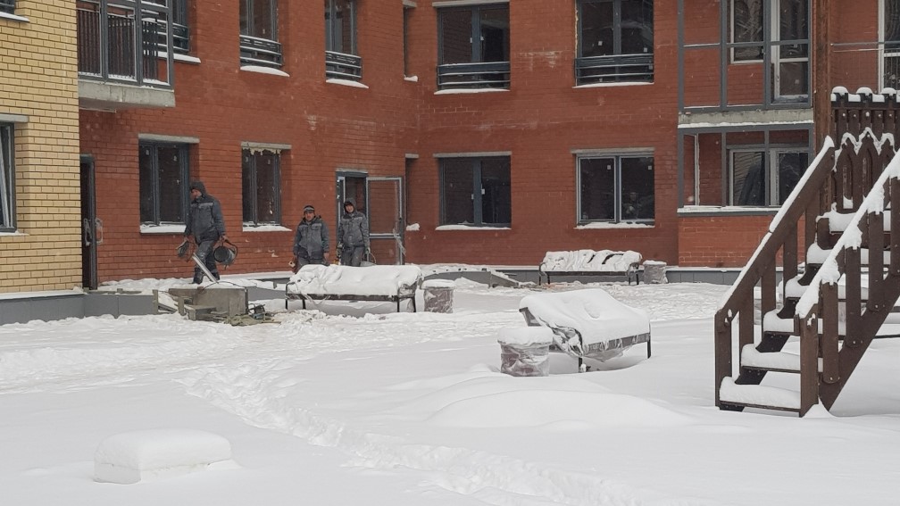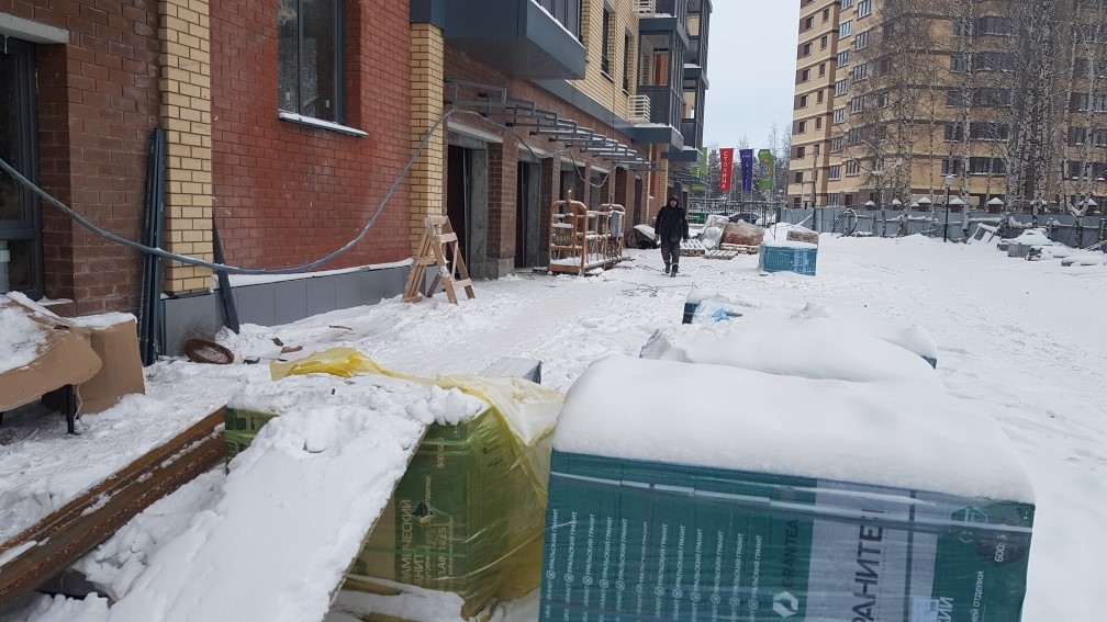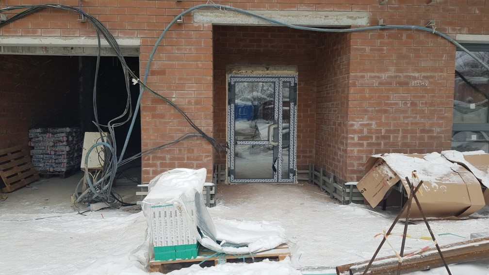 Ведется монтаж внутренней электропроводки. Утепление с последующим оштукатуриванием стен входных групп, спец помешений, гаражей, кладовых. Монтаж воздуховодов вентиляции. Монтаж оконных конструкций. Монтаж балконных и кровельных ограждений. Ведутся фасадные работы. Монтаж слаботочных сетей. Отделочные работы по подъездам, установка квартирных дверей. Общестроительные работы. Ведется обвязка систем пожаротушения. Устройство чистовых полов паркинга.