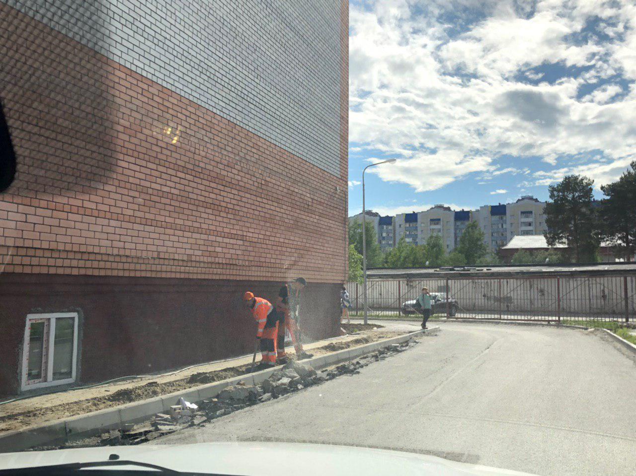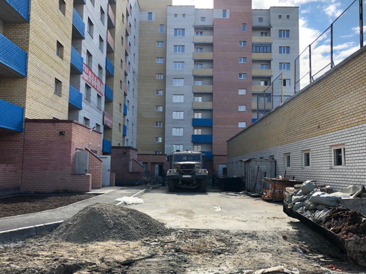Рабочие в количестве 8-9 человек ведут благоустройство территории. Укладка тротуарных дорожек, отсыпка землей. Завоз строительных материалов.