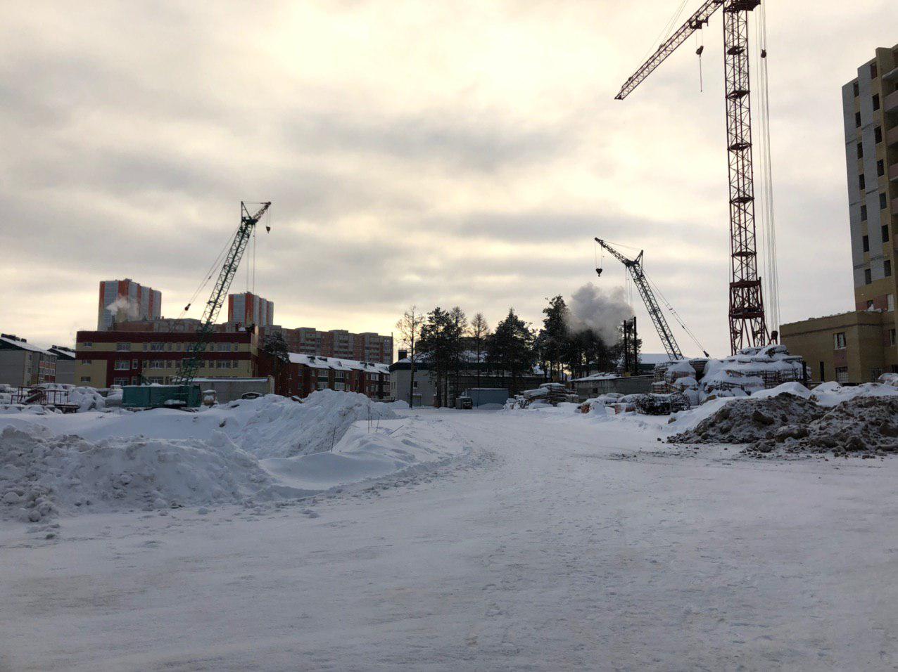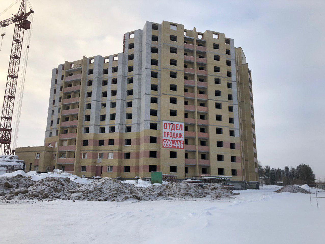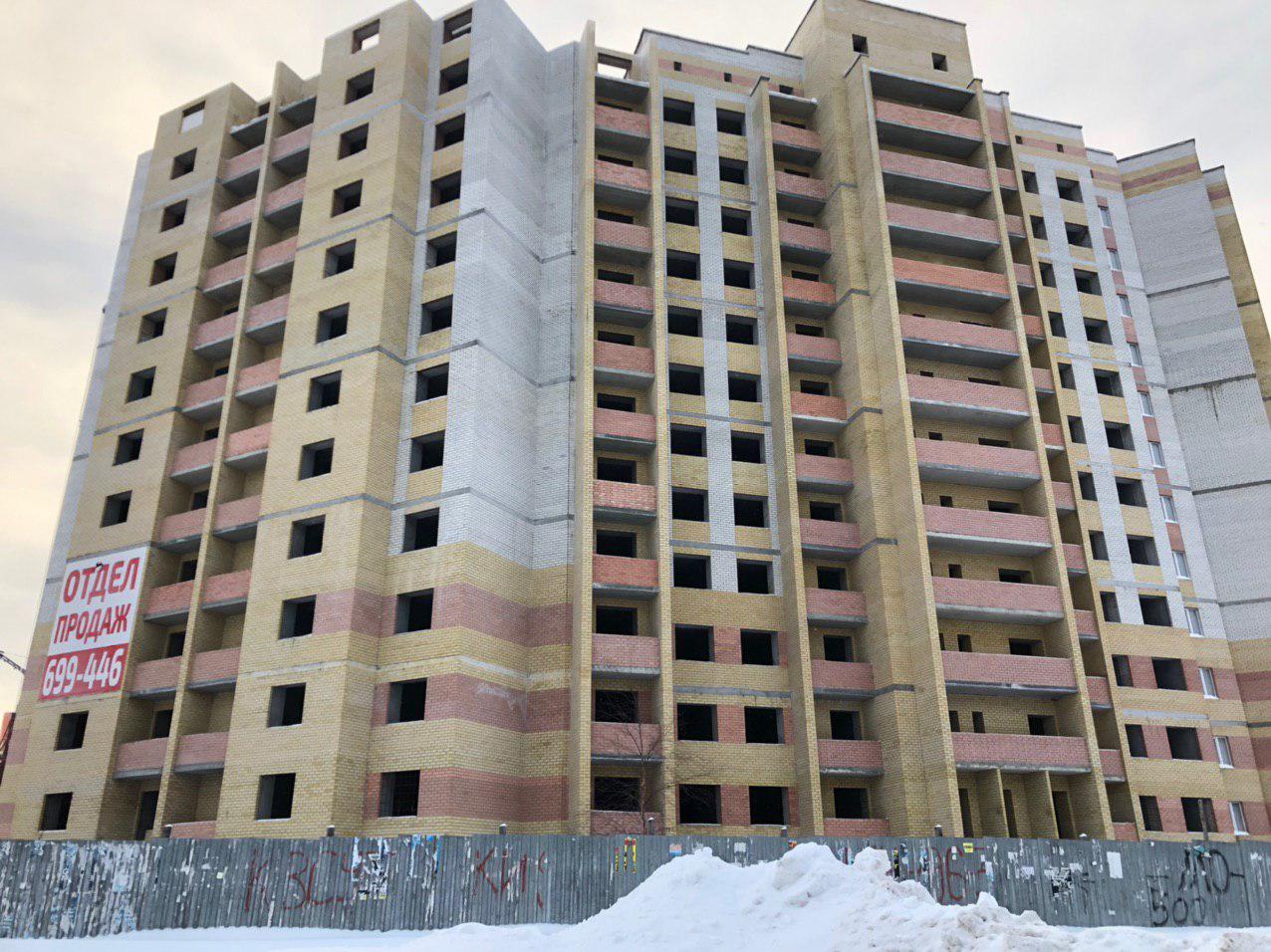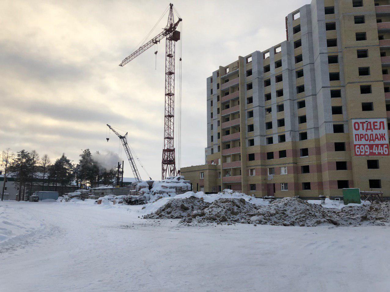 Ведется кладка ограждающих конструкций 10-го этажа 8 секции, а также 12 этажа 7 секции многоквартирного жилого дома. Работают краны, автотехника.