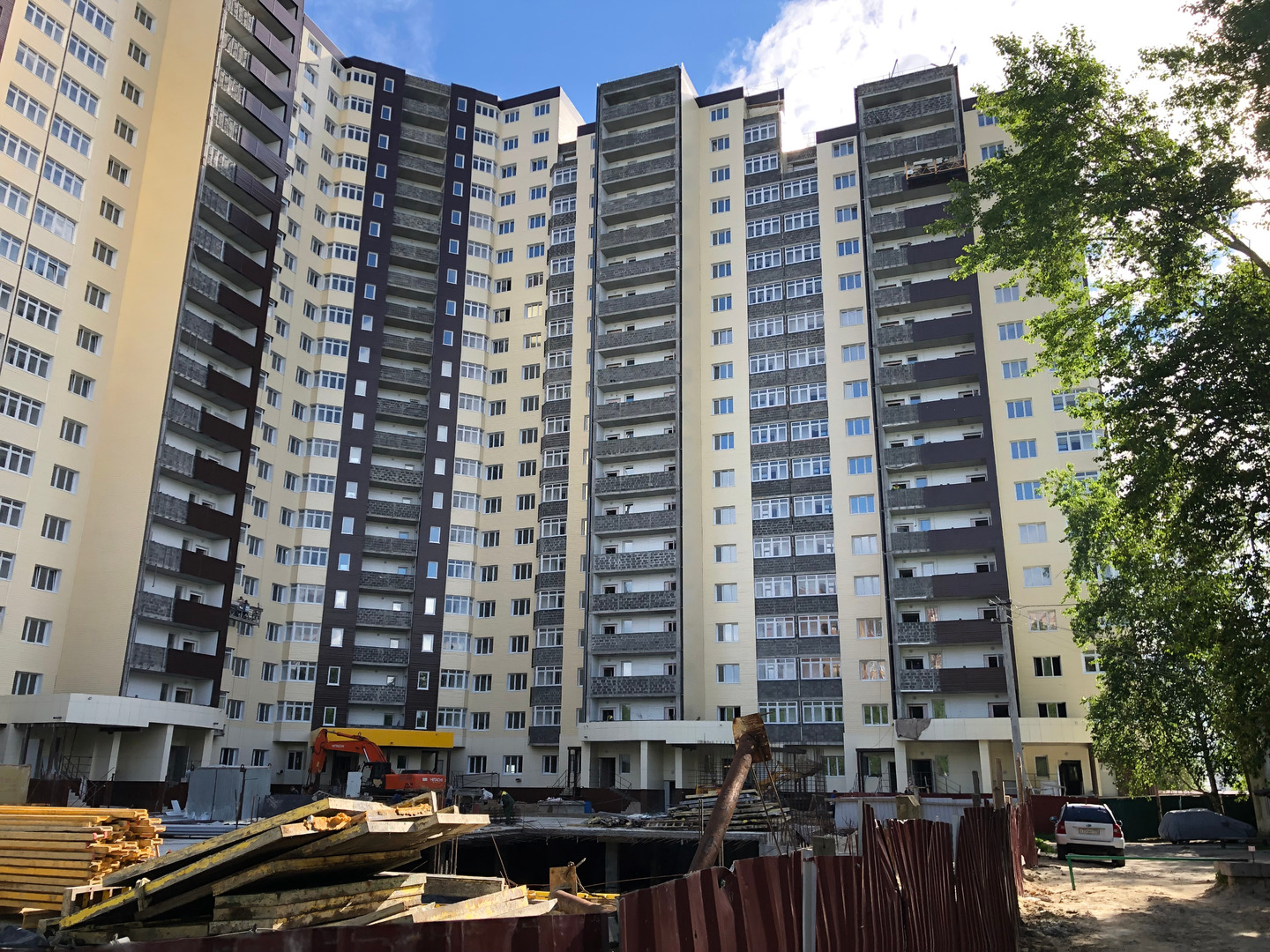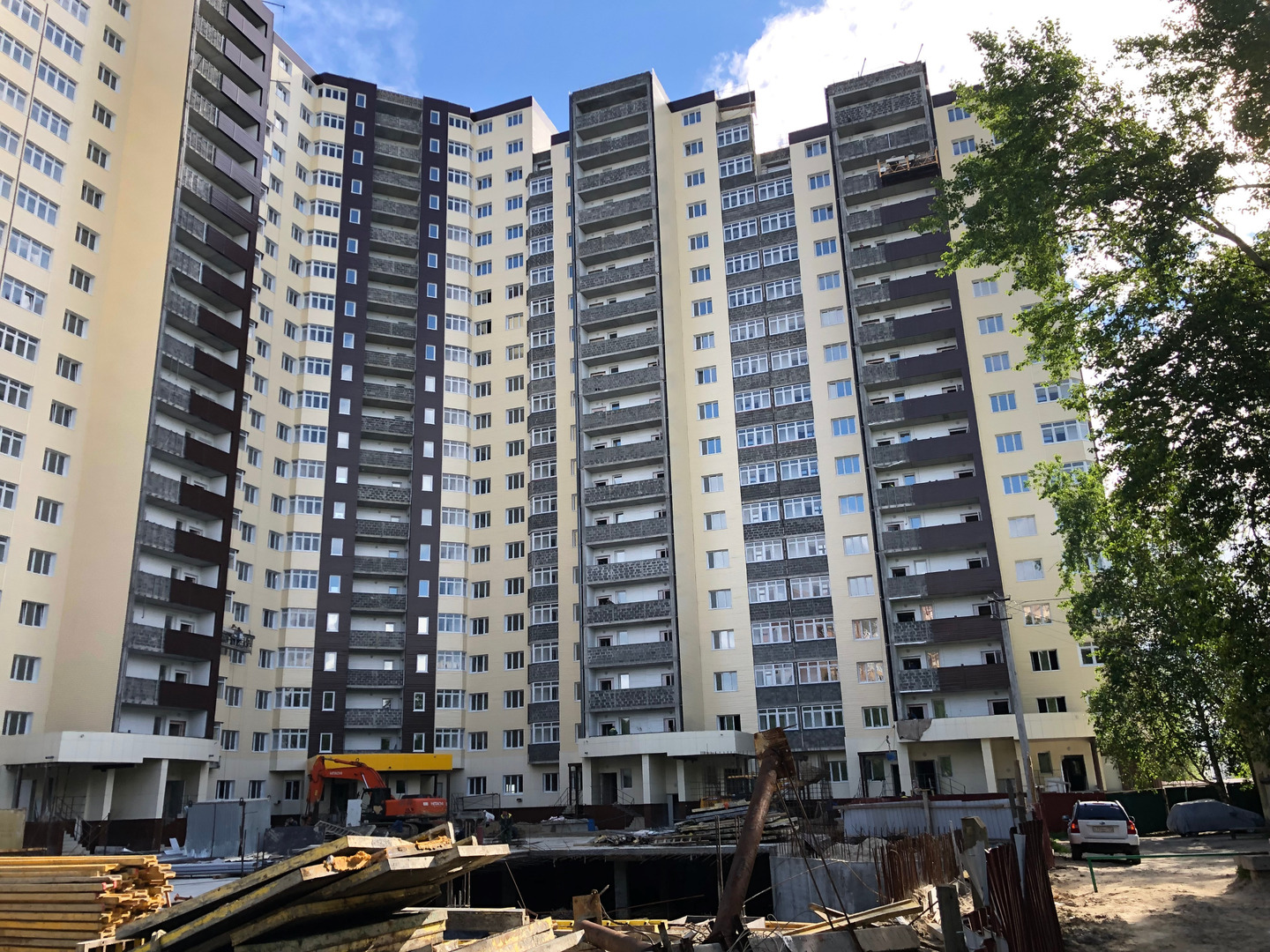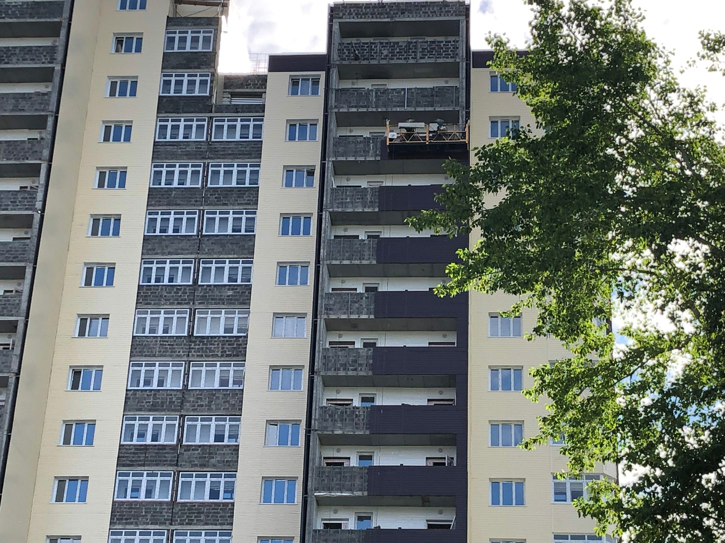 Рабочие в количестве 2 человек ведут отделку фасада, облицовку балконов общего пользования (на люльке).