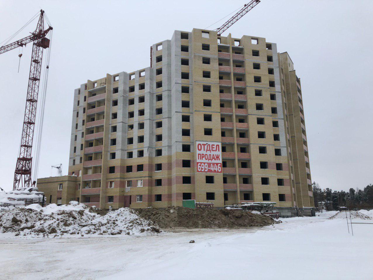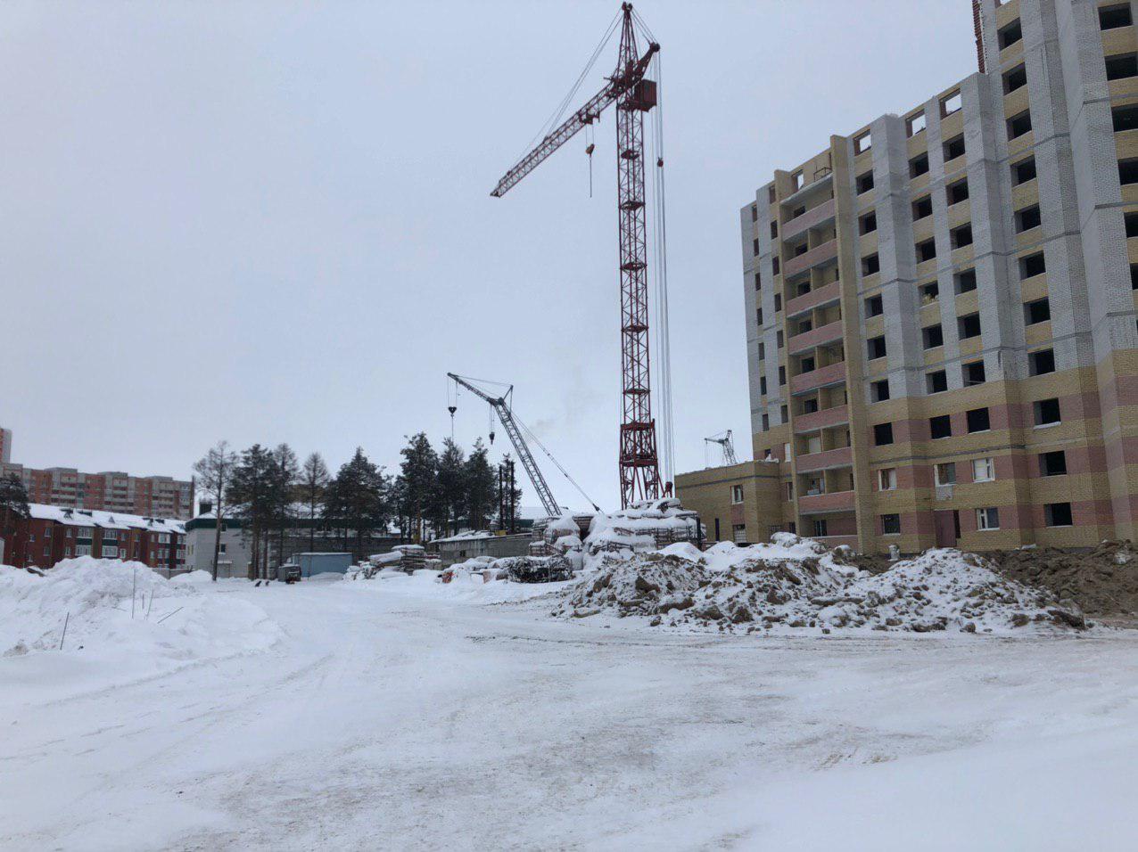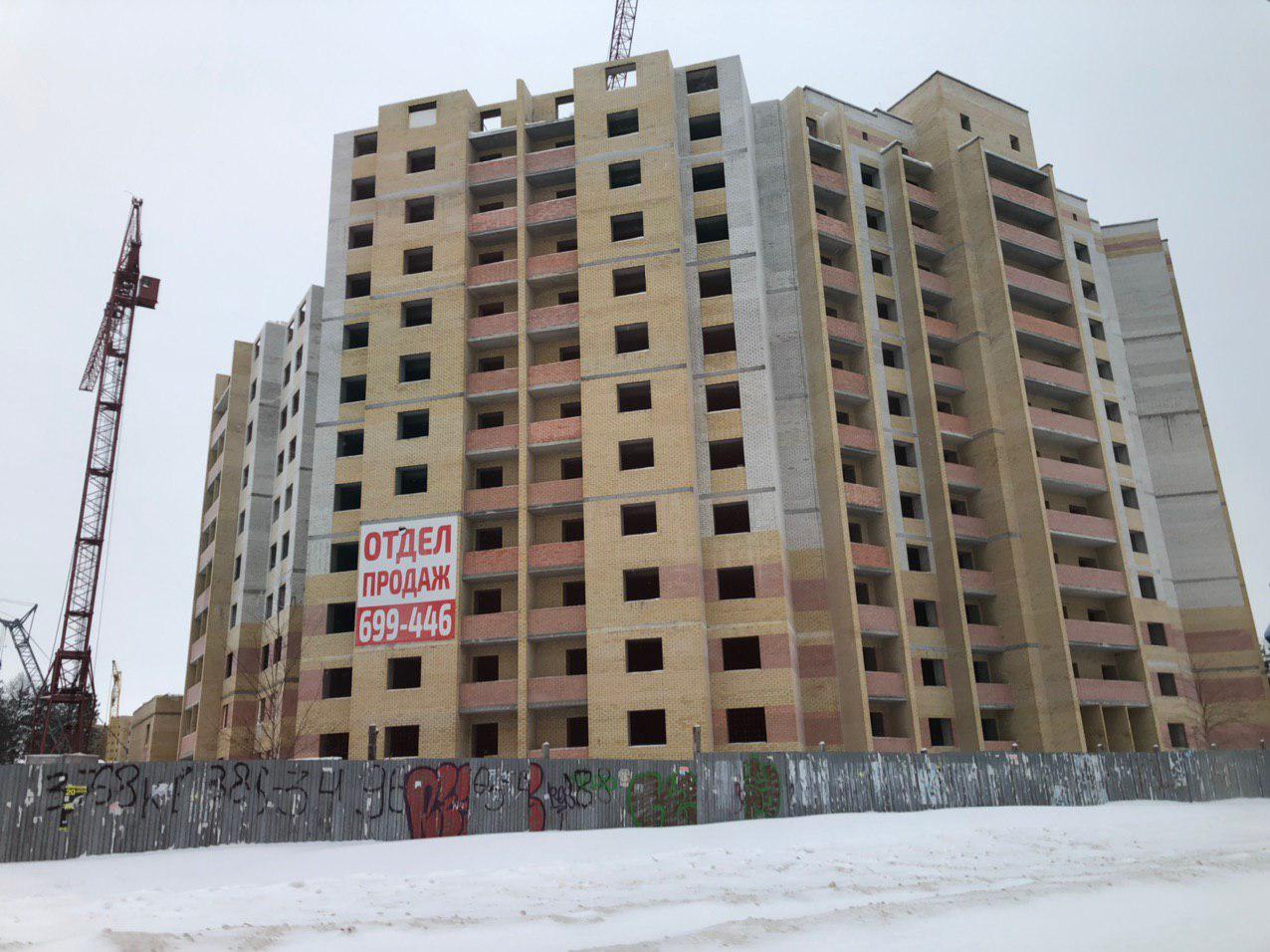 Ведется кладка ограждающих конструкций 10-го этажа 8 секции, а также 12 этажа 7 секции многоквартирного жилого дома. Работают краны, автотехника.
