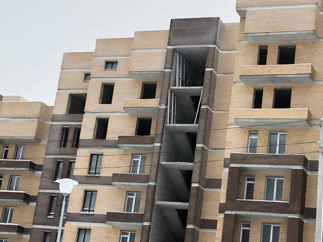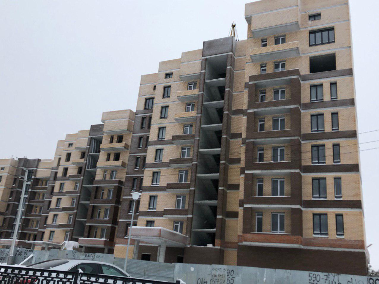 Работает кран, автокран, производится завоз и подъем строительного материала. Проводятся работы по остеклению оконных проемов.