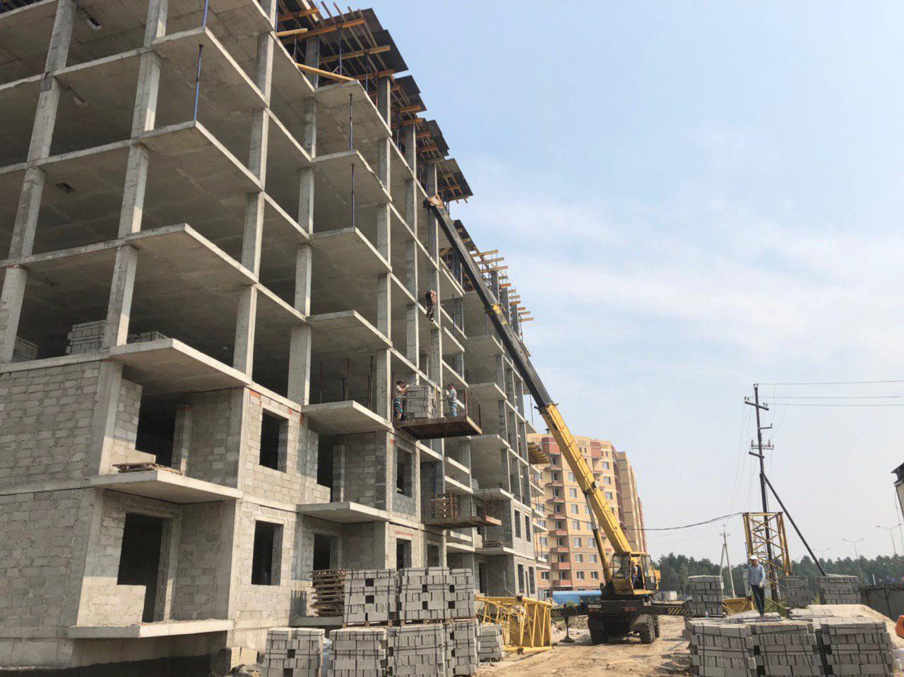 Проводится укладка ограждающих конструкций первого и второго этажа силами 2-4 человек, работает автокран.