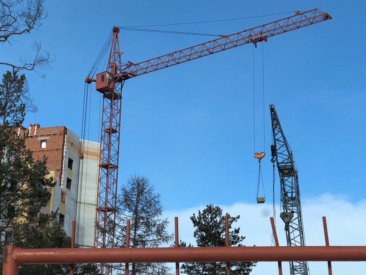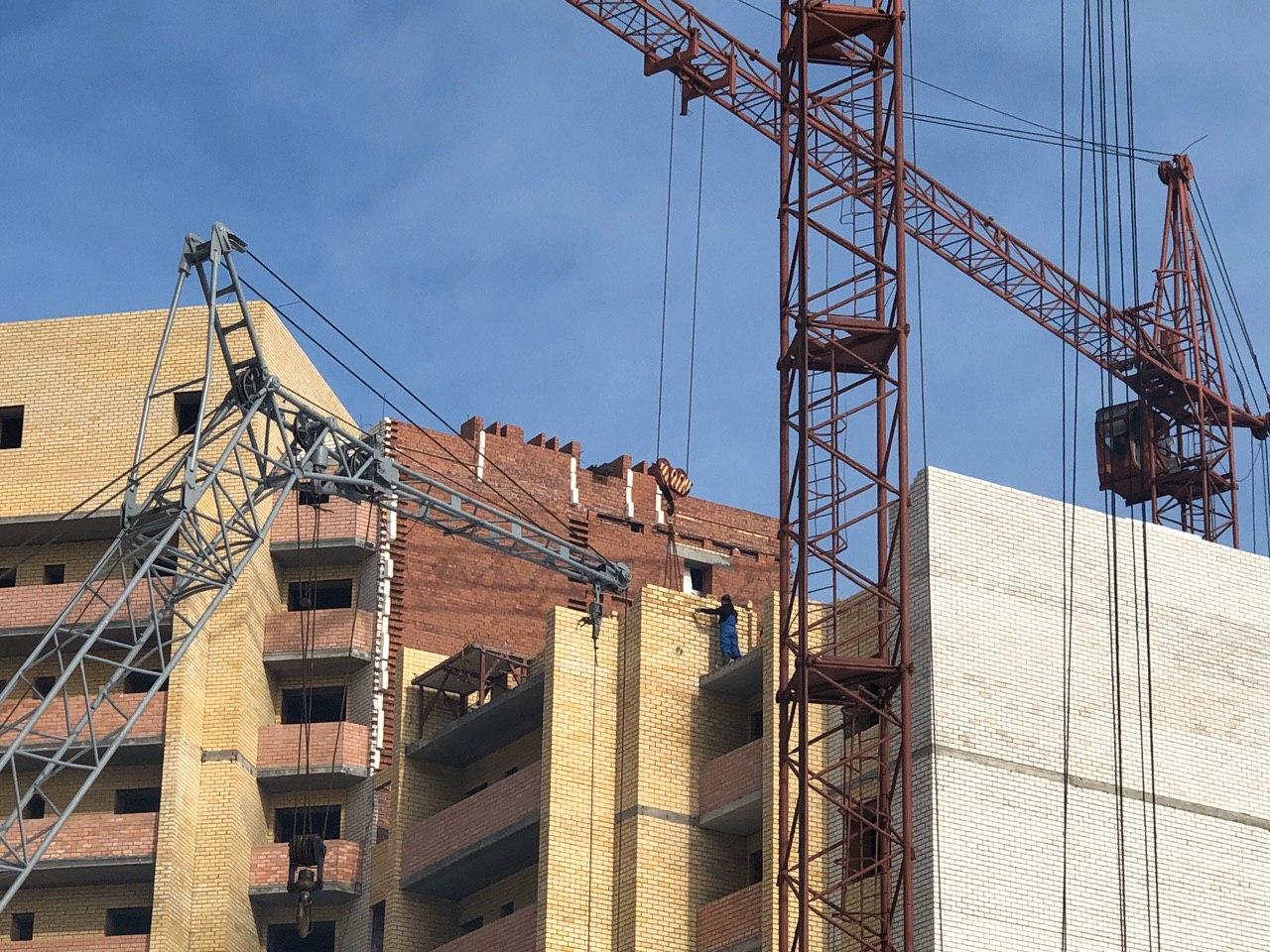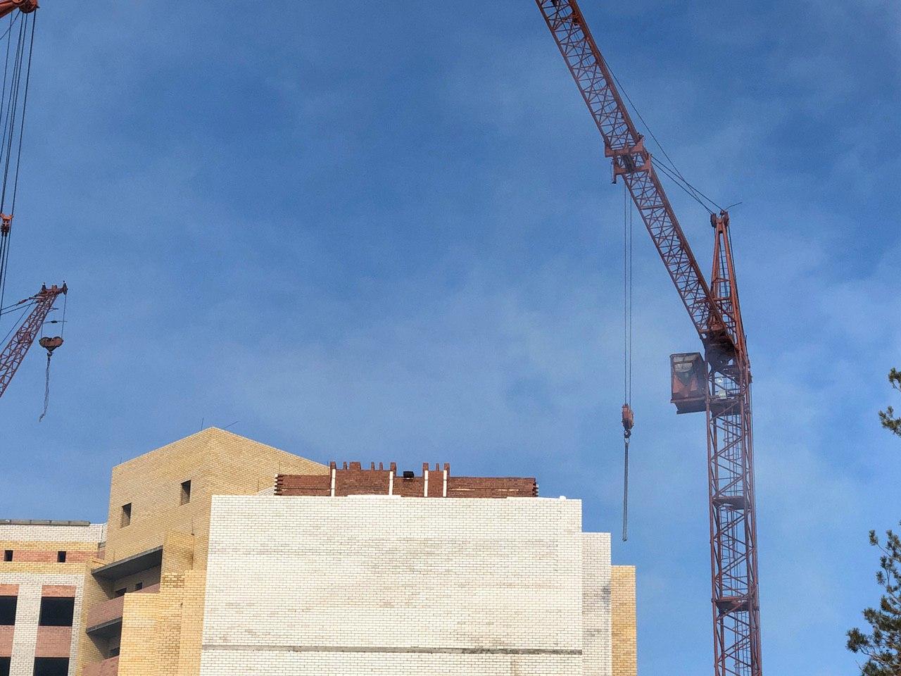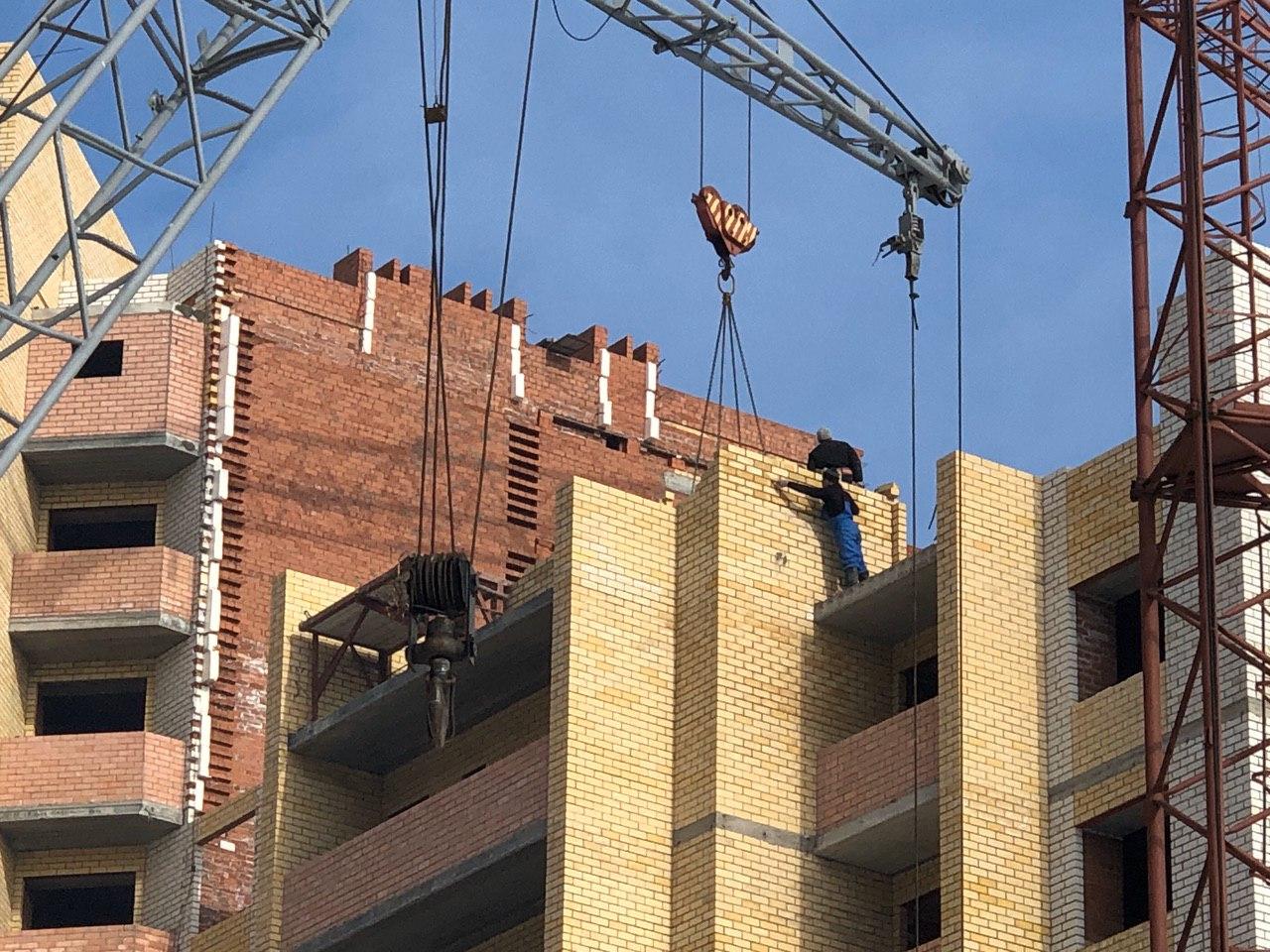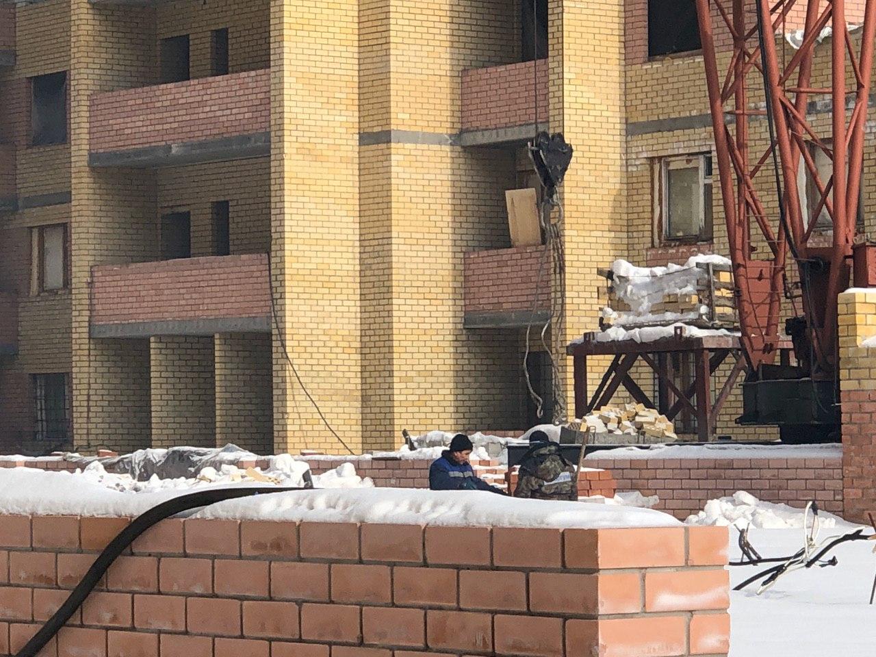 На строительной площадке находятся минимум 7 человек, работает 1 кран, 2 каменщика производят кладку 10 этажа 8 секции, 2 человека производят работы на крыше паркинга.