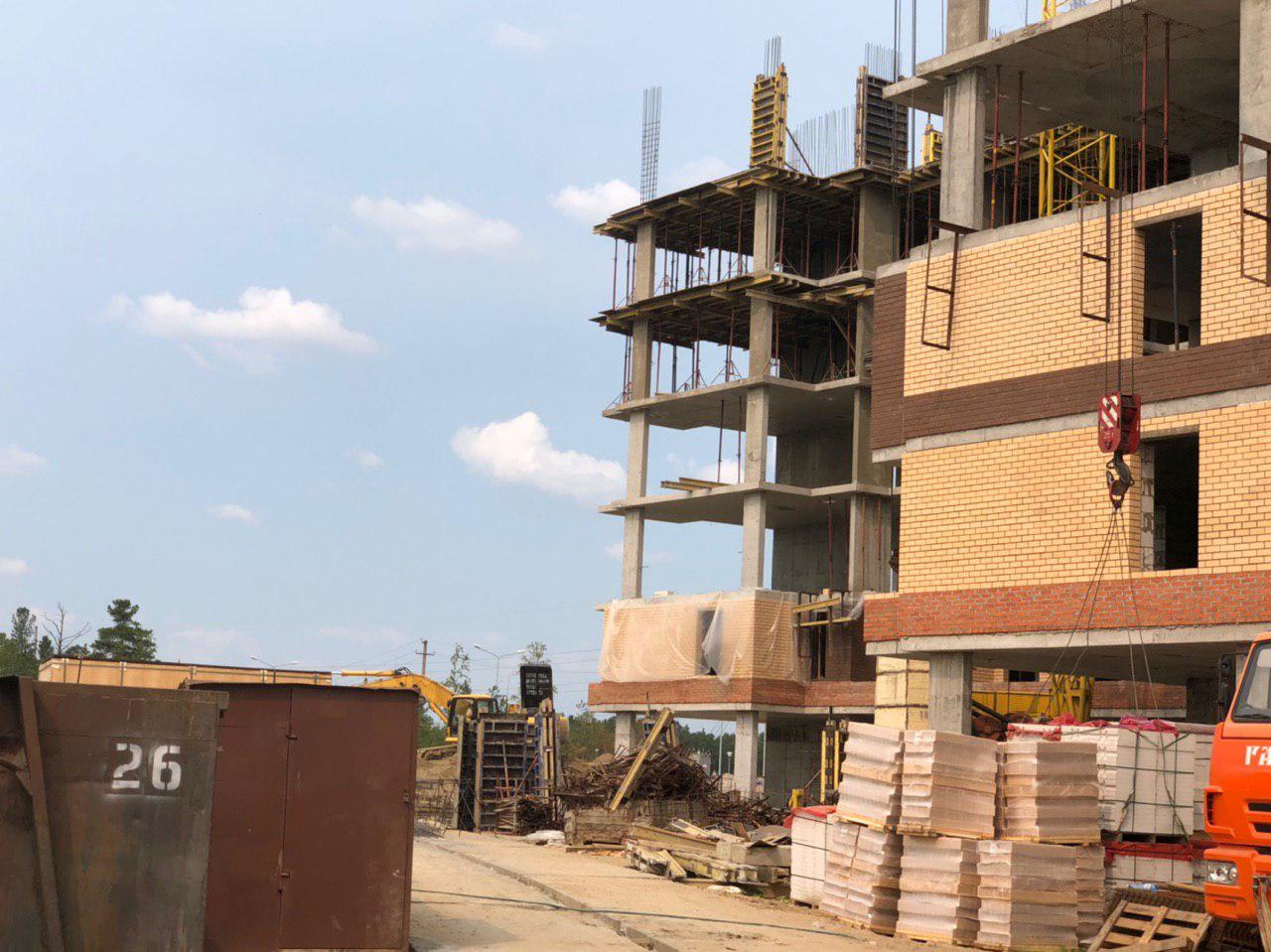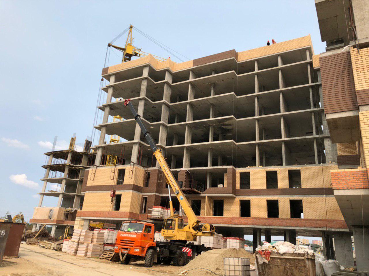 Каменщики в количестве 5-7 человек ведут кладку ограждающей конструкции 2 этажа из кирпича. Работает кран и автокран. Завозятся строительные материалы. Ведется подъем строительного материала.