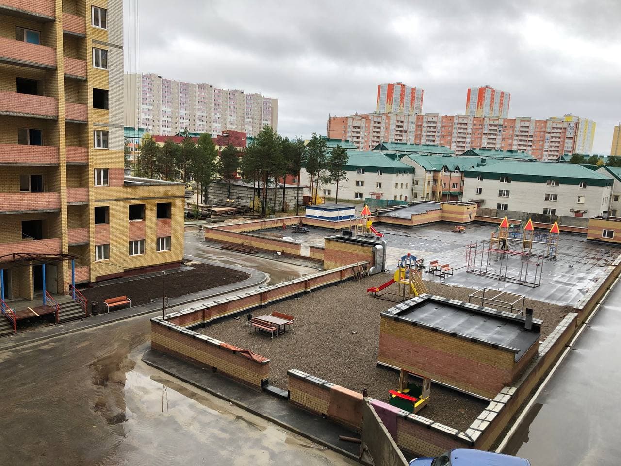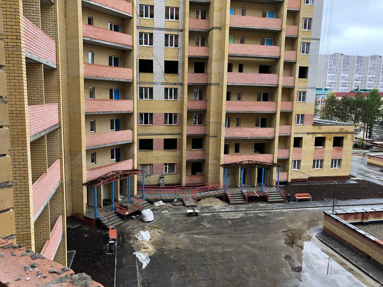 В 5 подъезде ведутся работы по монтажу лифтов, 1-3 этажи – отделка МОП, заливка сантехнических отверстий; установка плитки в МОП; в 6 подъезде сбор канализационных туб, сбор лифтов; в 7 подъезде проводятся работы по черновой штукатурке стен; 8 подъезде ведутся работы по монтажу труб отопления; монтаж электропроводки, общестроительные работы. Выполняются работы по благоустройству и установке детской и спортивной площадок.
