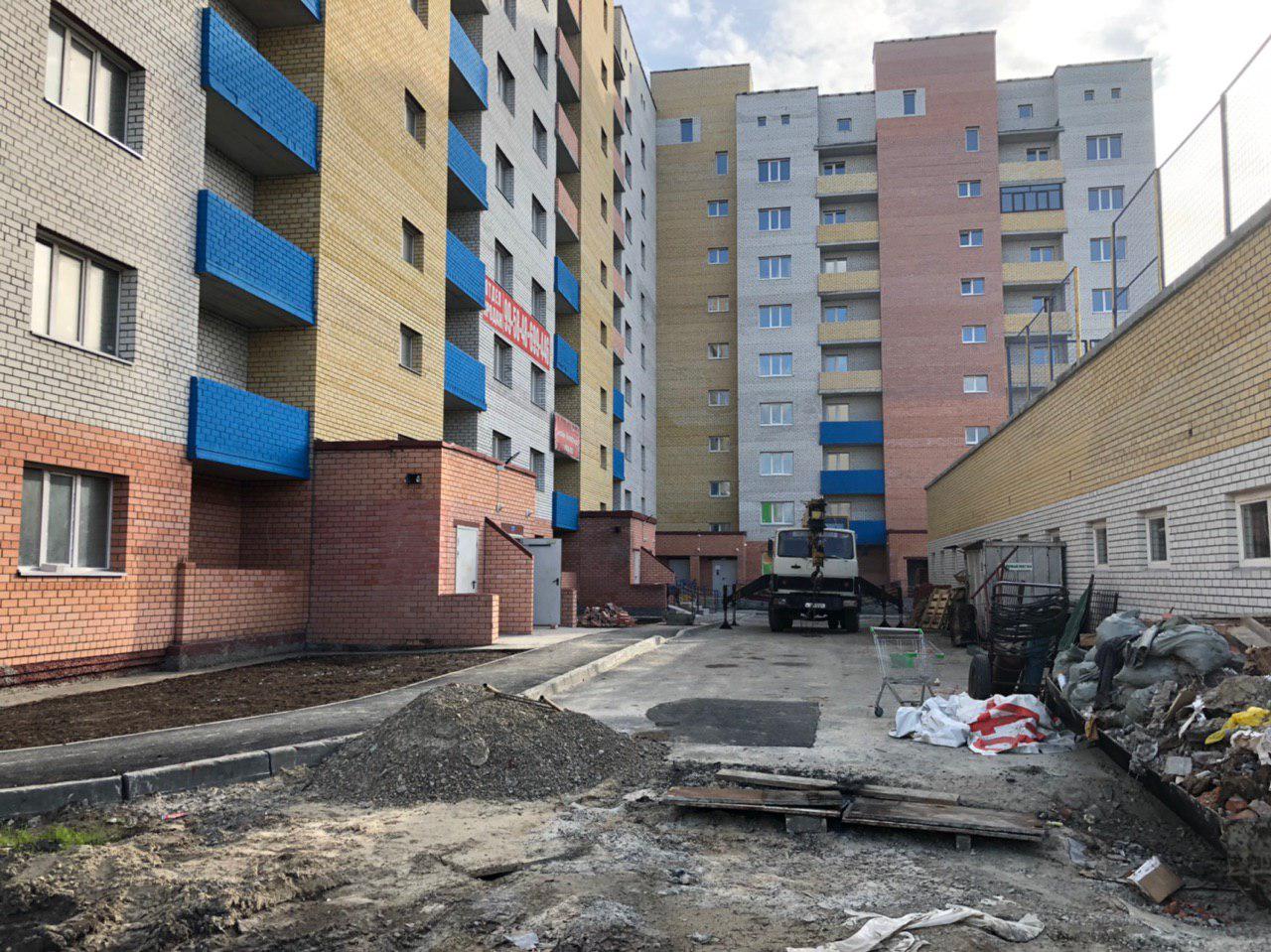 Рабочие в количестве 4-6 человек ведут благоустройство территории. Работает автокран.