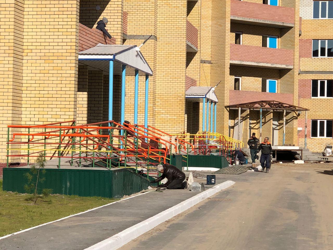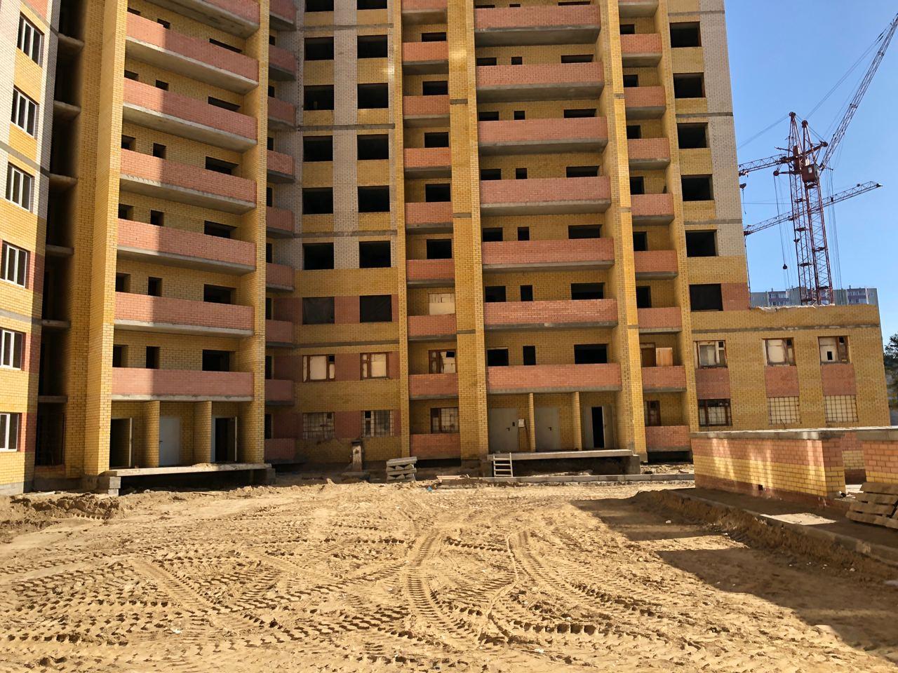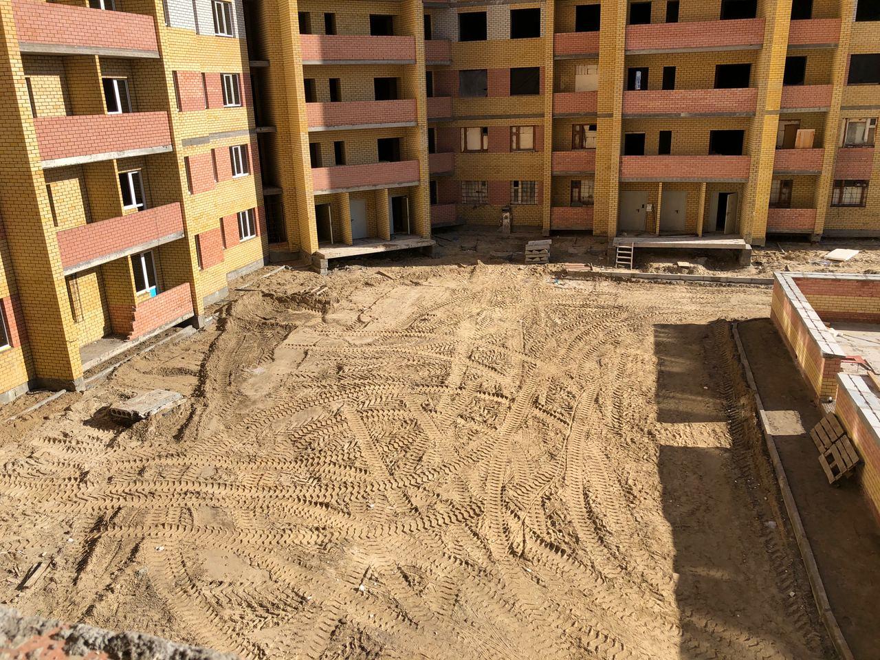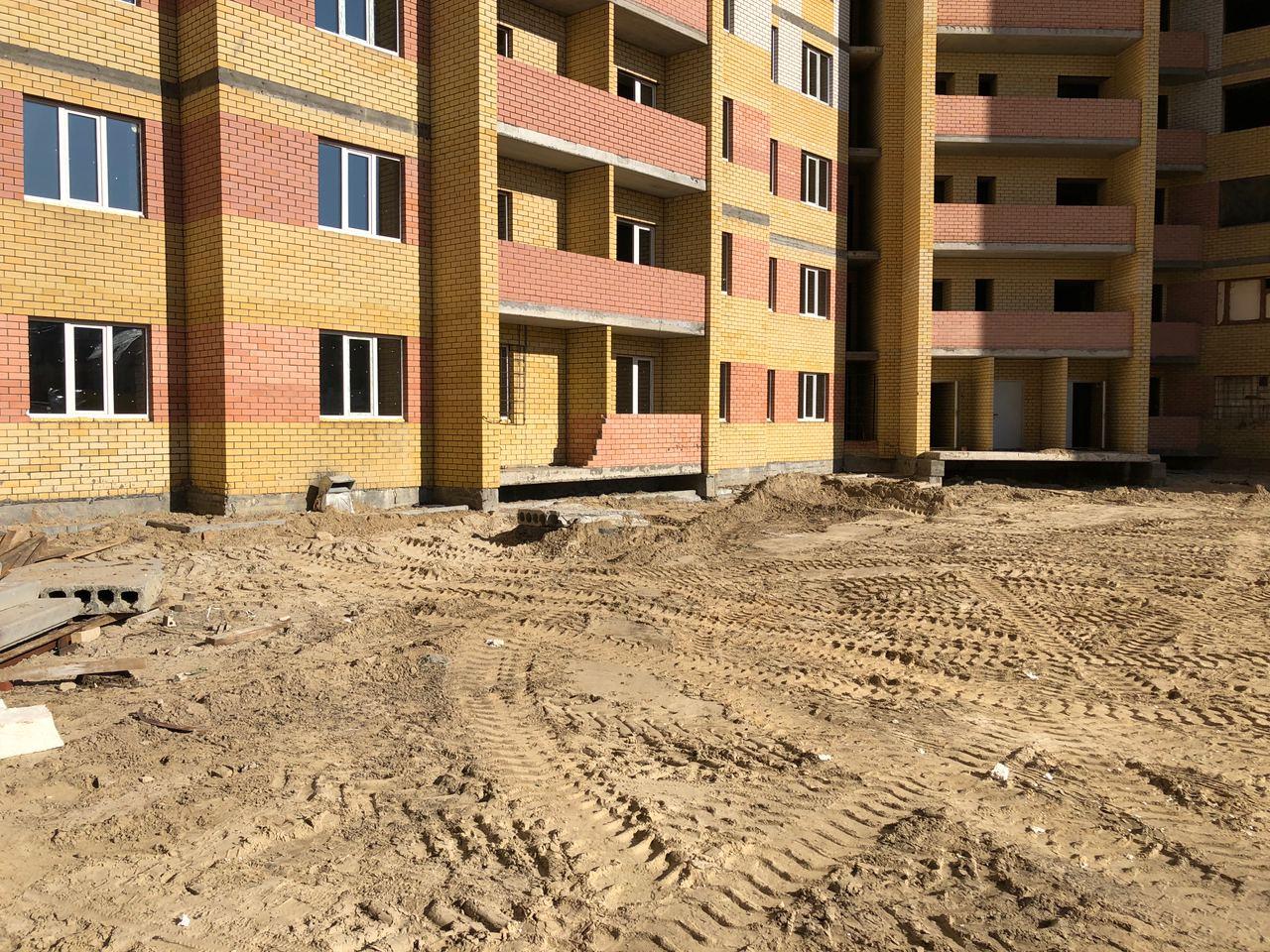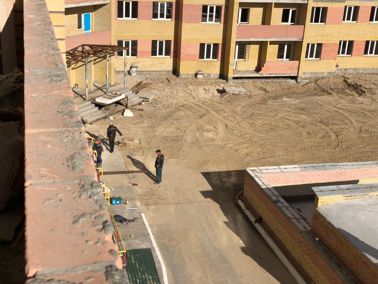 На строительной площадке первых четырех подъездов находятся ориентировочно 10-15 рабочих.