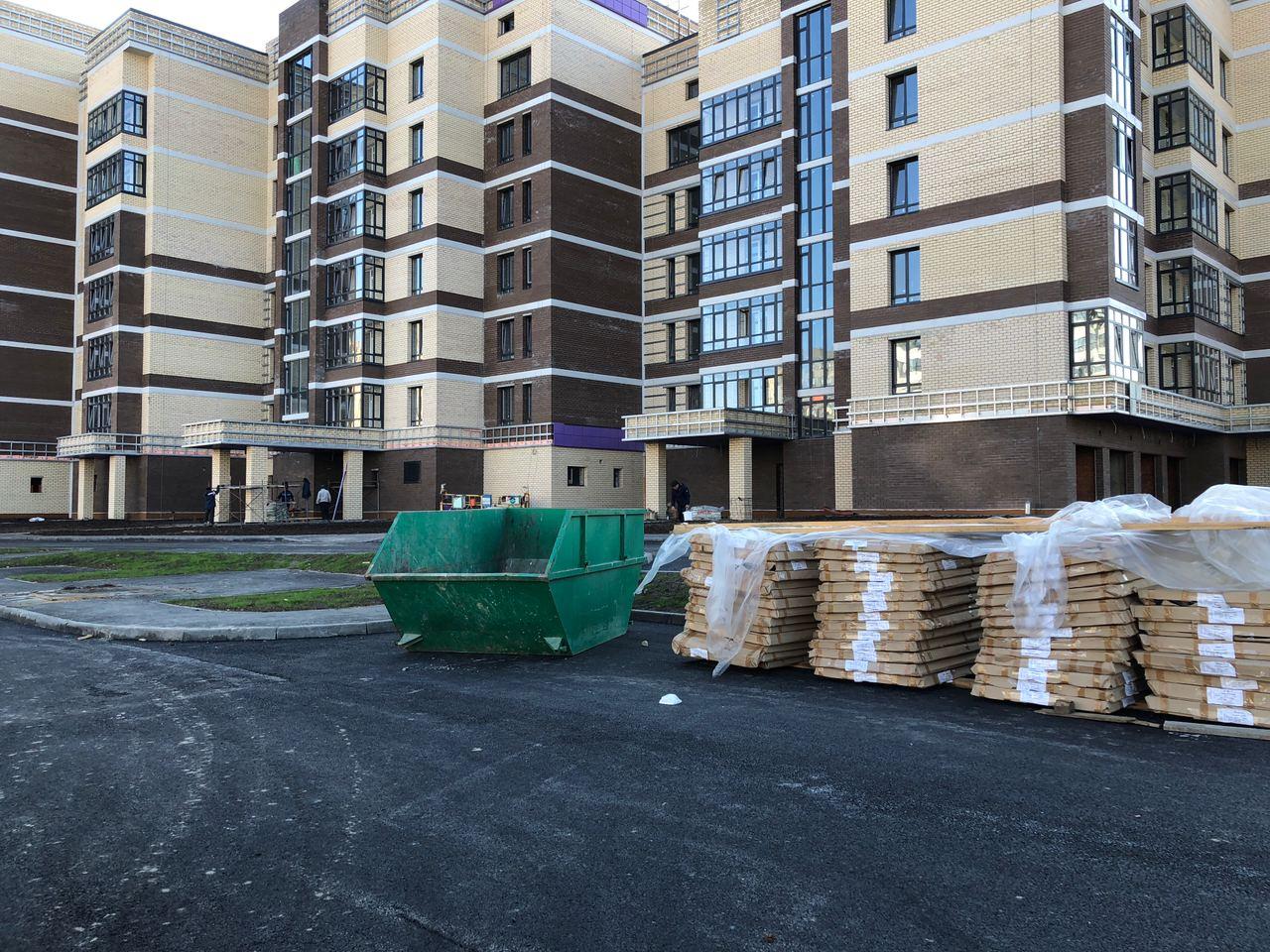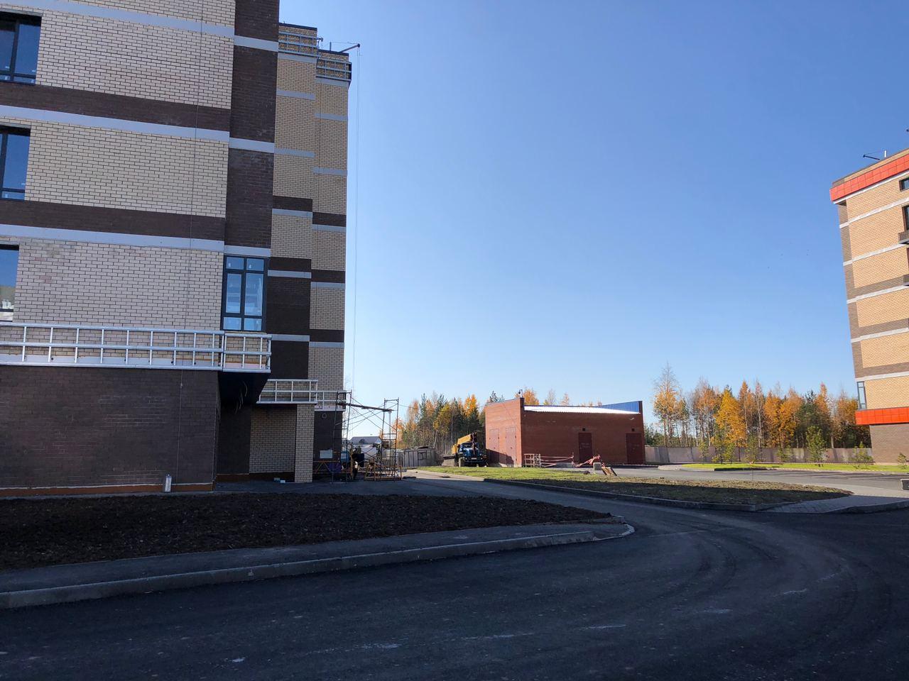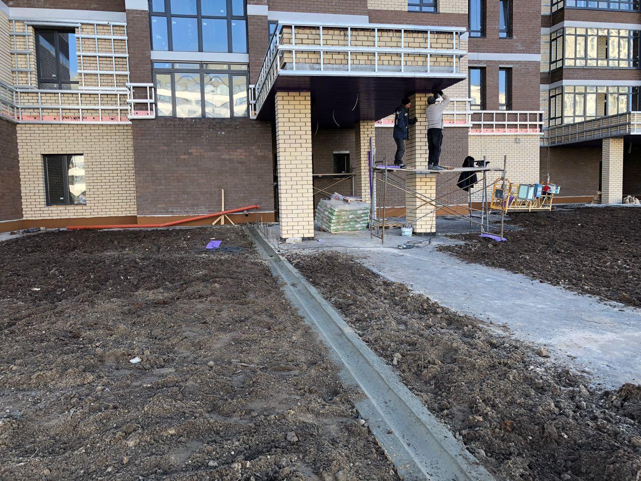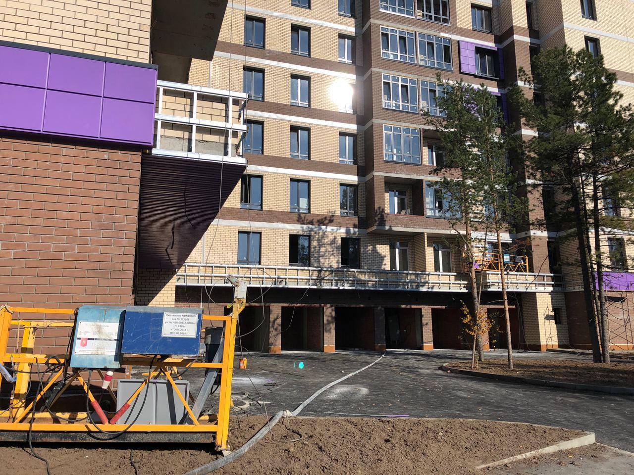 Производятся работы по работы по монтажу фасада, благоустройству территории, асфальтированию тротуаров.