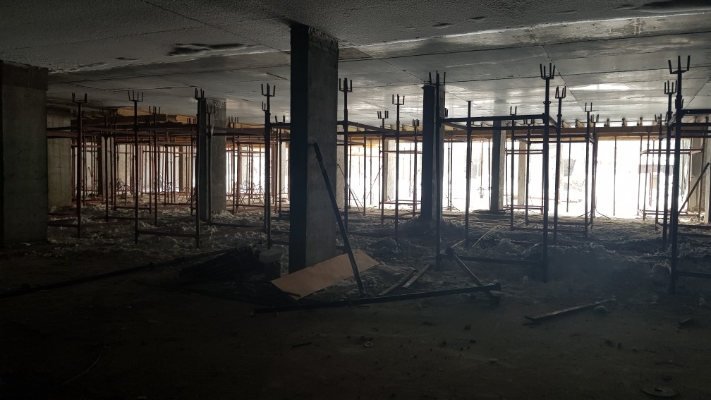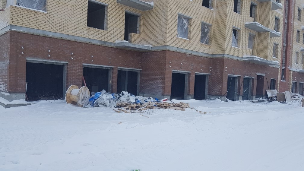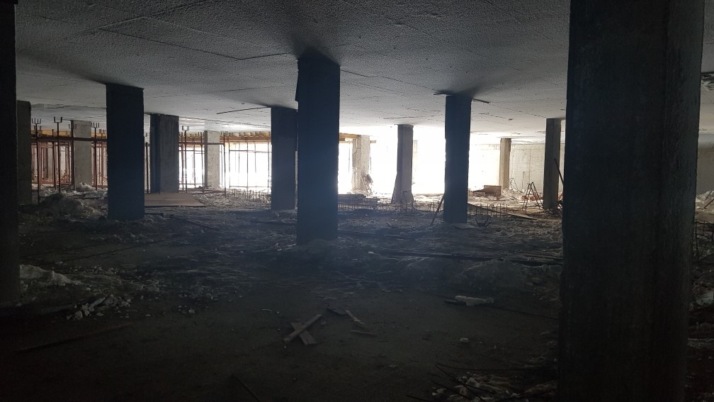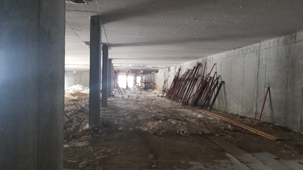 Ведутся работы по устройству монолитной плиты перекрытия паркинга. Подготовка и монтаж арматурных каркасов и опалубки стен помещений паркинга.