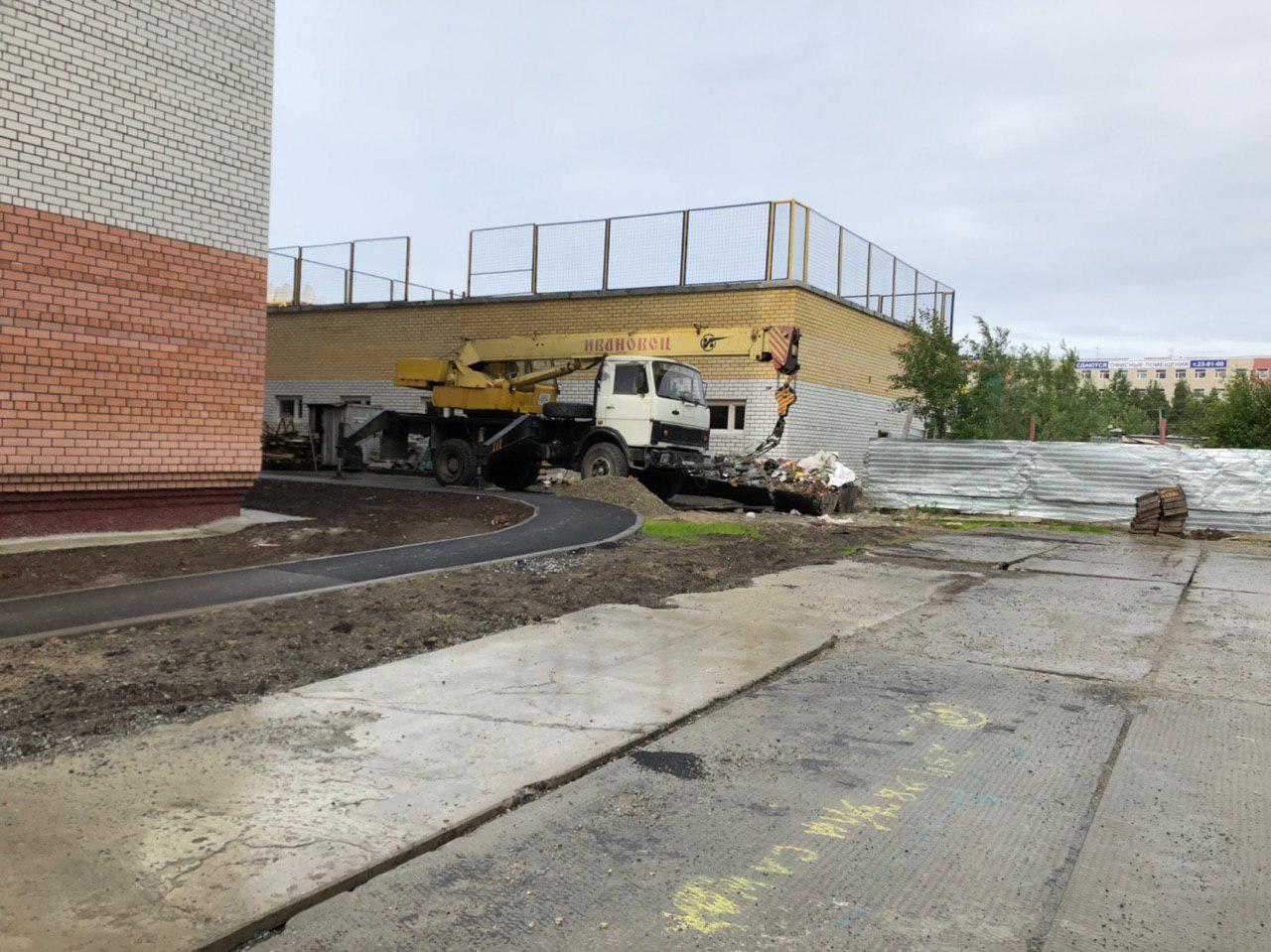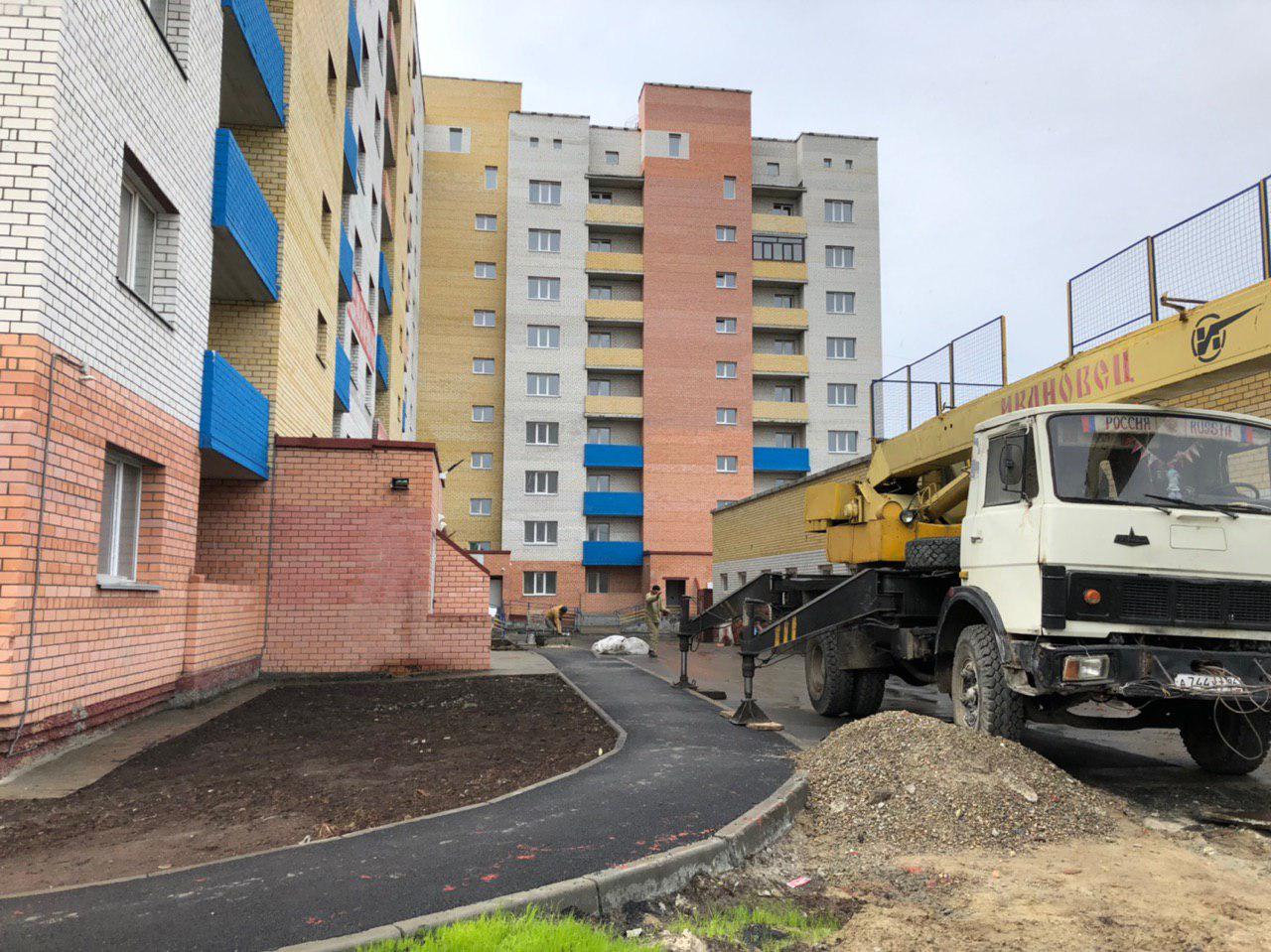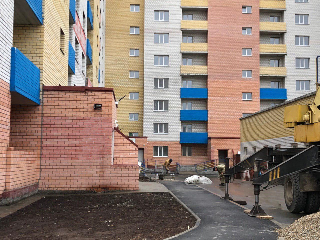 Рабочие в количестве 4-6 человек ведут благоустройство территории. Укладка тротуарных дорожек (благоустройство придомовой территории), работает кран. Ведется монтаж детской площадки на крыши здания паркинга