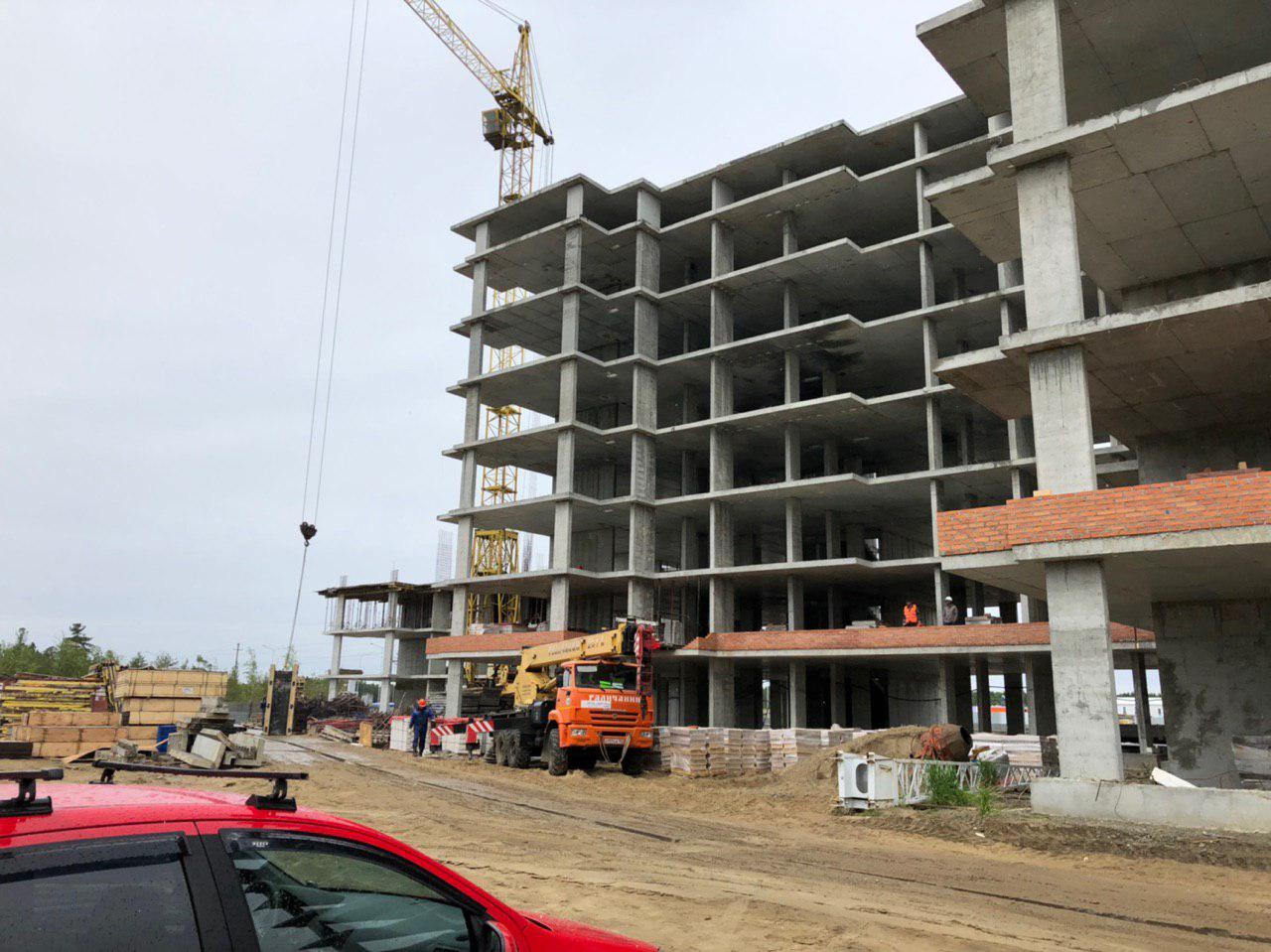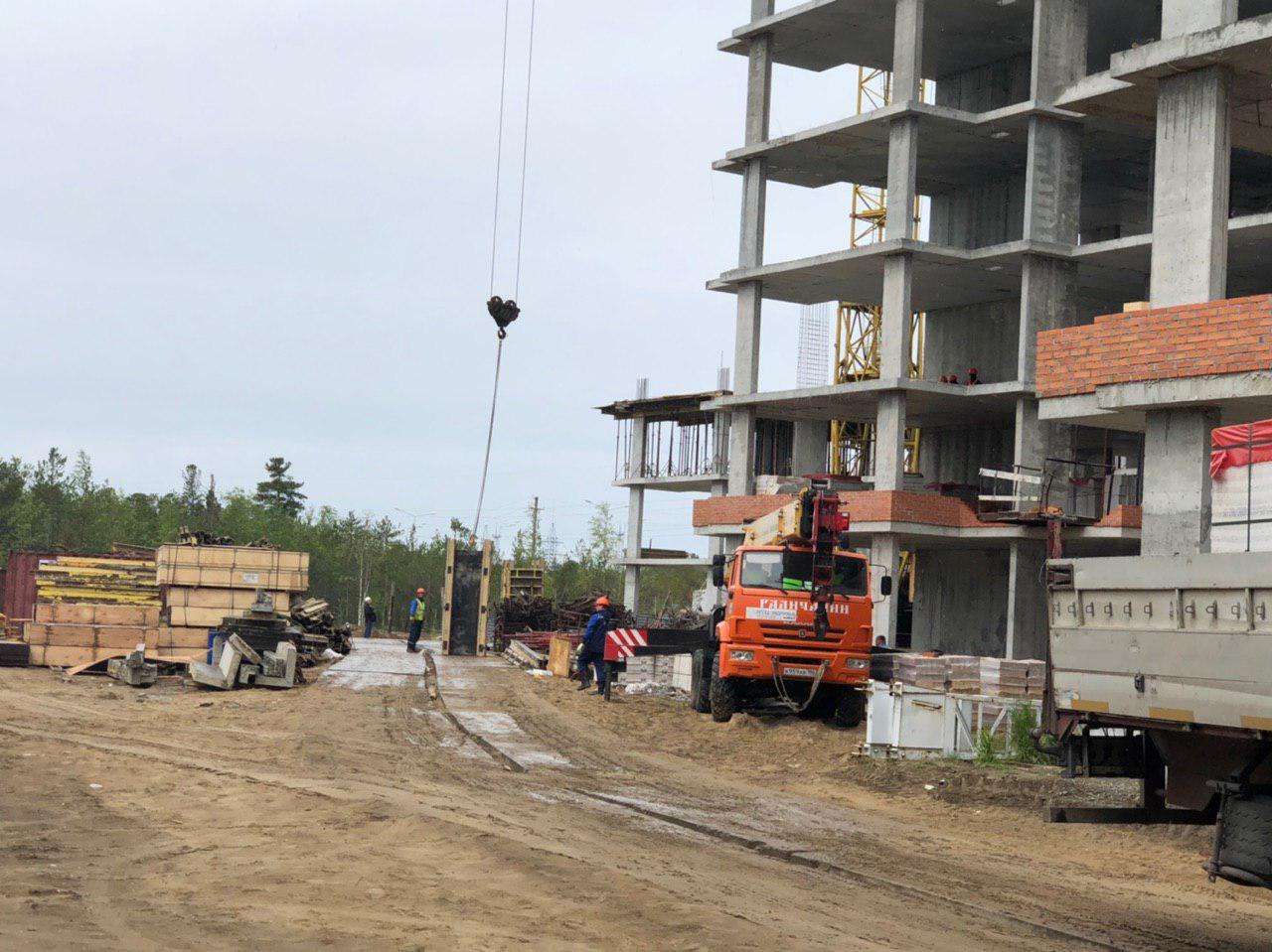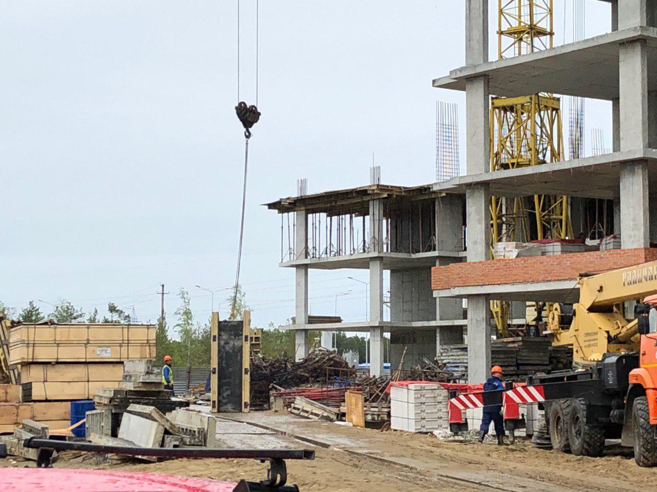 Каменщики в количестве 5-7 человек ведут кладку ограждающей конструкции 2 этажа из кирпича. Работает кран и автокран. Завозятся строительные материалы. Ведется подъем строительного материала.