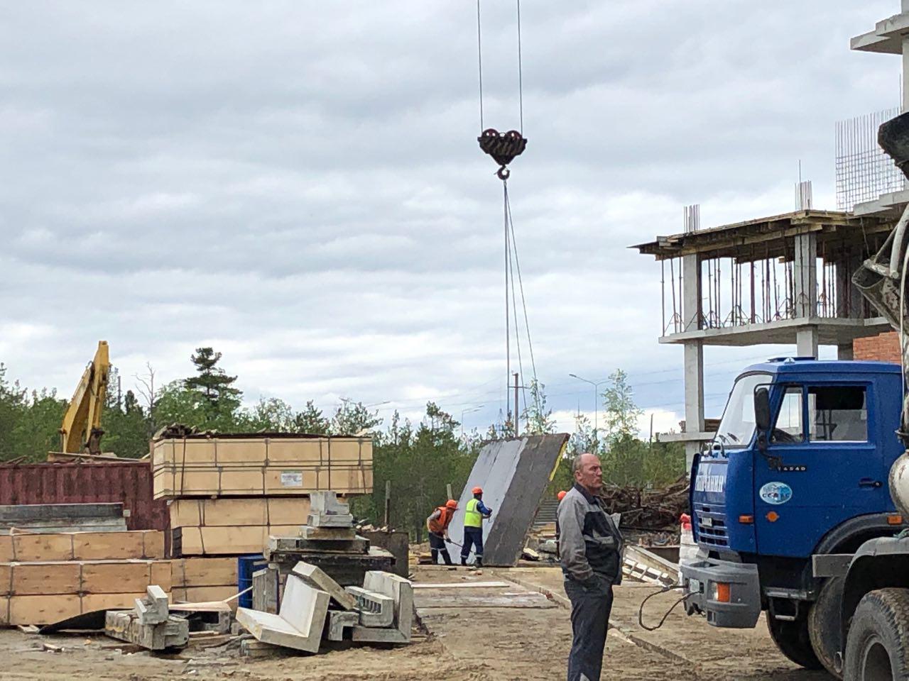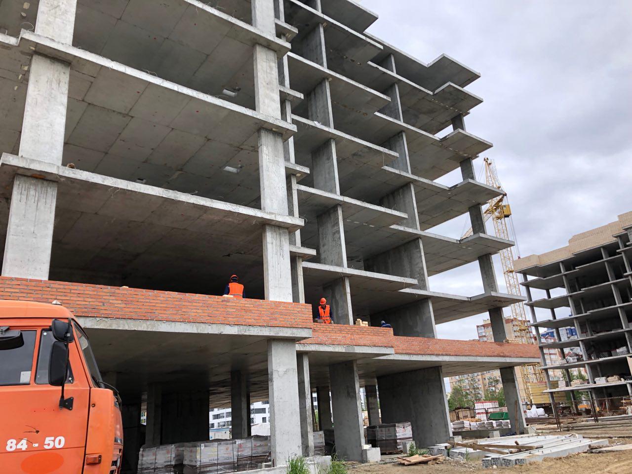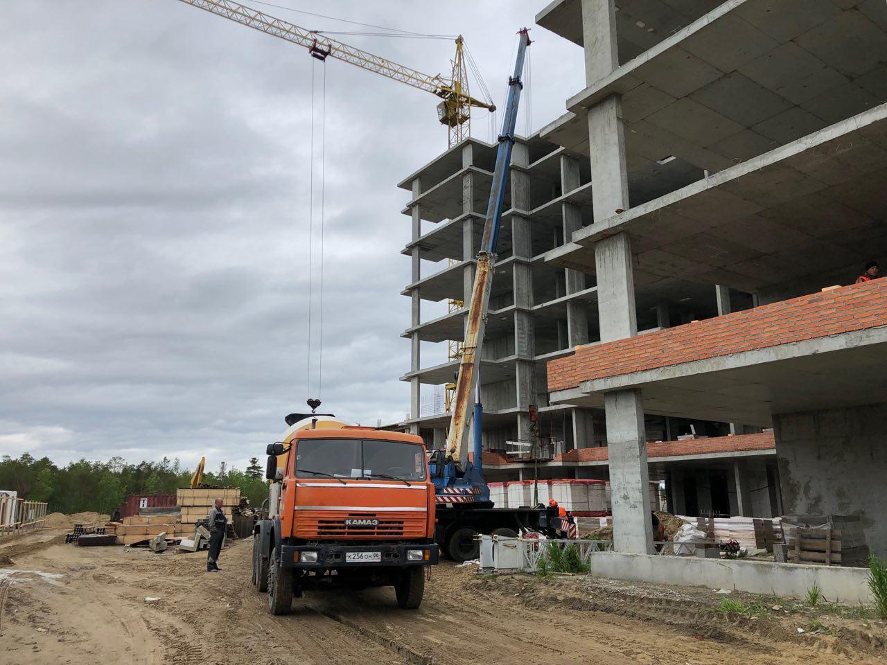 Каменщики в количестве 5-7 человек ведут кладку ограждающей конструкции 2 этажа из кирпича. Работает кран и автокран. Завозятся строительные материалы. Ведется подъем строительного материала.