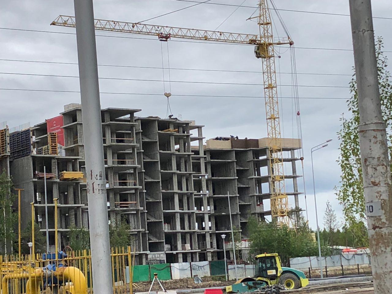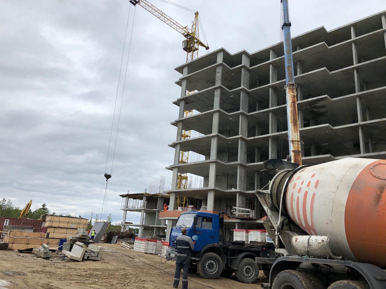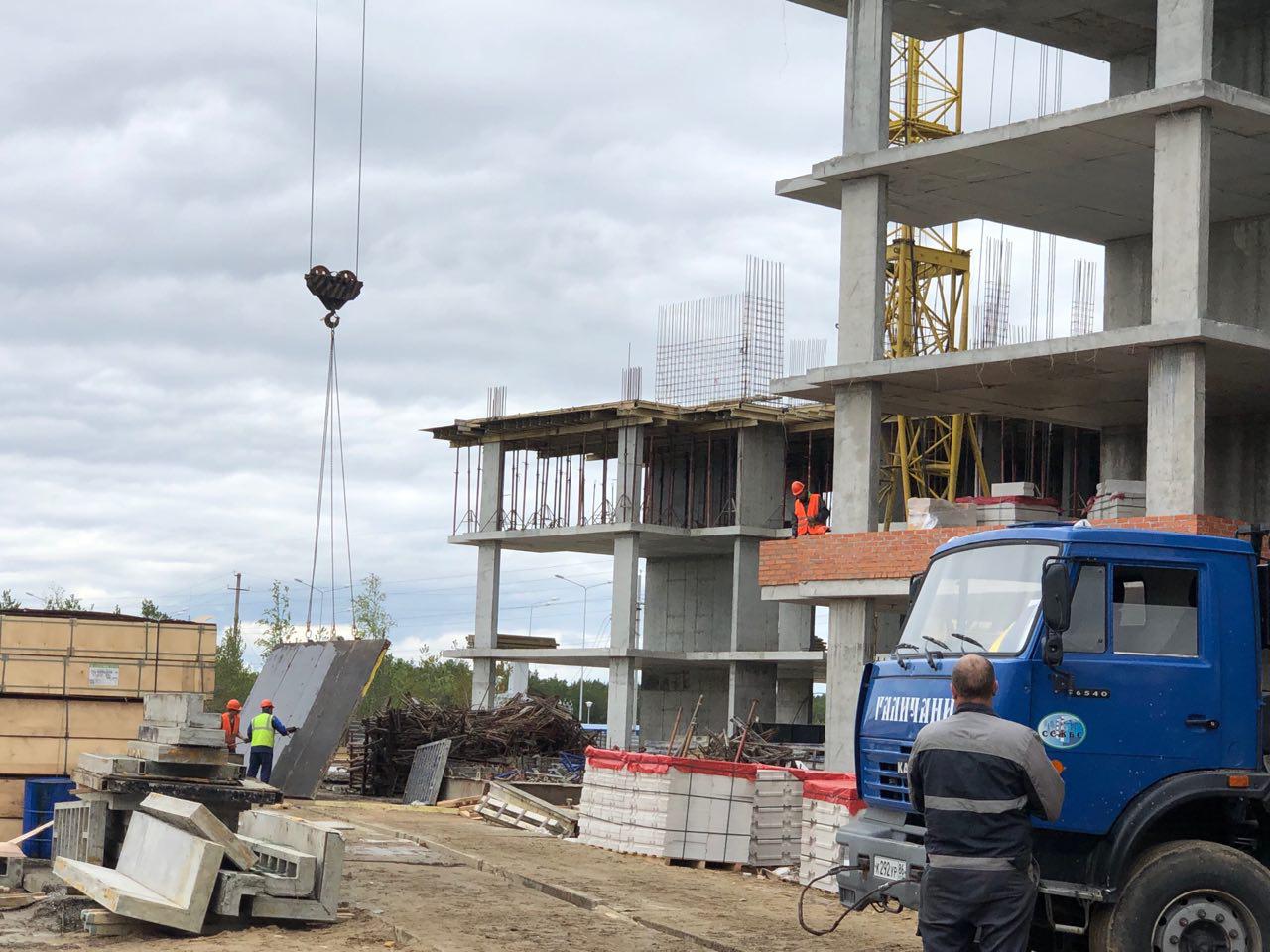 Каменщики в количестве 5-7 человек ведут кладку ограждающей конструкции 2 этажа из кирпича. Работает кран и автокран. Завозятся строительные материалы. Ведется подъем строительного материала.