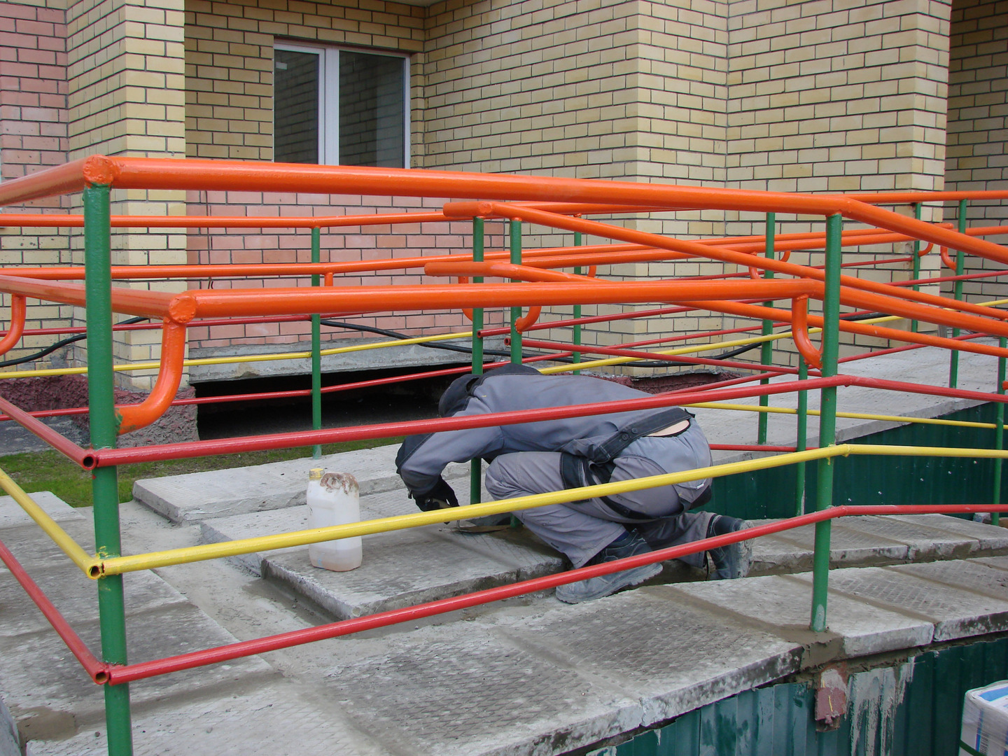 На крыльце здания 2 рабочих ведут работы по устройству пандуса.