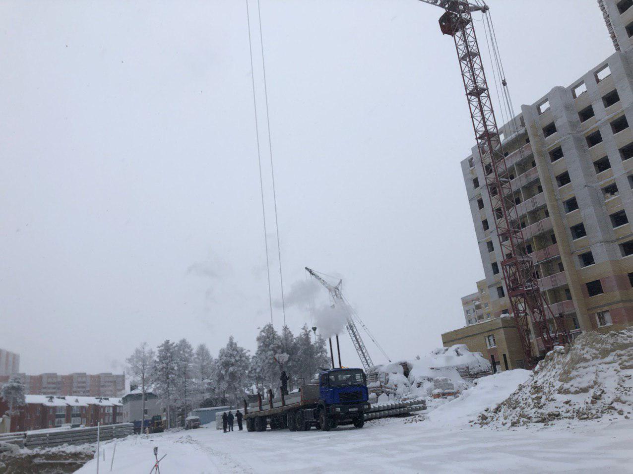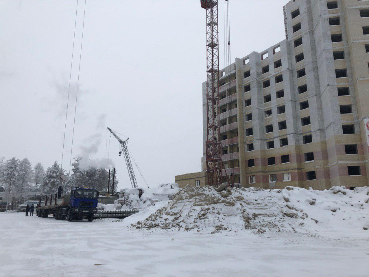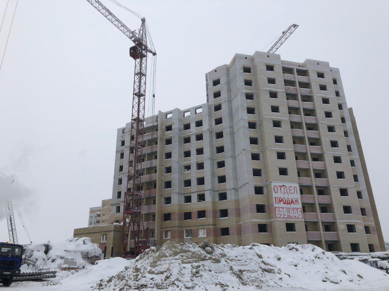 Ведется кладка ограждающих конструкций 10-го этажа 8 секции, а также 12 этажа 7 секции многоквартирного жилого дома. Работают краны, автотехника.