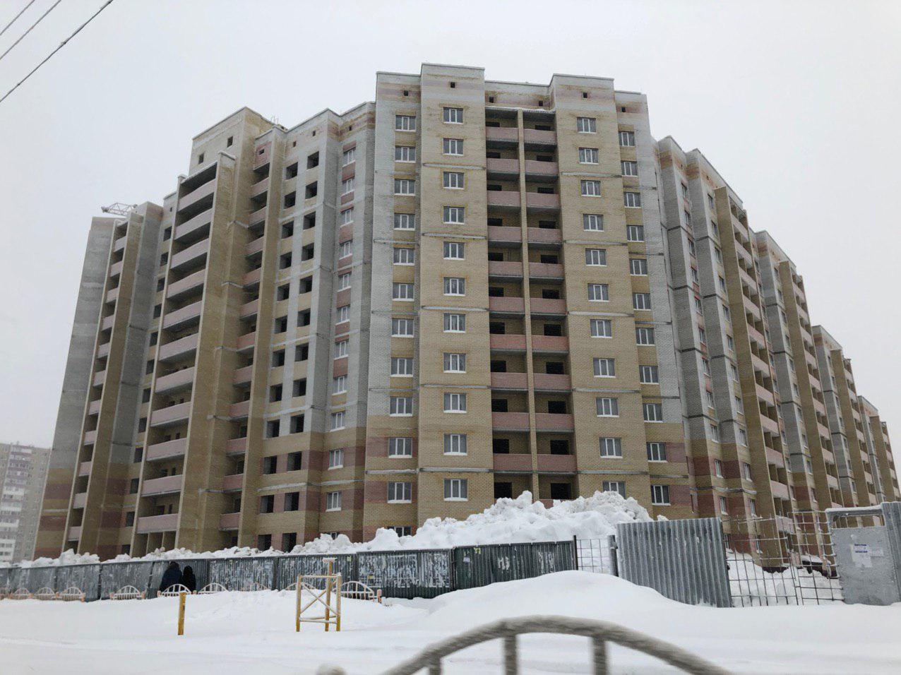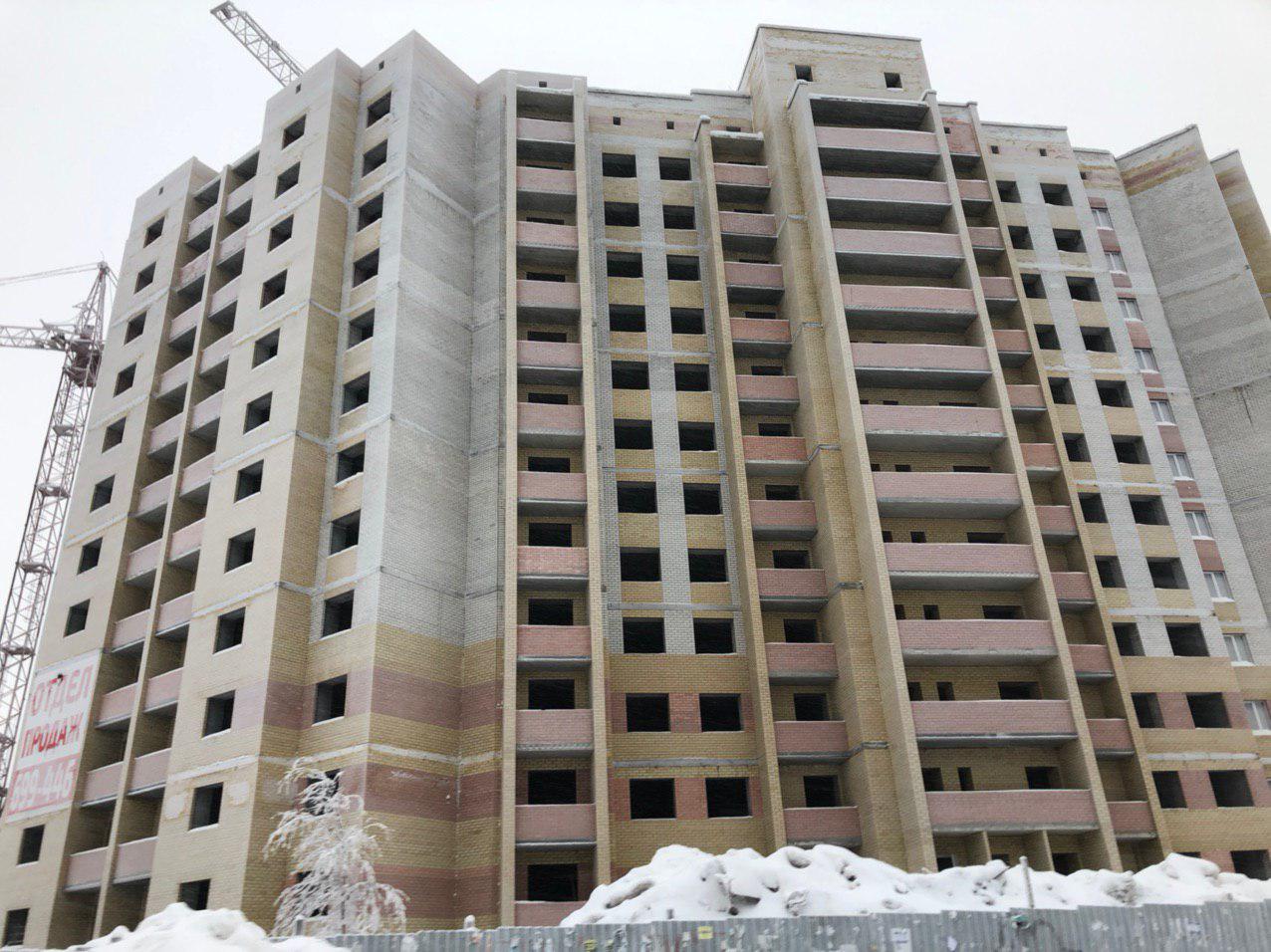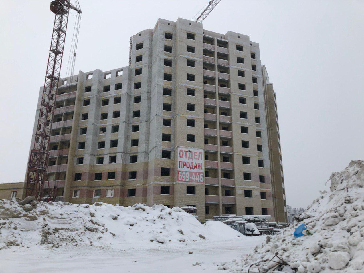 Ведется кладка ограждающих конструкций 10-го этажа 8 секции, а также 12 этажа 7 секции многоквартирного жилого дома. Работают краны, автотехника.