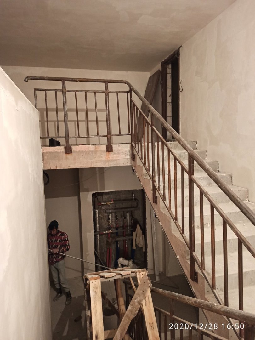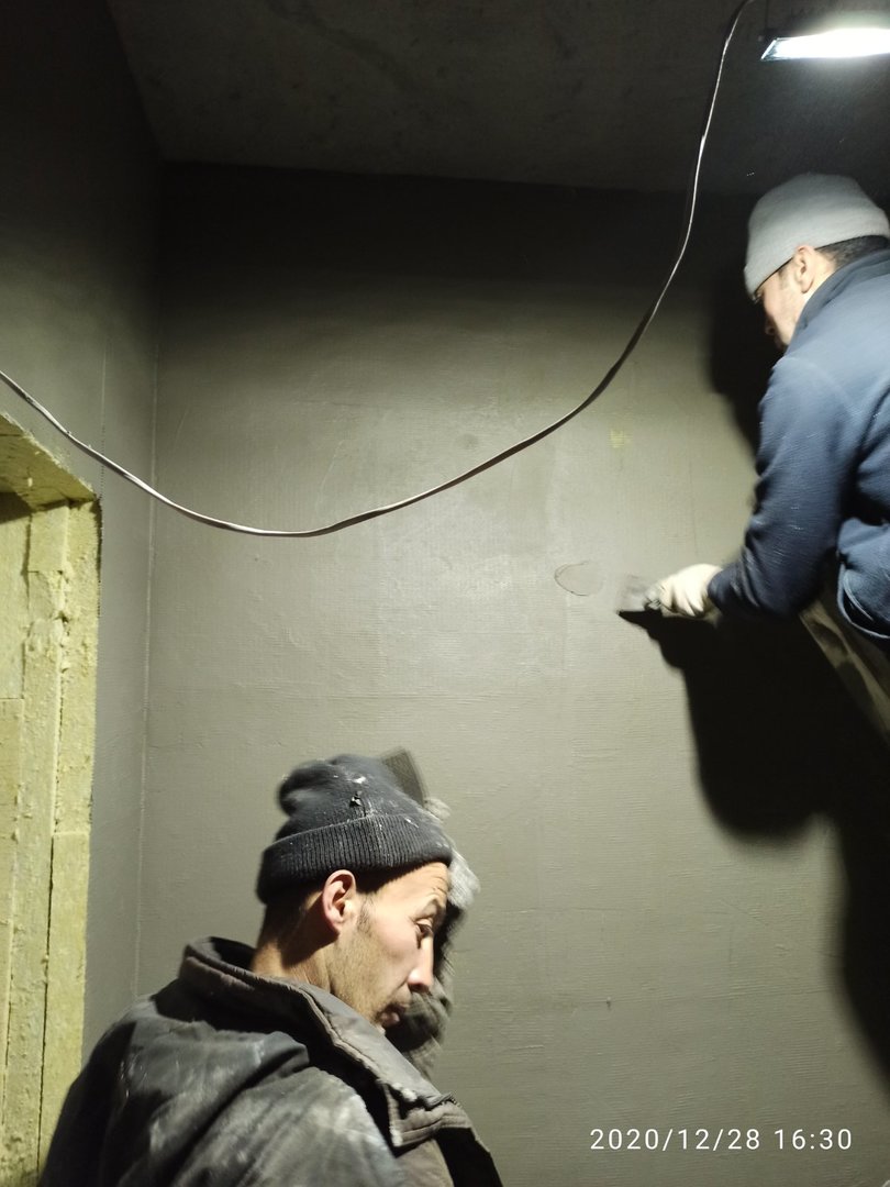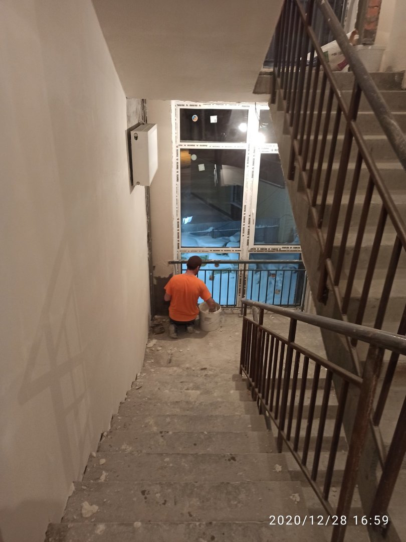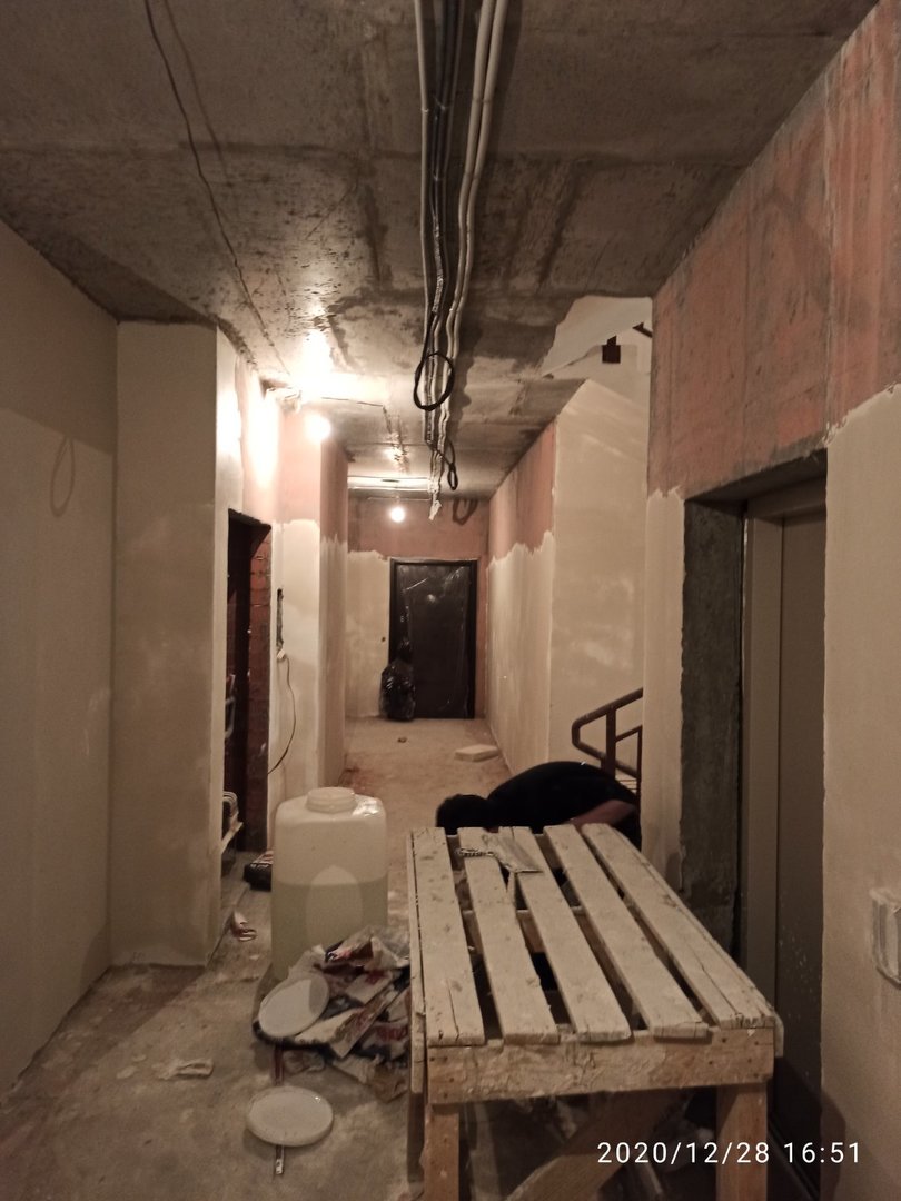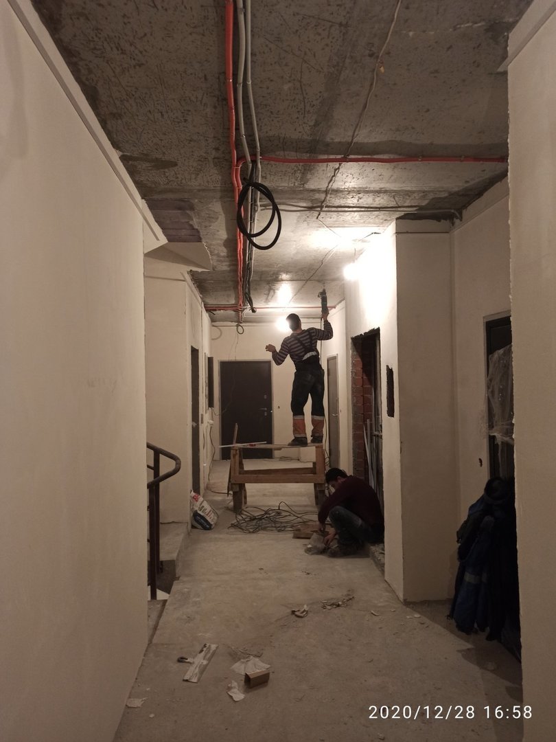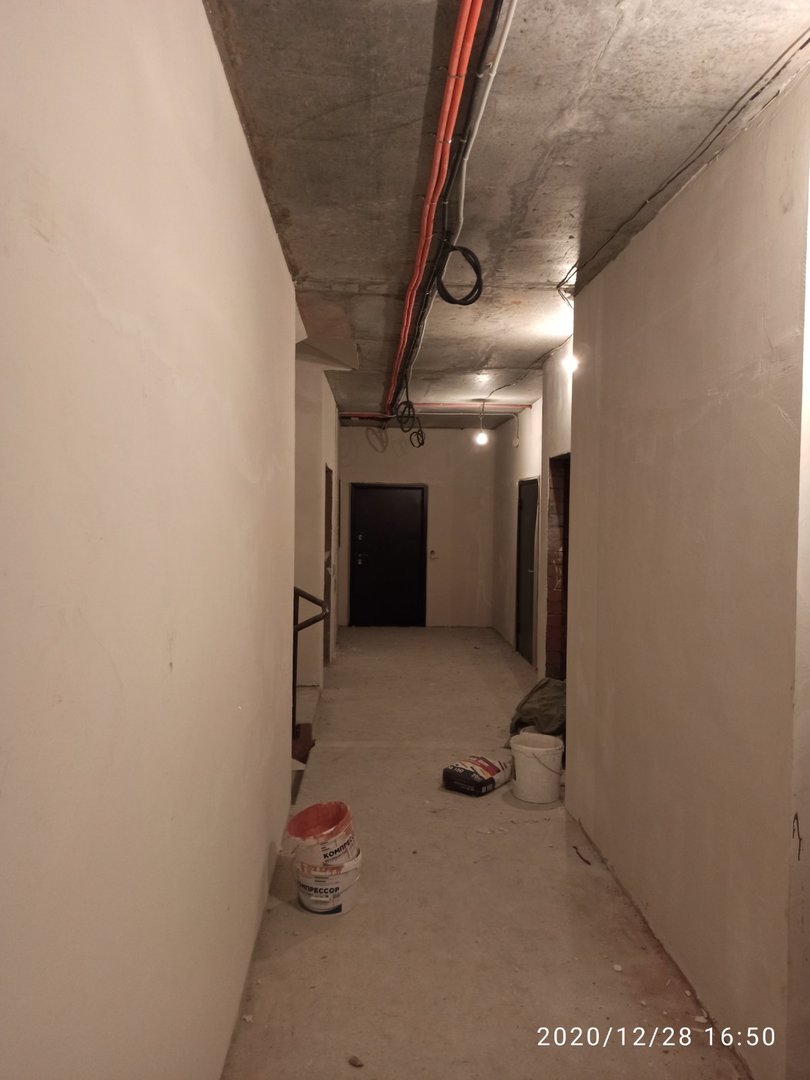 Ведутся отделочные работы в местах общего пользования (выравнивание стен базовыми составами, устройство подвесных потолков). Проводятся работы по установке металлических входных дверей в квартиры.