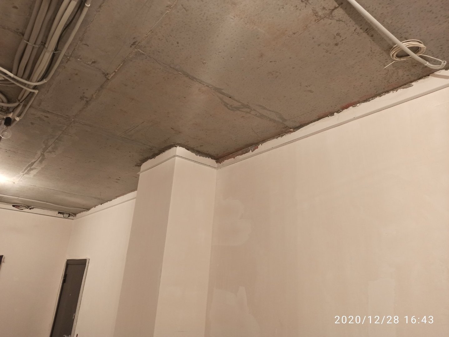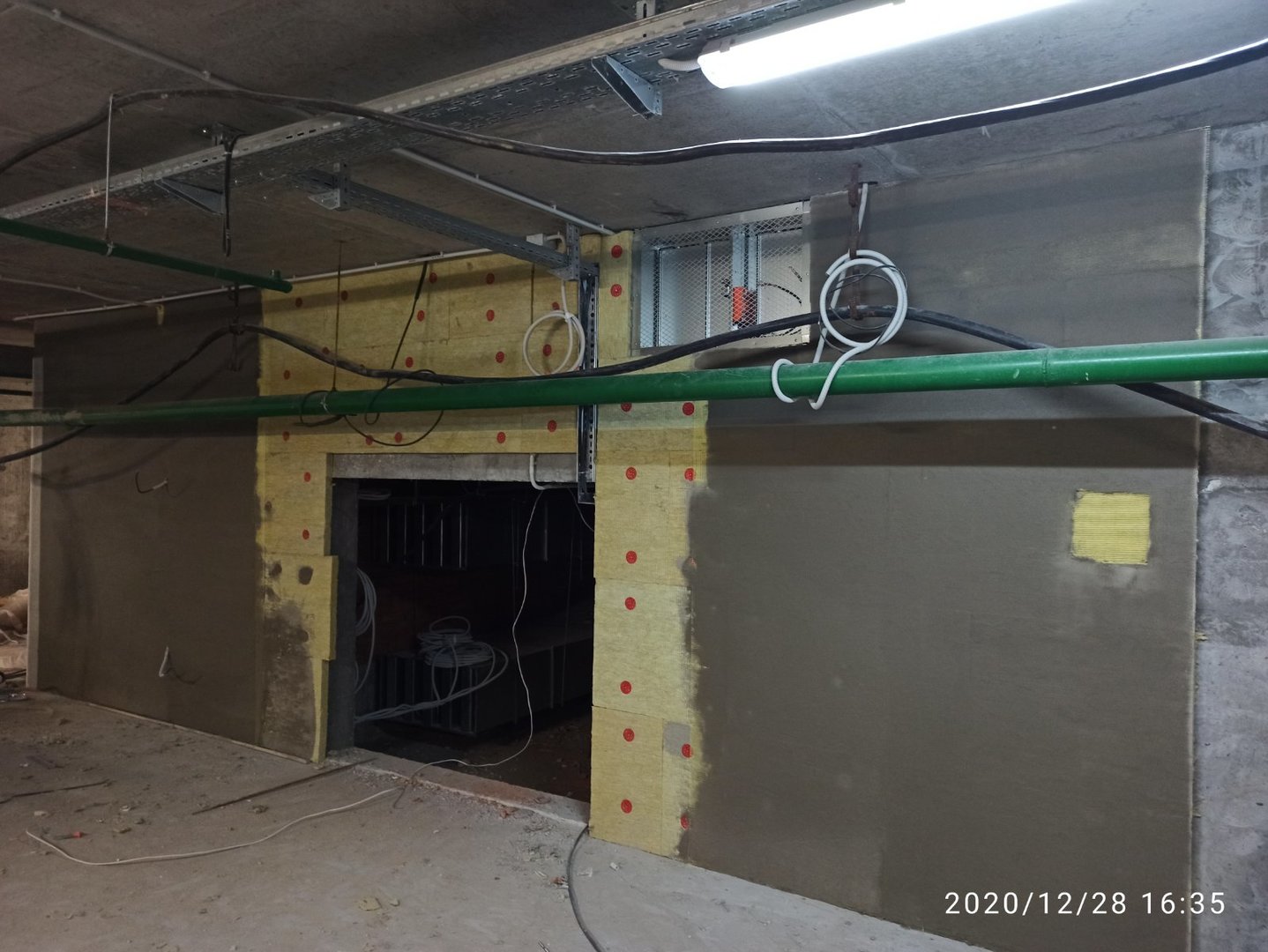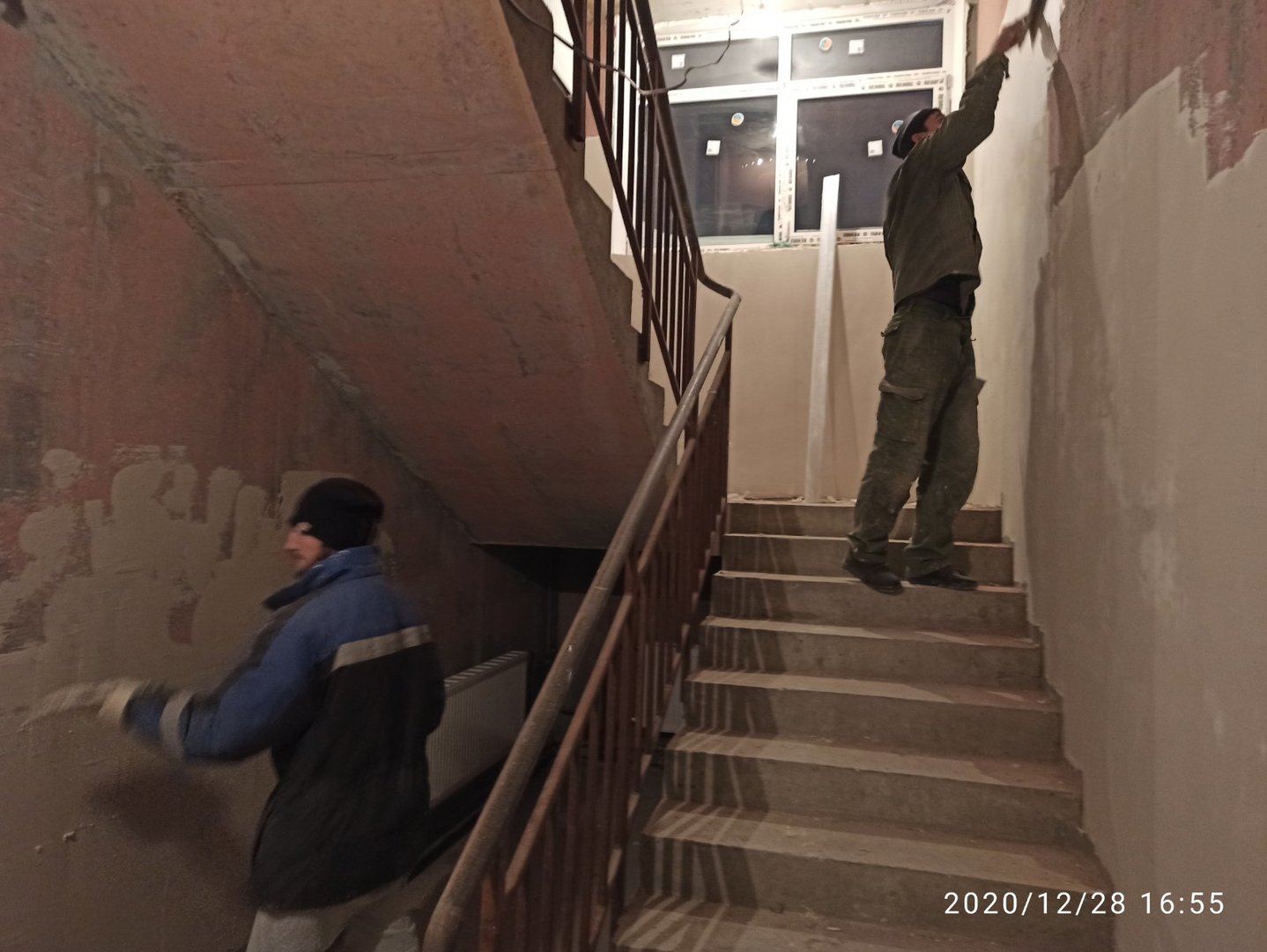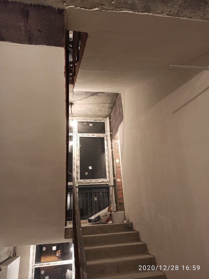 Ведутся отделочные работы в местах общего пользования (выравнивание стен базовыми составами, устройство подвесных потолков). Проводятся работы по установке металлических входных дверей в квартиры.