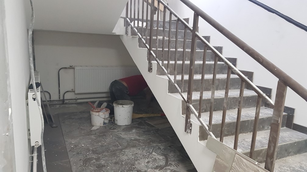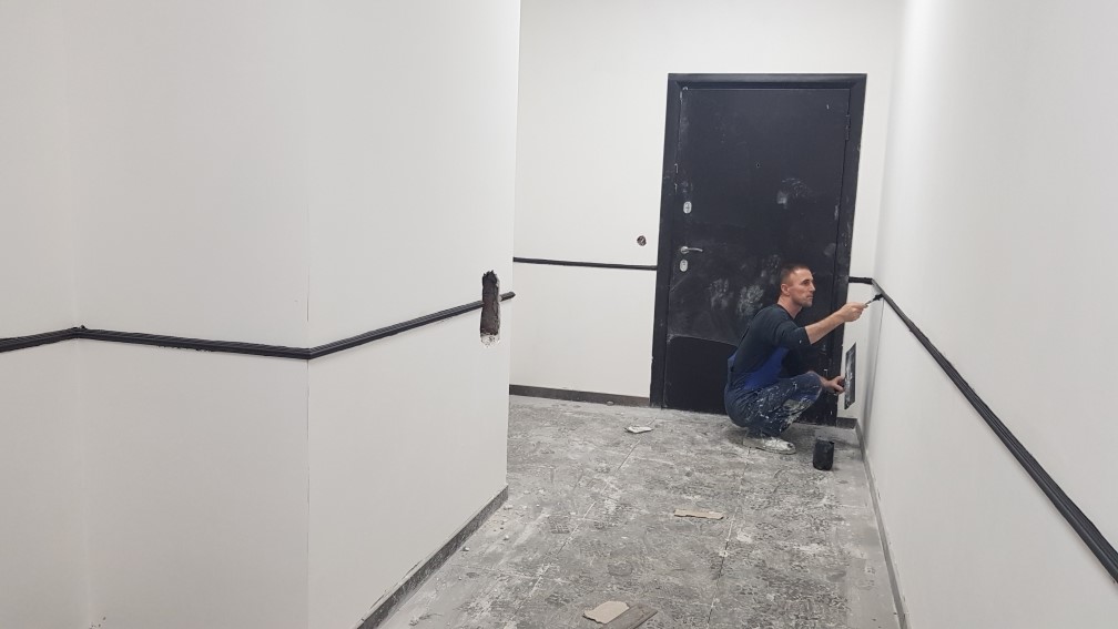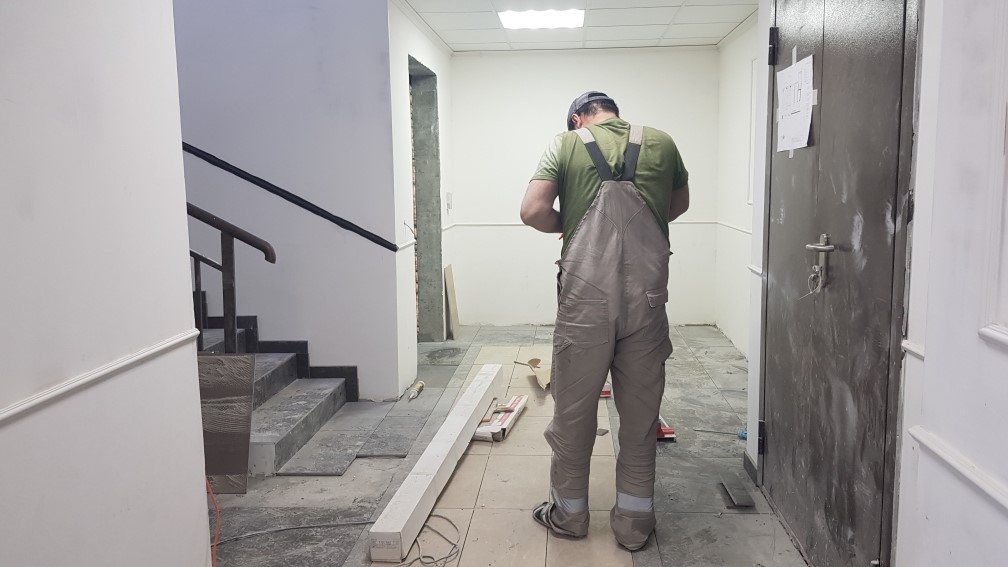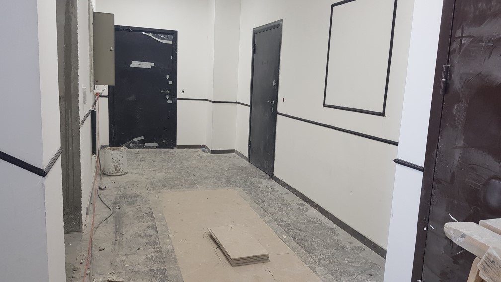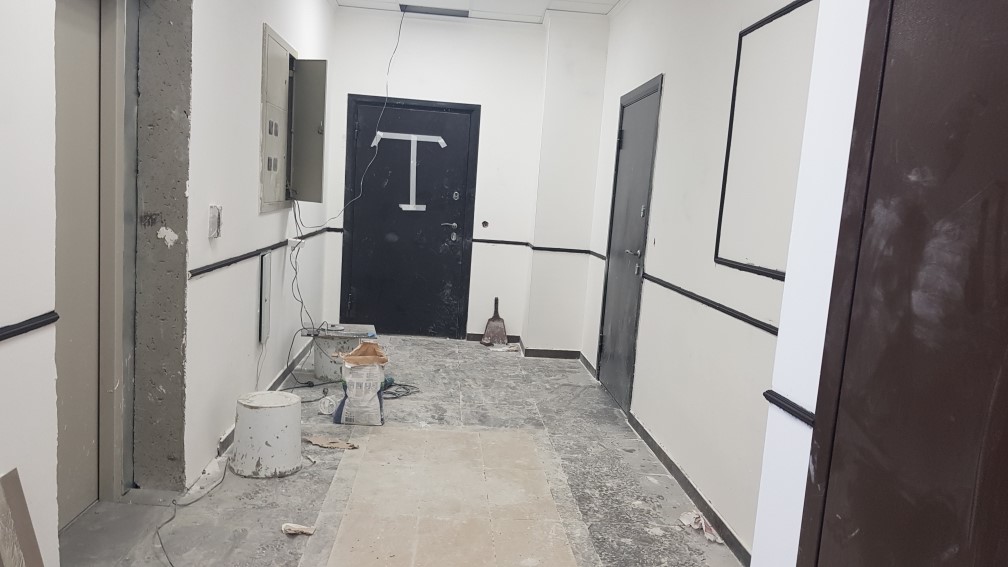 Ведутся отделочные работы в местах общего пользования (декоративная отделка стен, устройство подвесных потолков, укладка плитки).