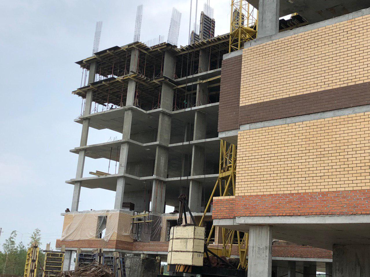 Каменщики в количестве 5-7 человек ведут кладку ограждающей конструкции 2 этажа из кирпича. Работает кран и автокран. Завозятся строительные материалы. Ведется подъем строительного материала.