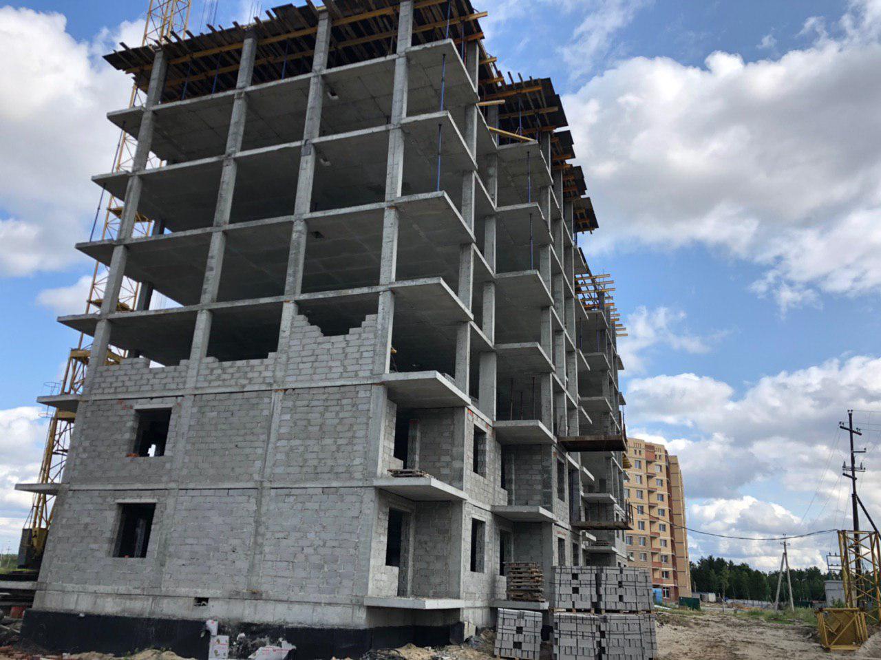 Проводится укладка ограждающих конструкций первого, второго, третьего этажа силами 2-4 человек, работает автокран, завозится строительный материал.