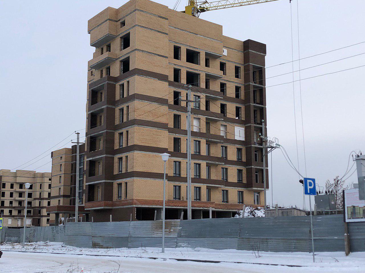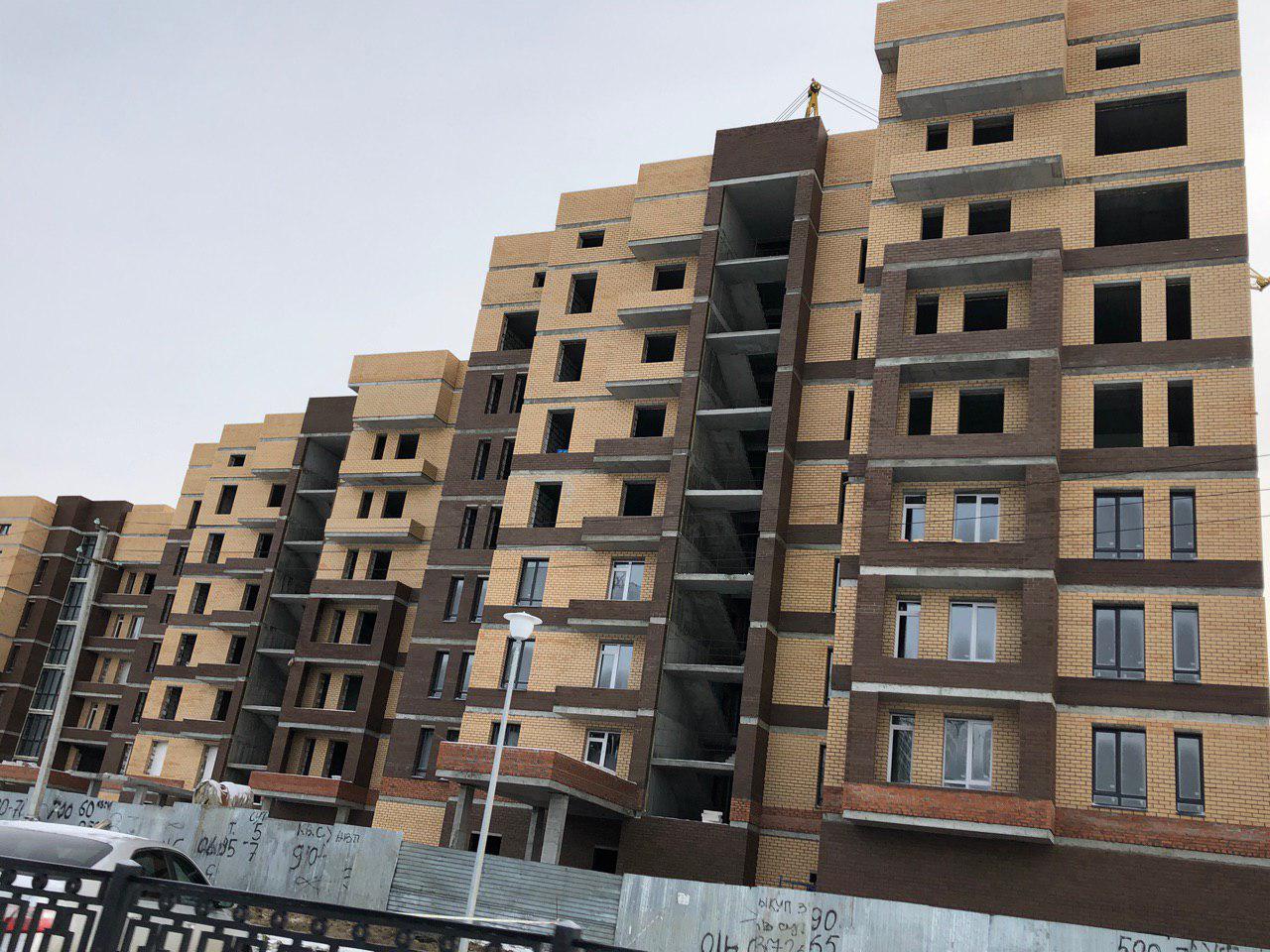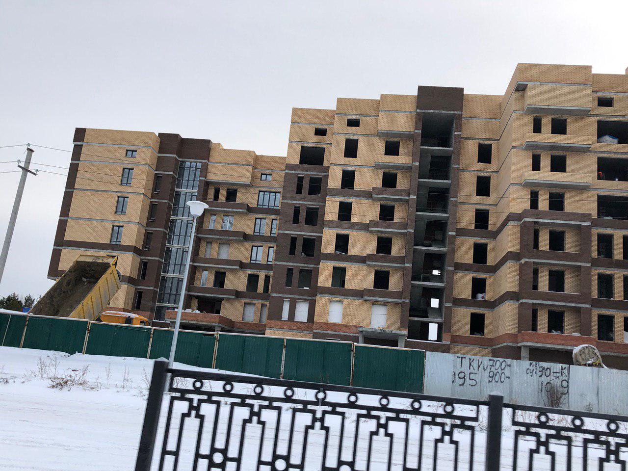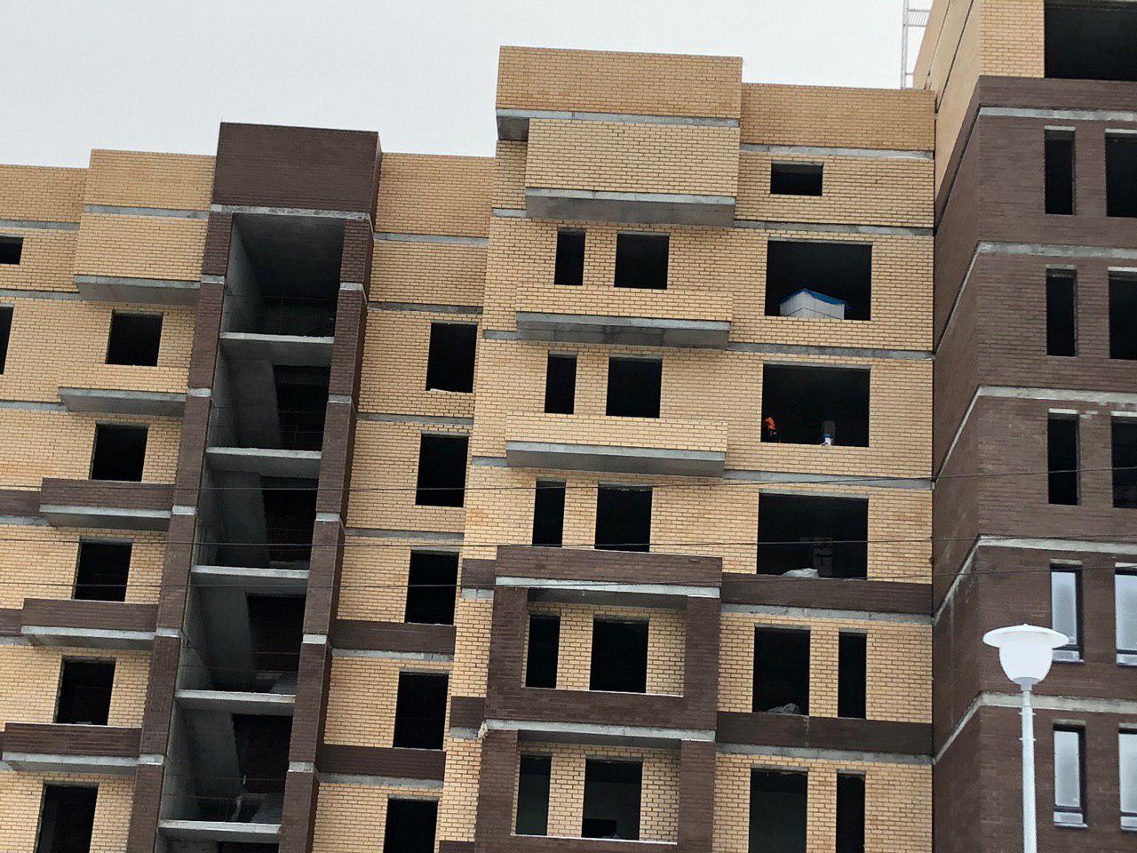 Работает кран, автокран, производится завоз и подъем строительного материала. Проводятся работы по остеклению оконных проемов.