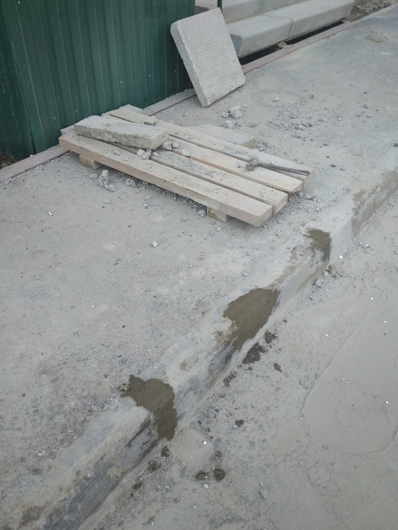 На внутренних проездах рабочий ведет работы по благоустройству бордюра.