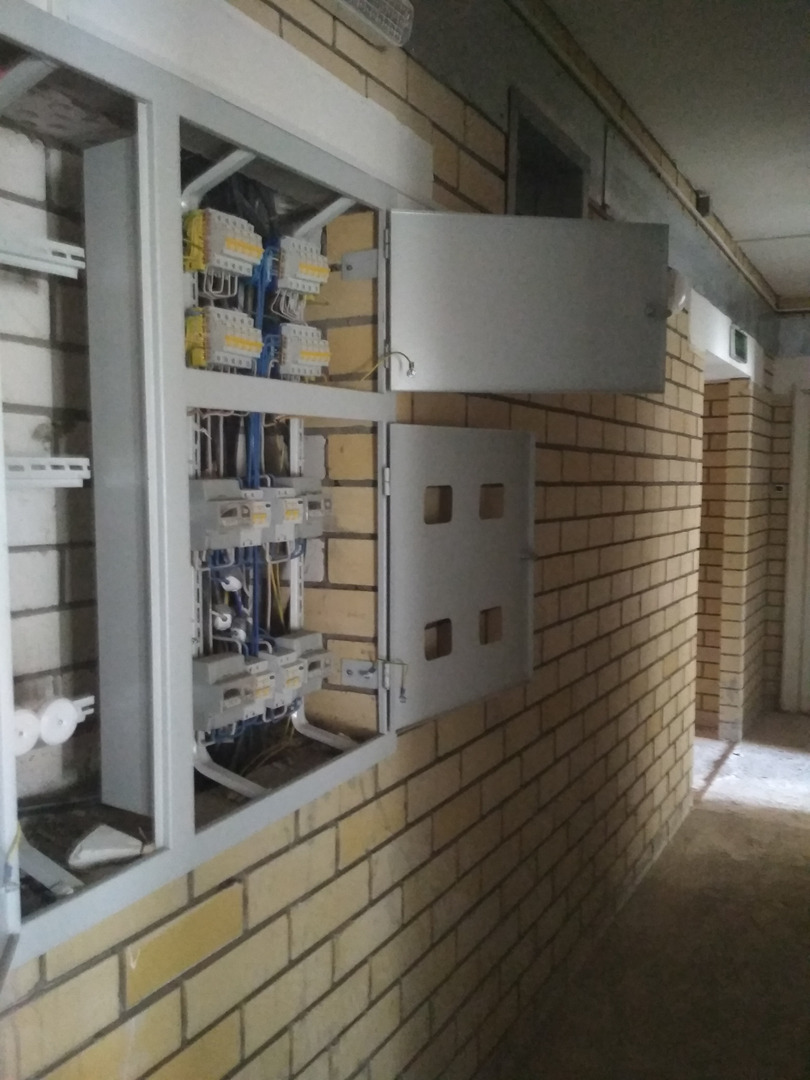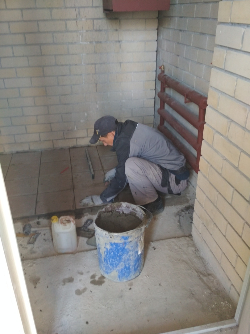 В третьем подъезде ведутся работы по кладке плитки в помещении мусоропровода, подъезда. Электрики проводят пусконаладочные работы освещения. 2 штукатура-маляра производят отделочные работы на лестничной клетке.