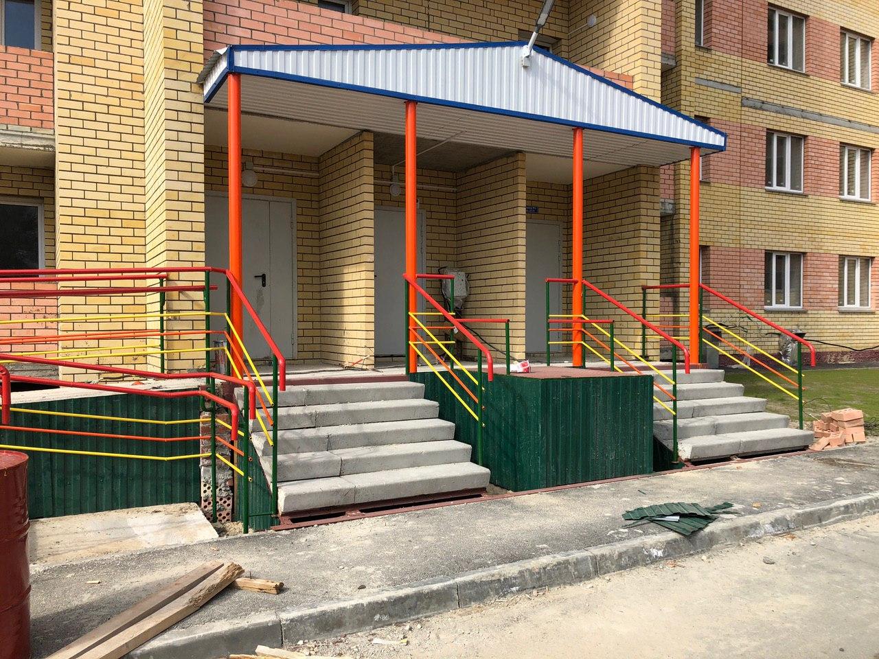 В четвертом подъезде ведутся работы с применением перфоратора, дверь открыта. На крыльце 1 рабочий готовит цементный раствор. Частично произведена укладка тротуарной плитки на крыльце.