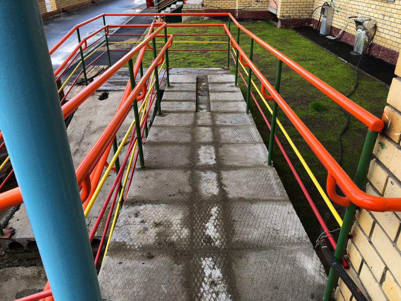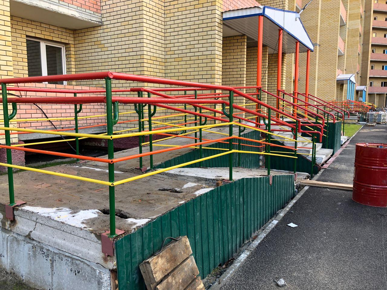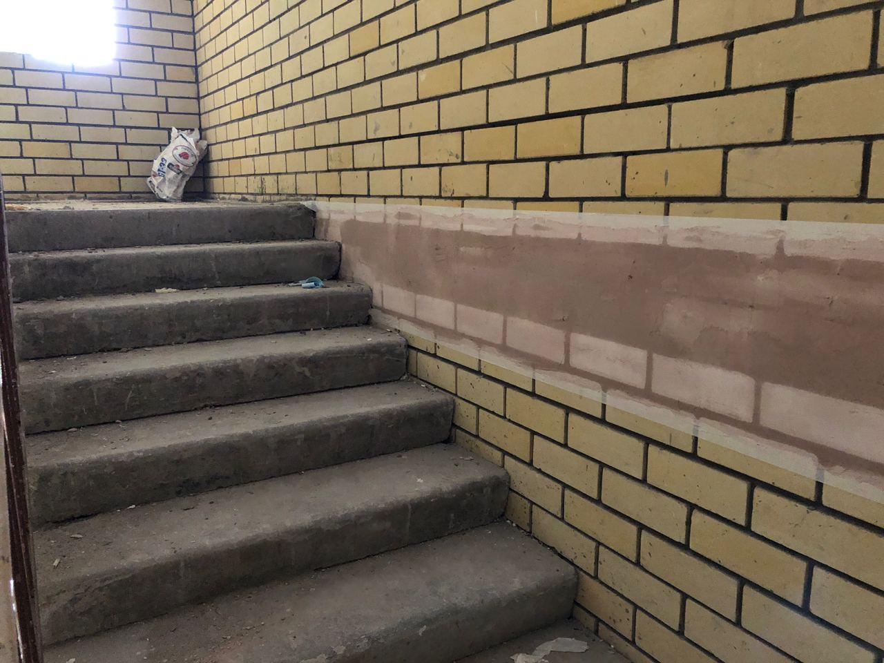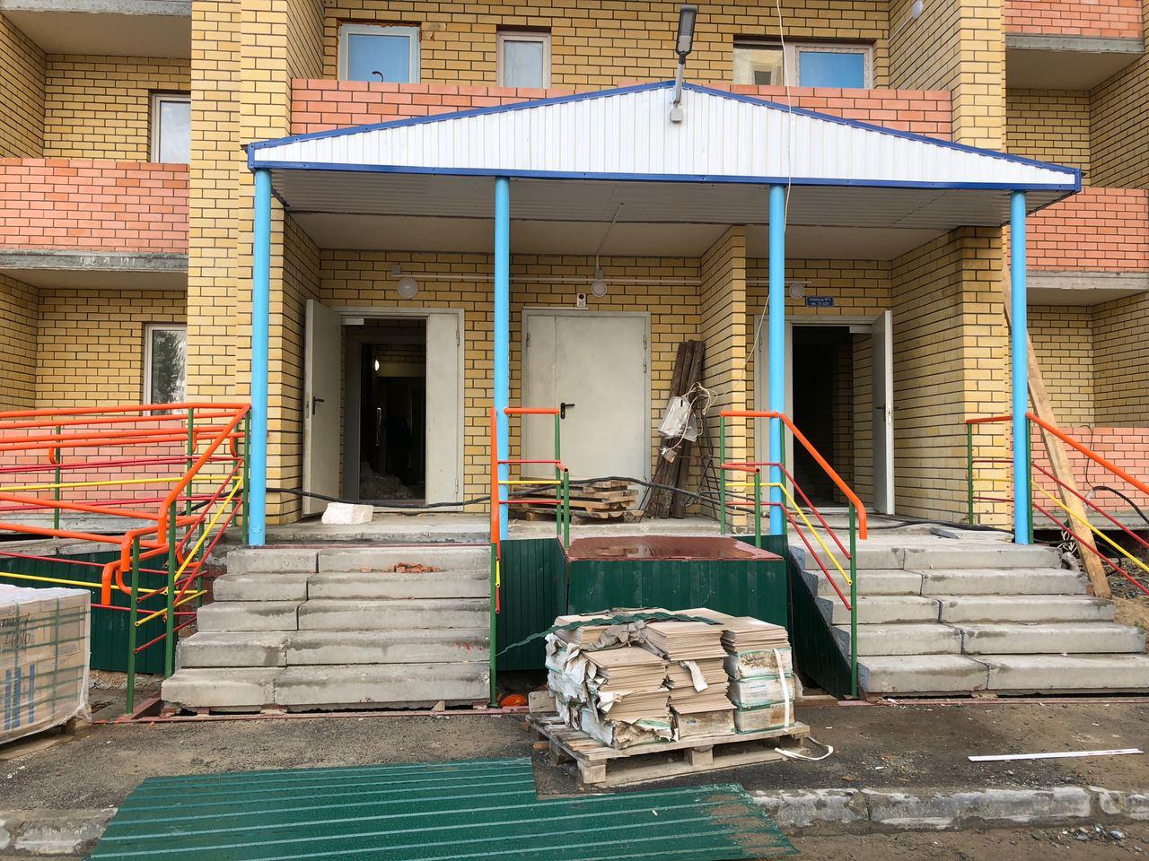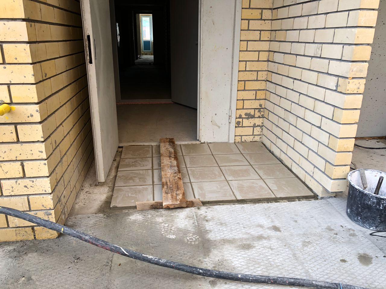 В четвертом подъезде работы не ведутся, двери открыты. На крыльце 2 рабочих ведут укладку напольной плитки.