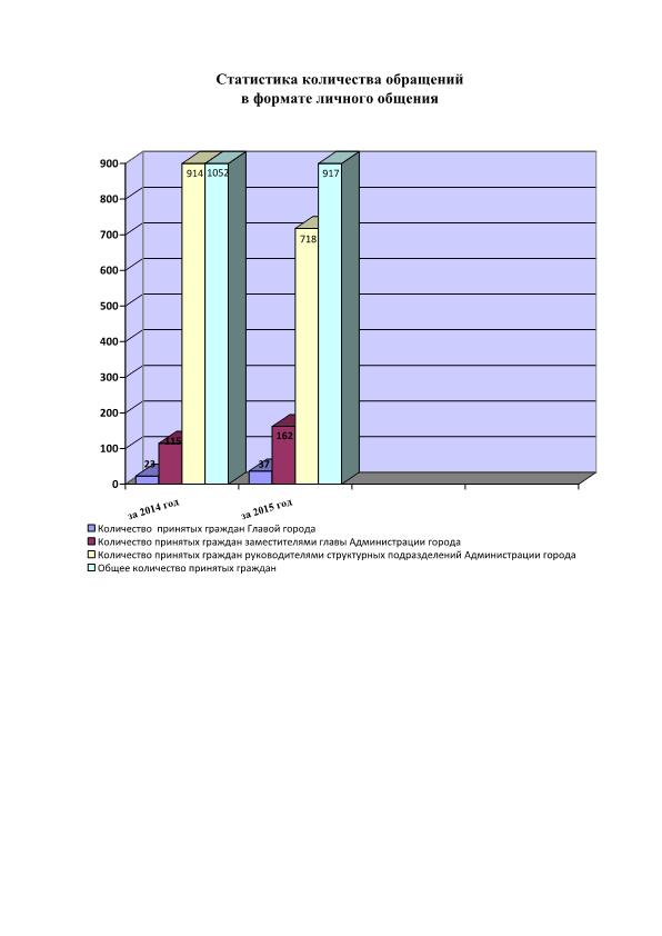 Проведено приемов граждан по личным вопросам Главой города в 2015 году 17, принято – 37 человек, увеличение на 21% количества приемов, и на 60% количества принятых граждан в сравнении с отчетным периодом 2014 года (14 приемов, 23 человека).