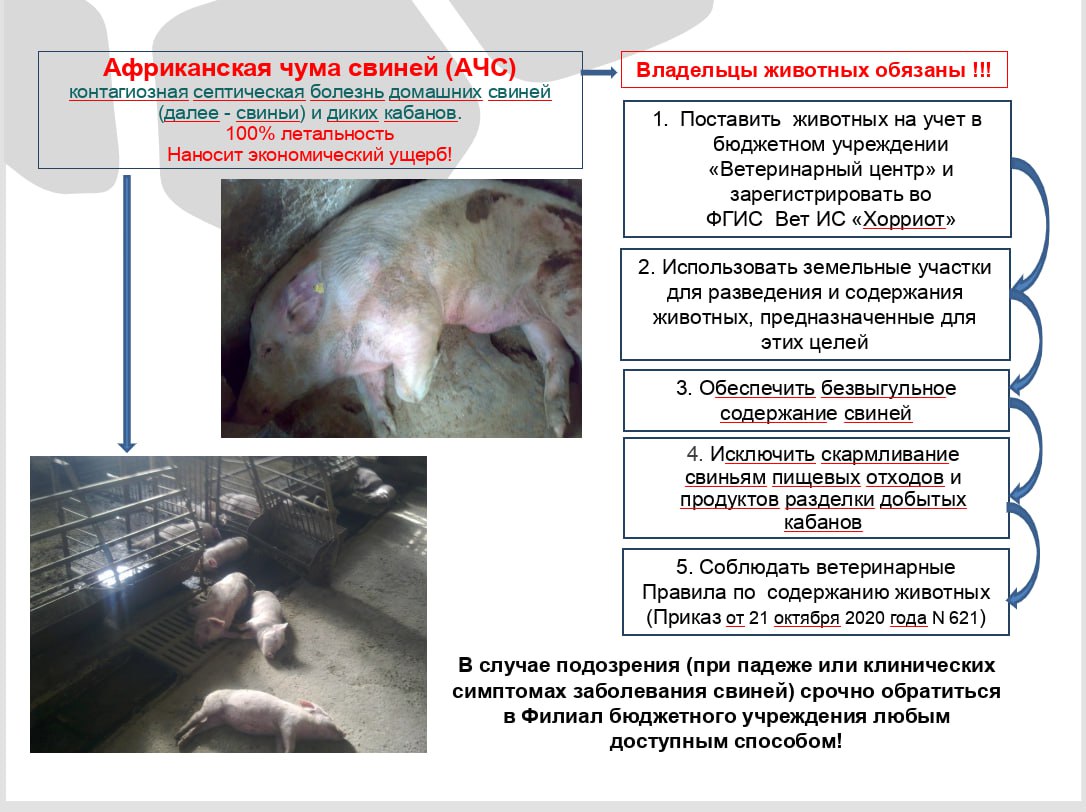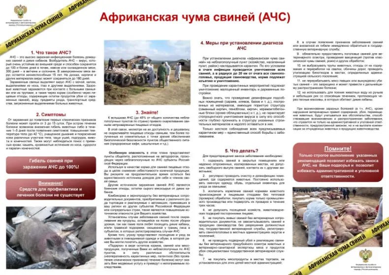 Напоминаем Вам о мерах профилактики вируса африканской чумы свиней. Это высоко заразная инфекционная болезнь домашних свиней и диких кабанов.