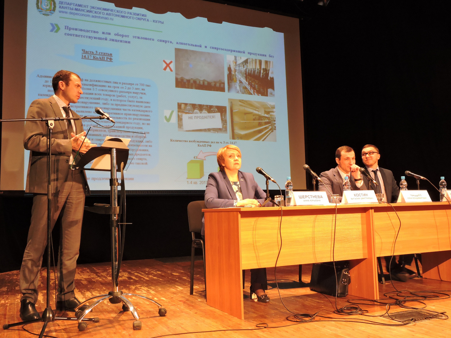 В рамках визита, на площадке Сургутской филармонии, было проведено публичное мероприятие по вопросам правоприменительной практики в контрольно-надзорной деятельности в сфере производства и оборота этилового спирта, алкогольной и спиртосодержащей продукции.