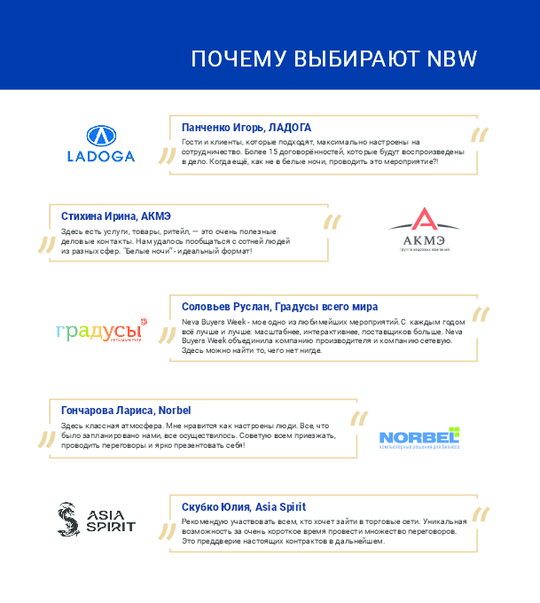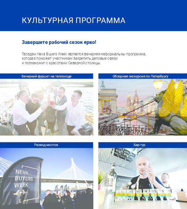 Немаловажной особенностью NEVA BUYERS WEEK является место и время проведения выставки. Мероприятие пройдет в красивейшем городе России в период «белых ночей». Для региональных делегаций в программе предусмотрены заседания и сессии на теплоходах и культурная программа.