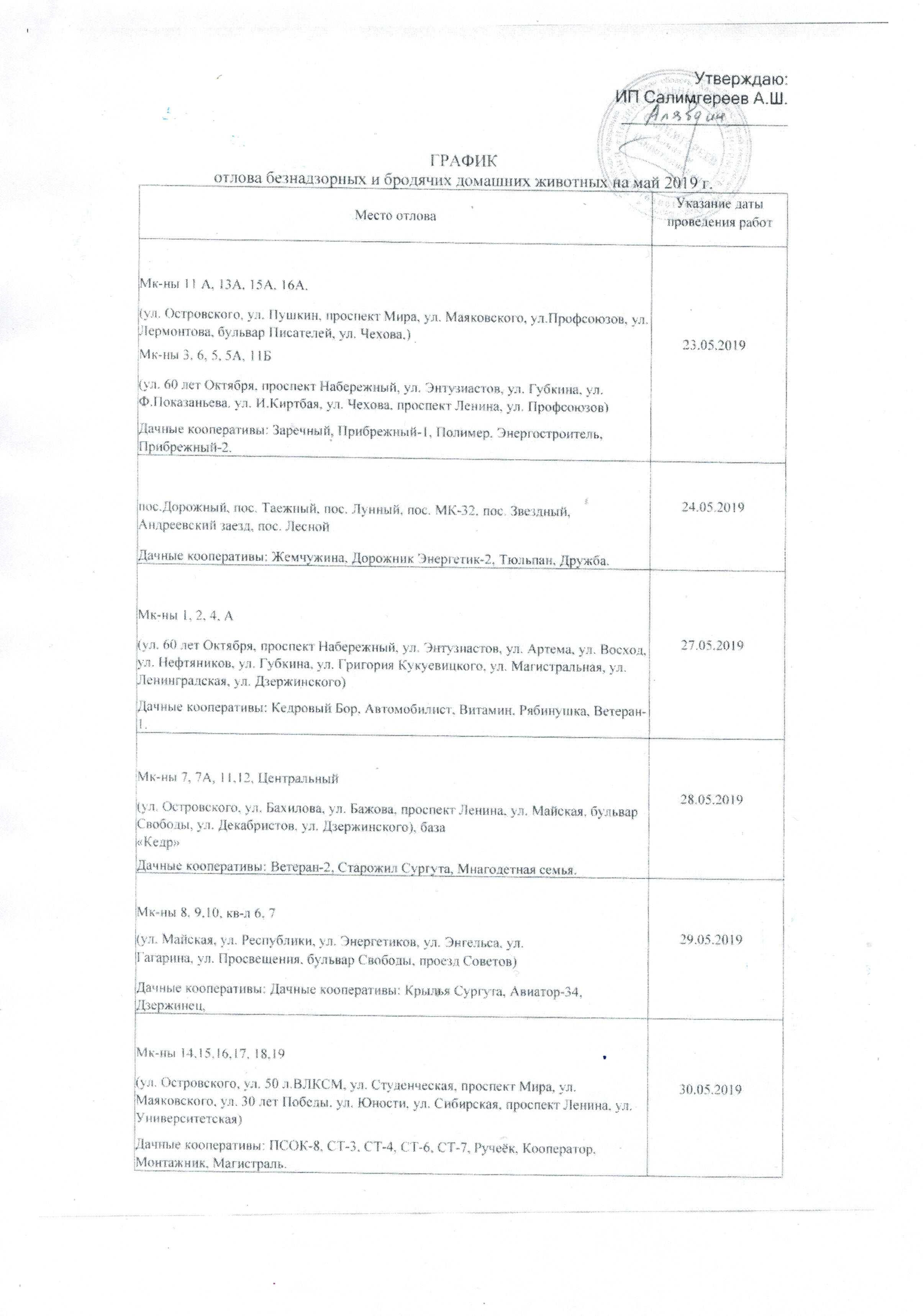 27 мая 2019 График отлова безнадзорных и бродячих домашних животных на Май 2019 г.