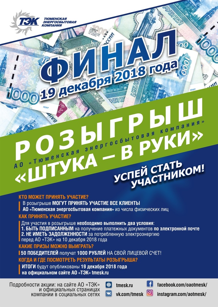 Получать платежные документы от АО «Тюменская энергосбытовая компания» на электронный почтовый ящик сегодня не только удобно, но и выгодно! В декабре 2018 года 50 клиентам компании, помимо онлайн-квитанции, придут и денежные призы розыгрыша «Штука — в руки», который проходит среди физических лиц, пользующихся услугами АО «ТЭК».